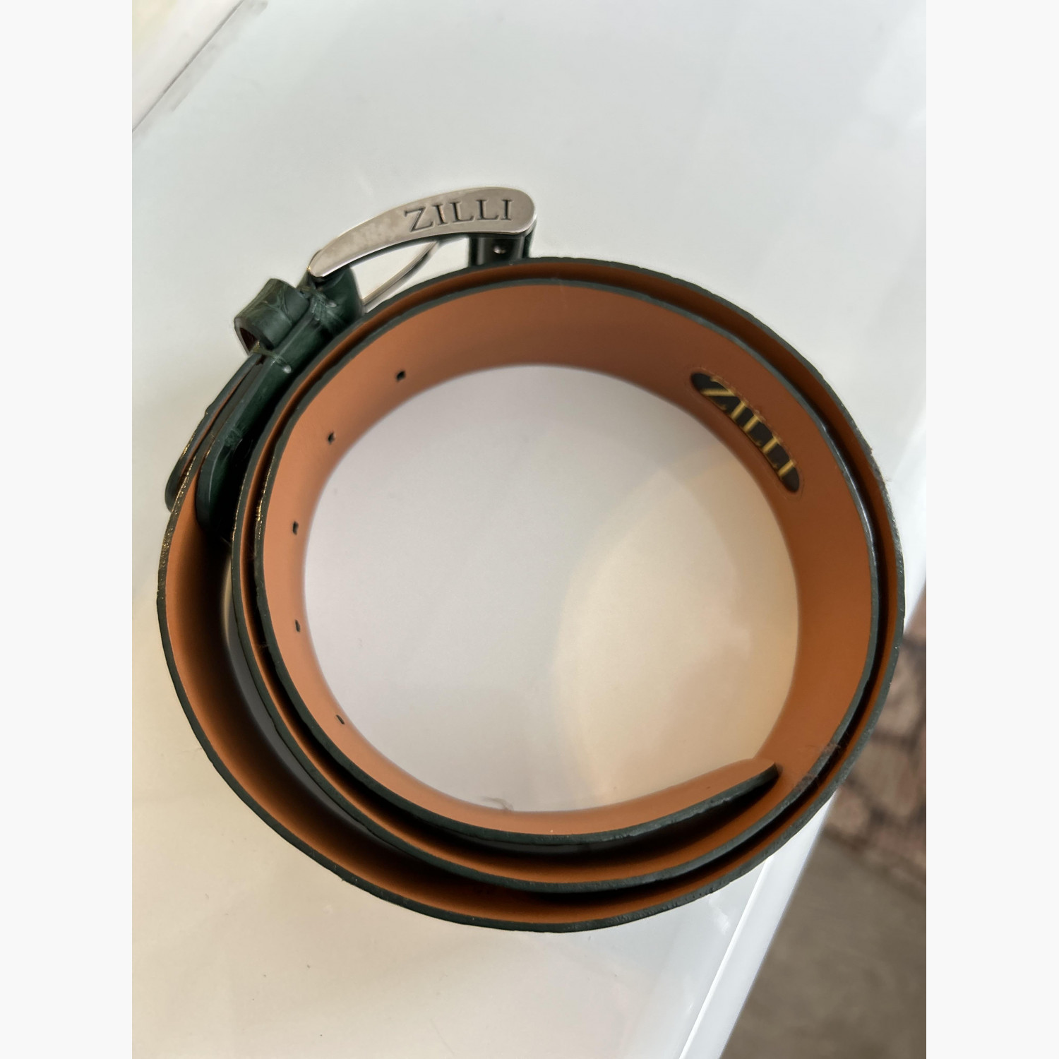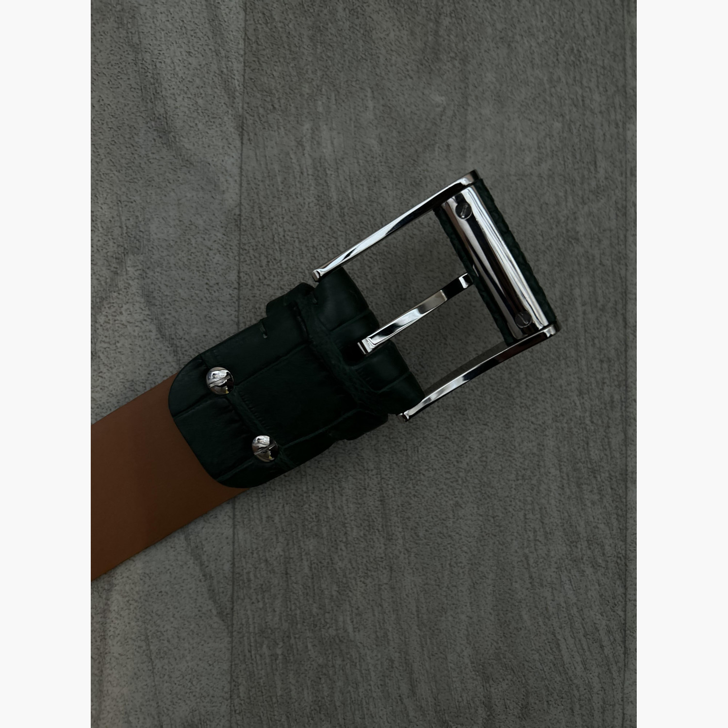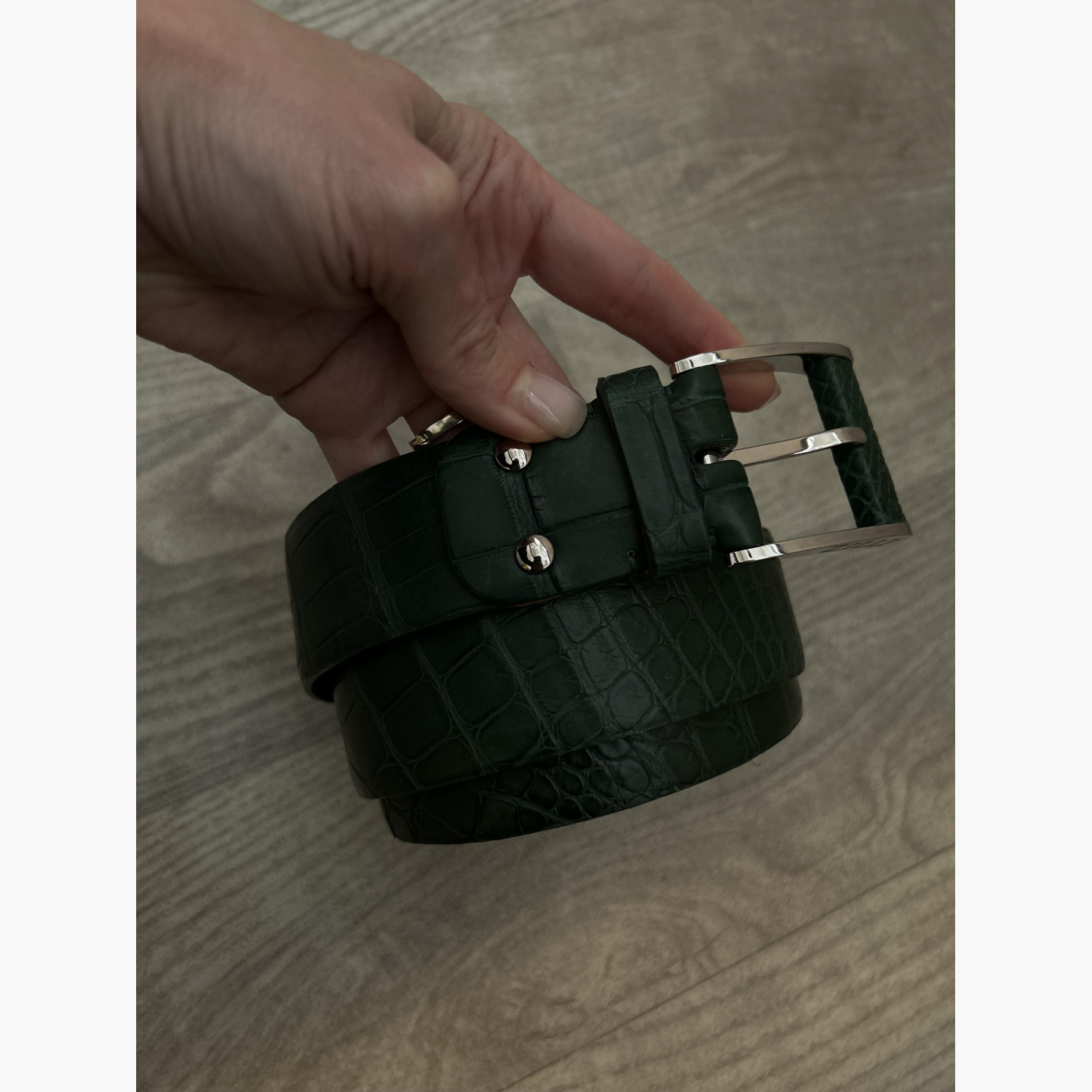 Тёмно-зелёный ремень из кожи крокодила в идеальном состоянии. Ширина ремня — 3.5 см, ширина пряжки — 4.5 см.