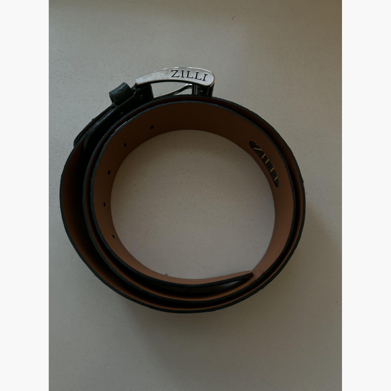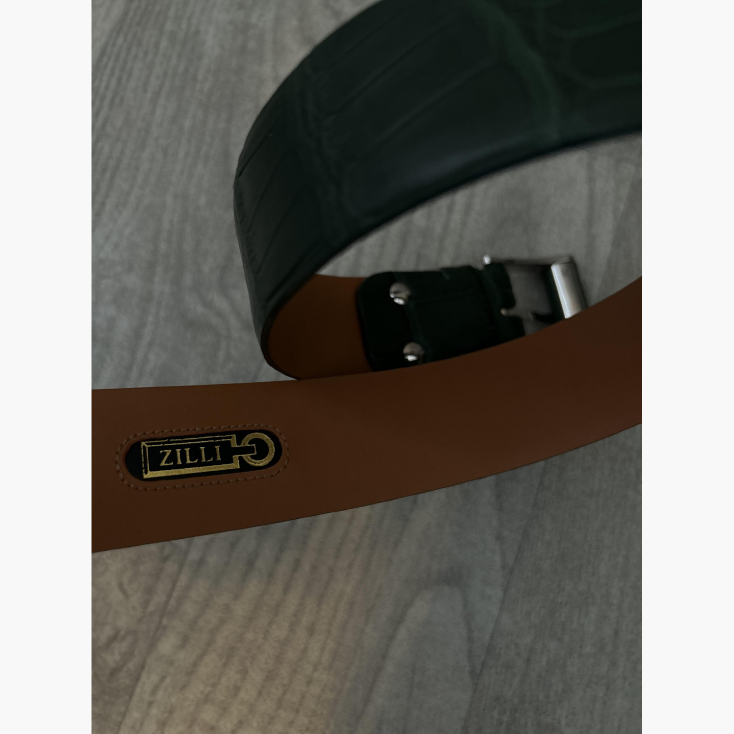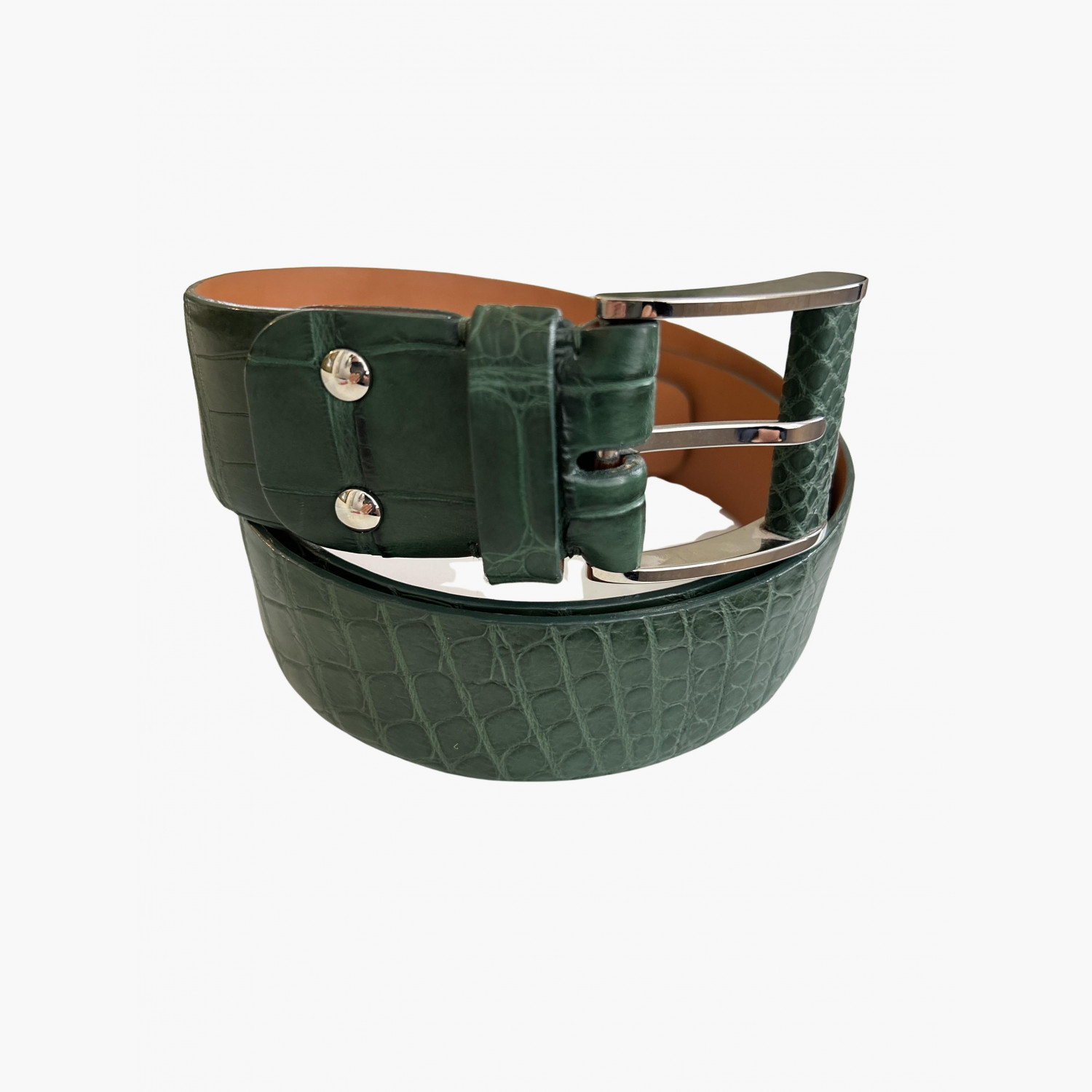 Тёмно-зелёный ремень из кожи крокодила в идеальном состоянии. Ширина ремня — 3.5 см, ширина пряжки — 4.5 см.
