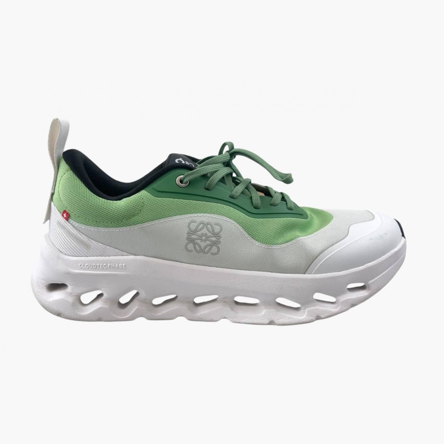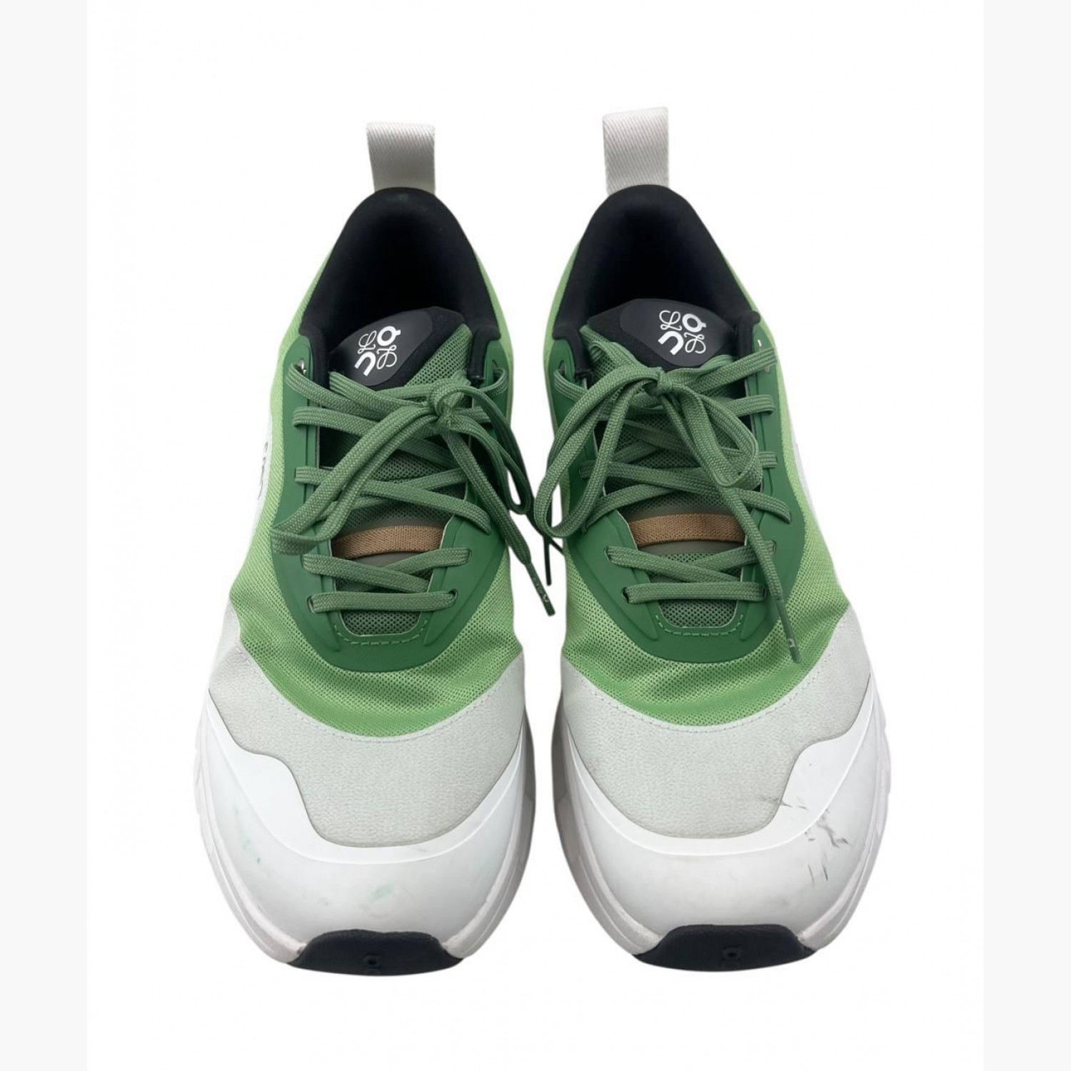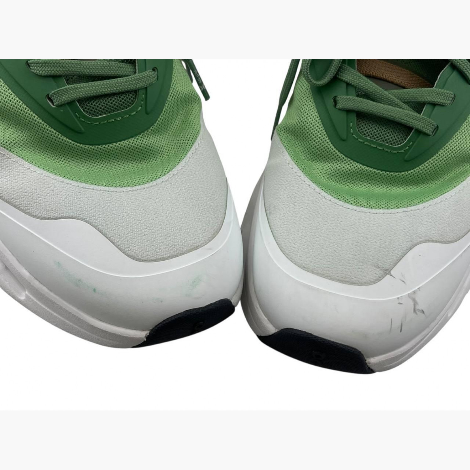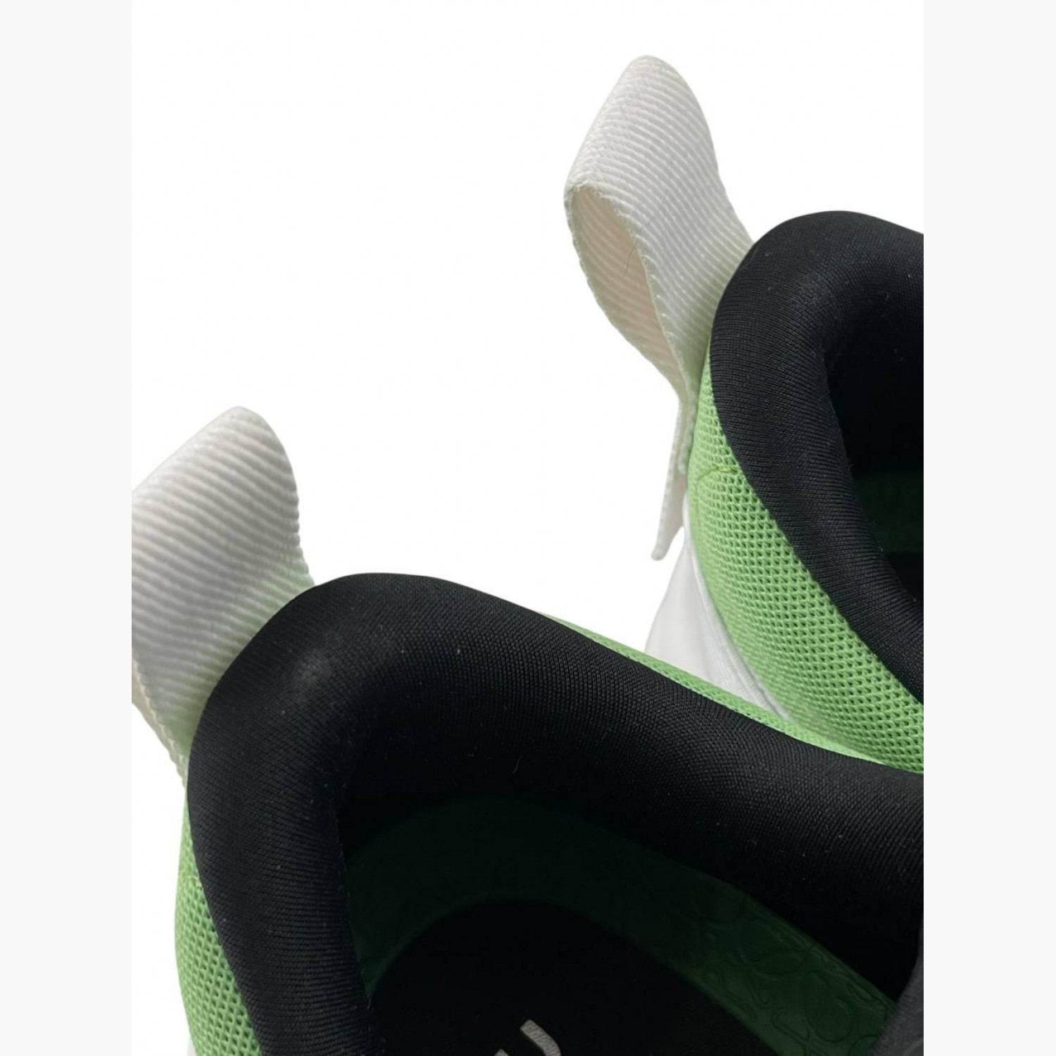 Спортивные кроссовки с зелеными текстильными вставками. В хорошем состоянии, есть следы носки.