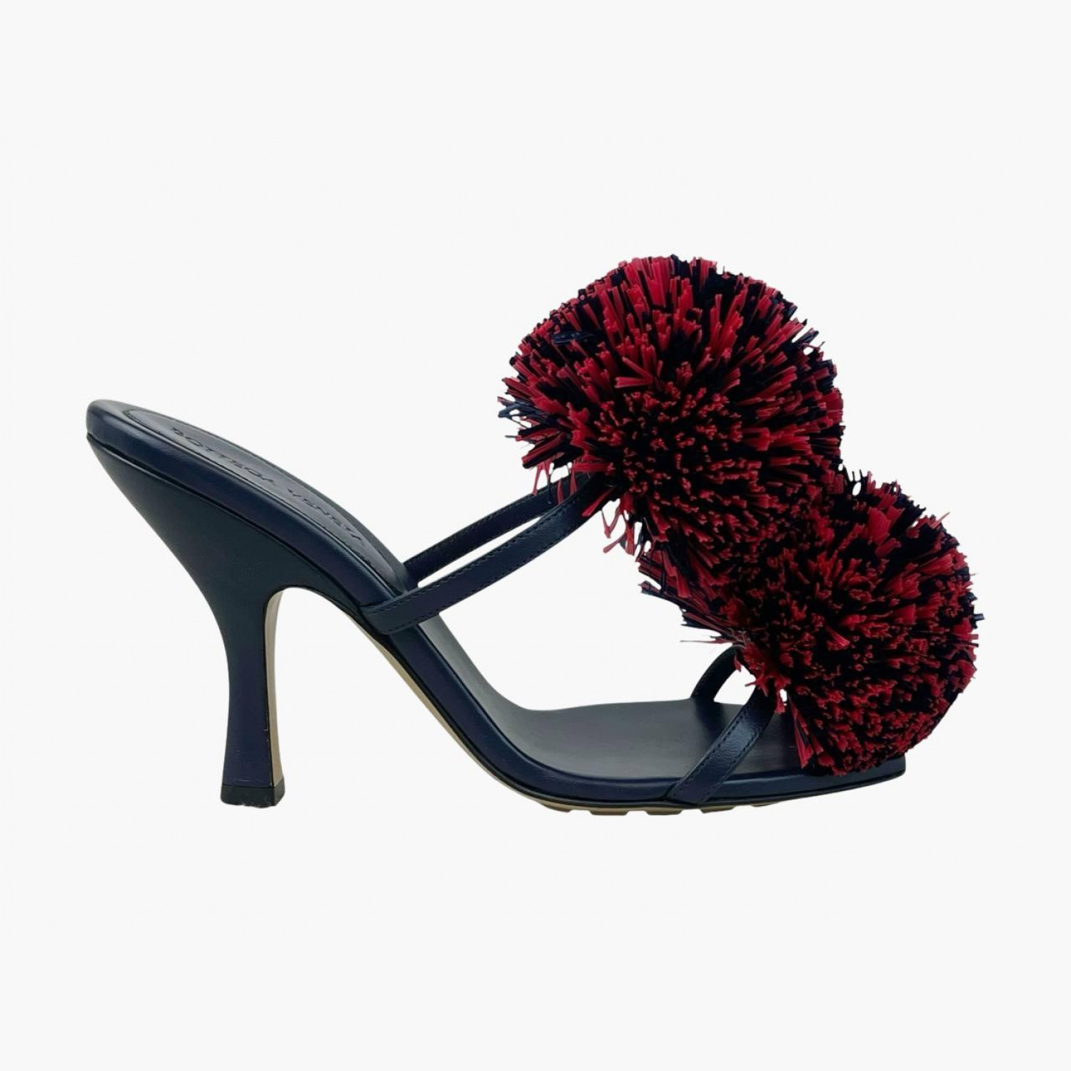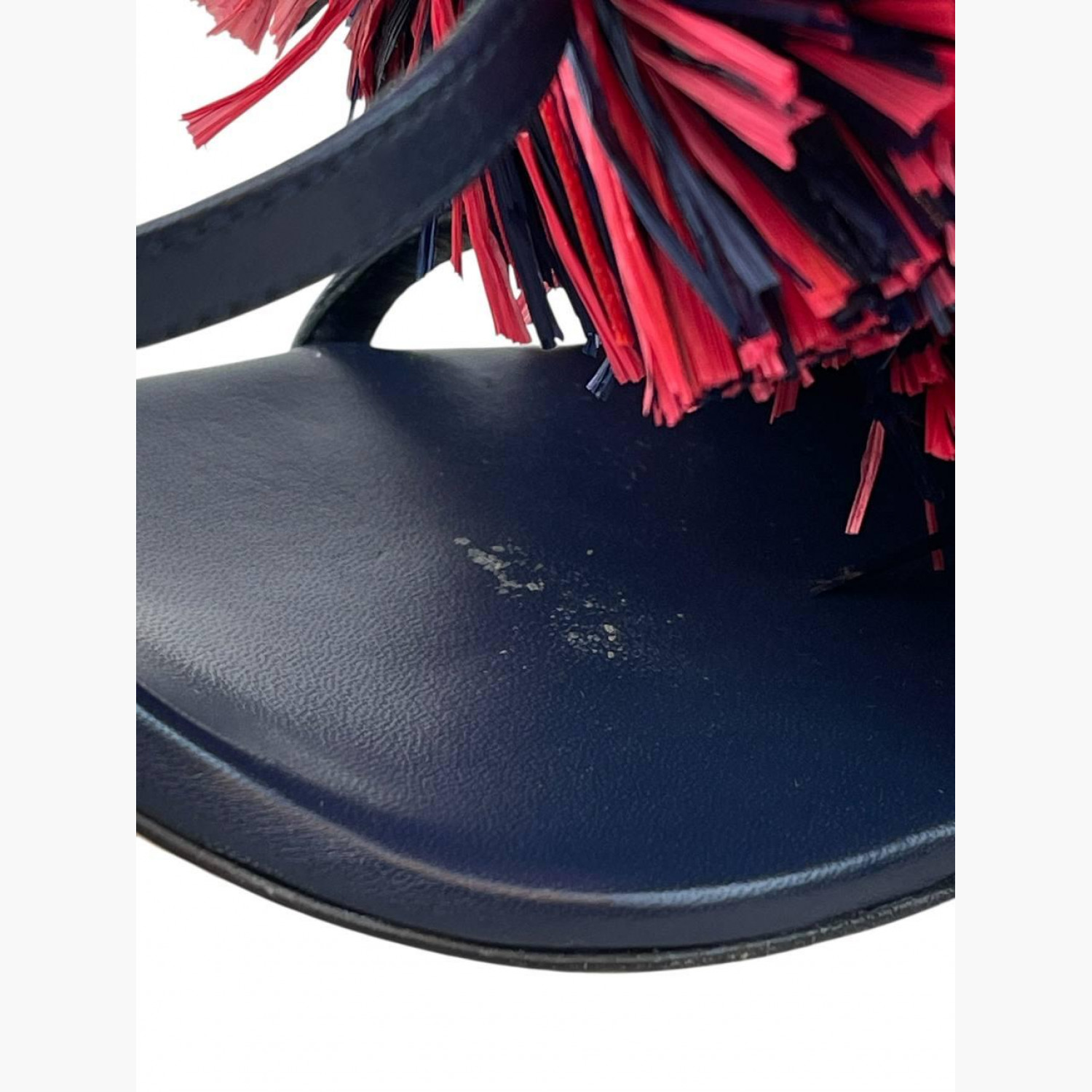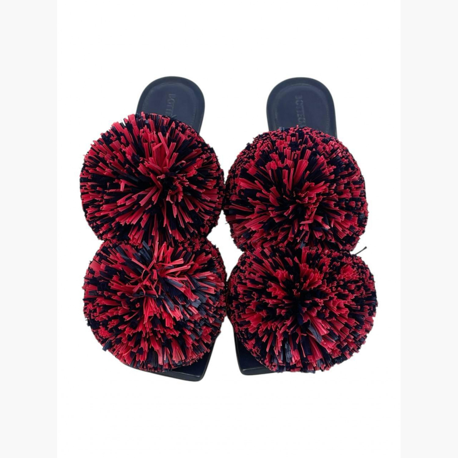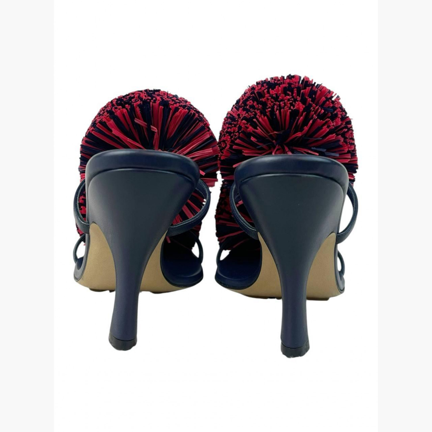 Синие кожаные босоножки с двумя красными объемными помпонами. В отличном состоянии, есть следы носки изнутри.