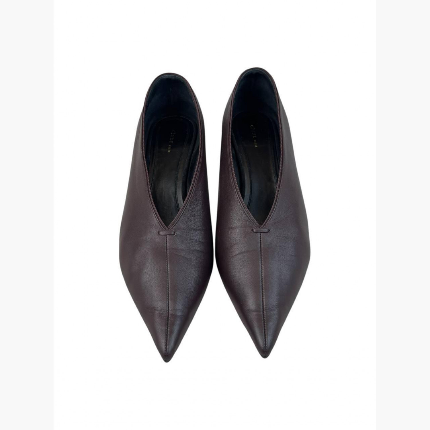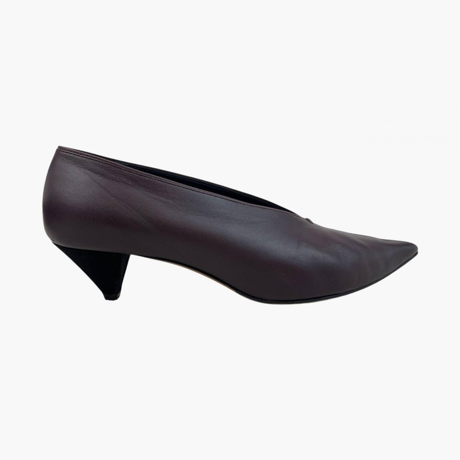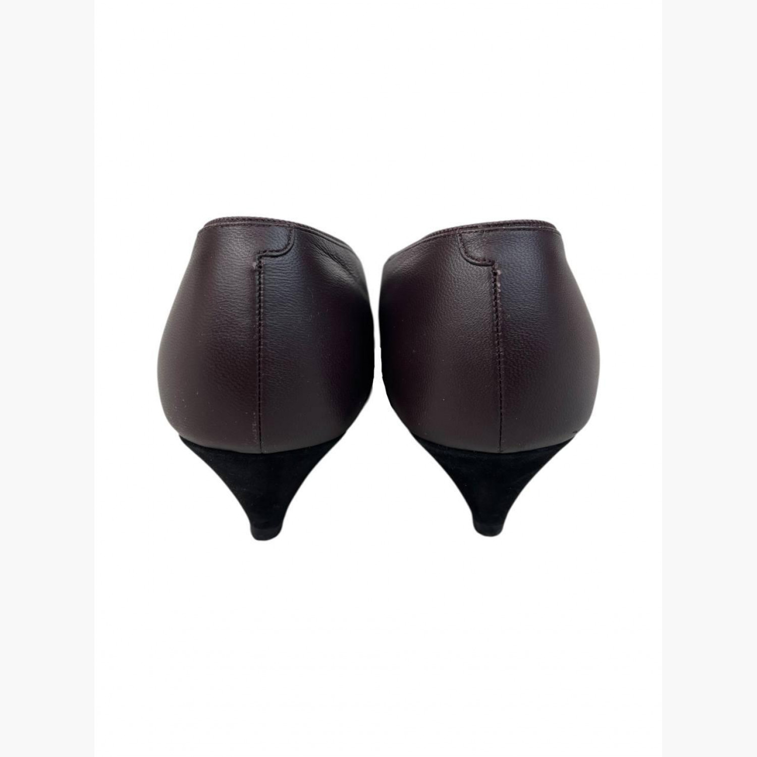 Бордовые кожаные туфли с острым носком и замшевым каблуком. В отличном состоянии, есть незначительные следы носки.