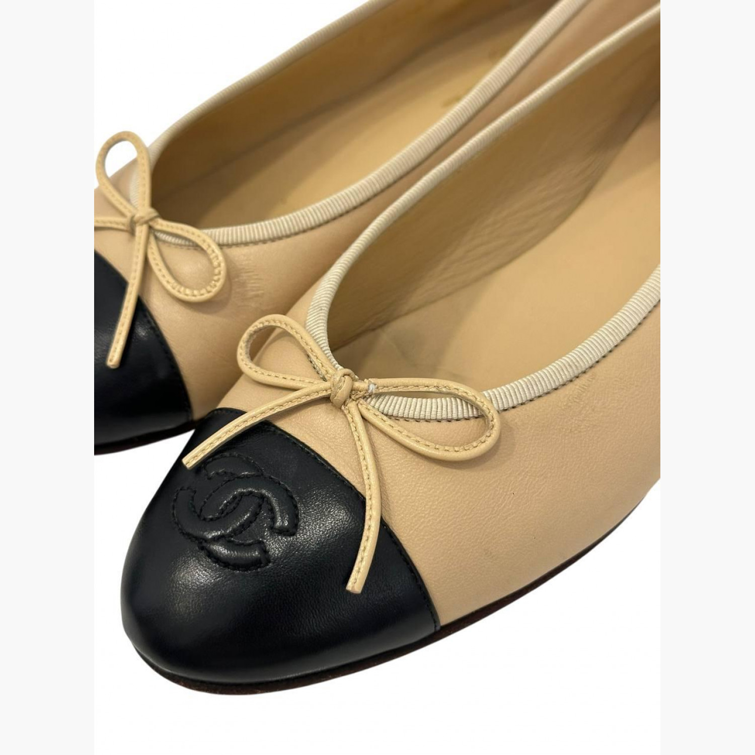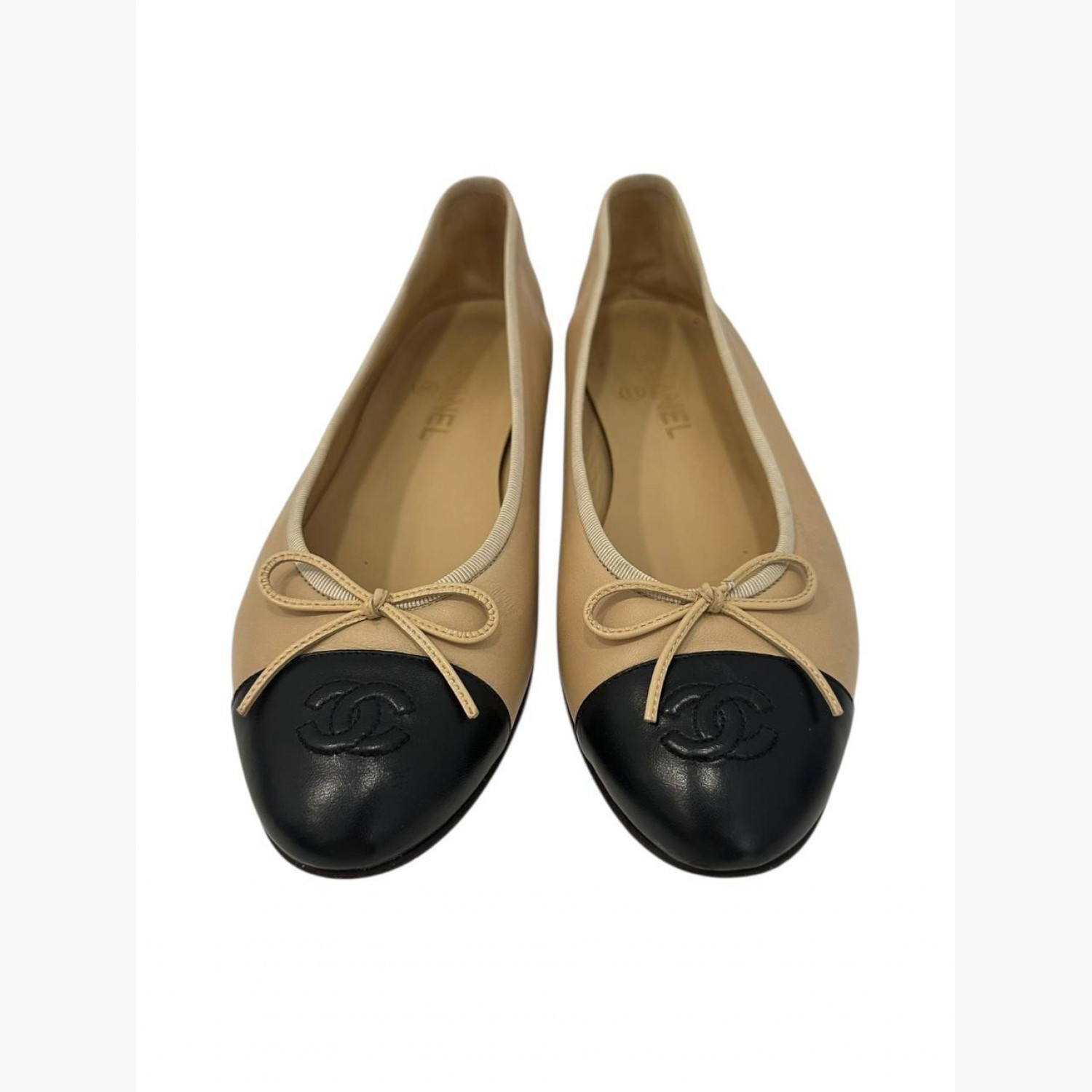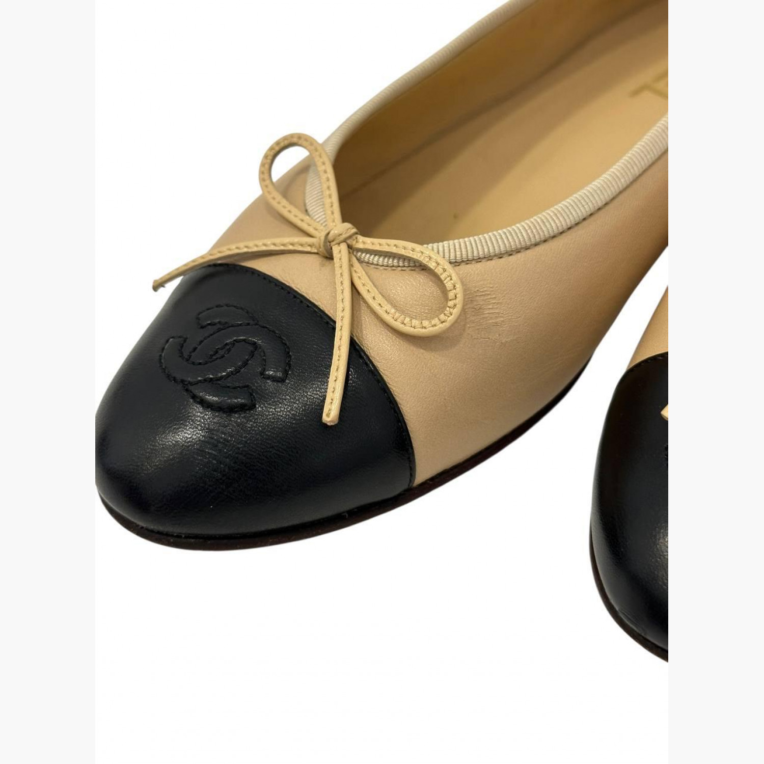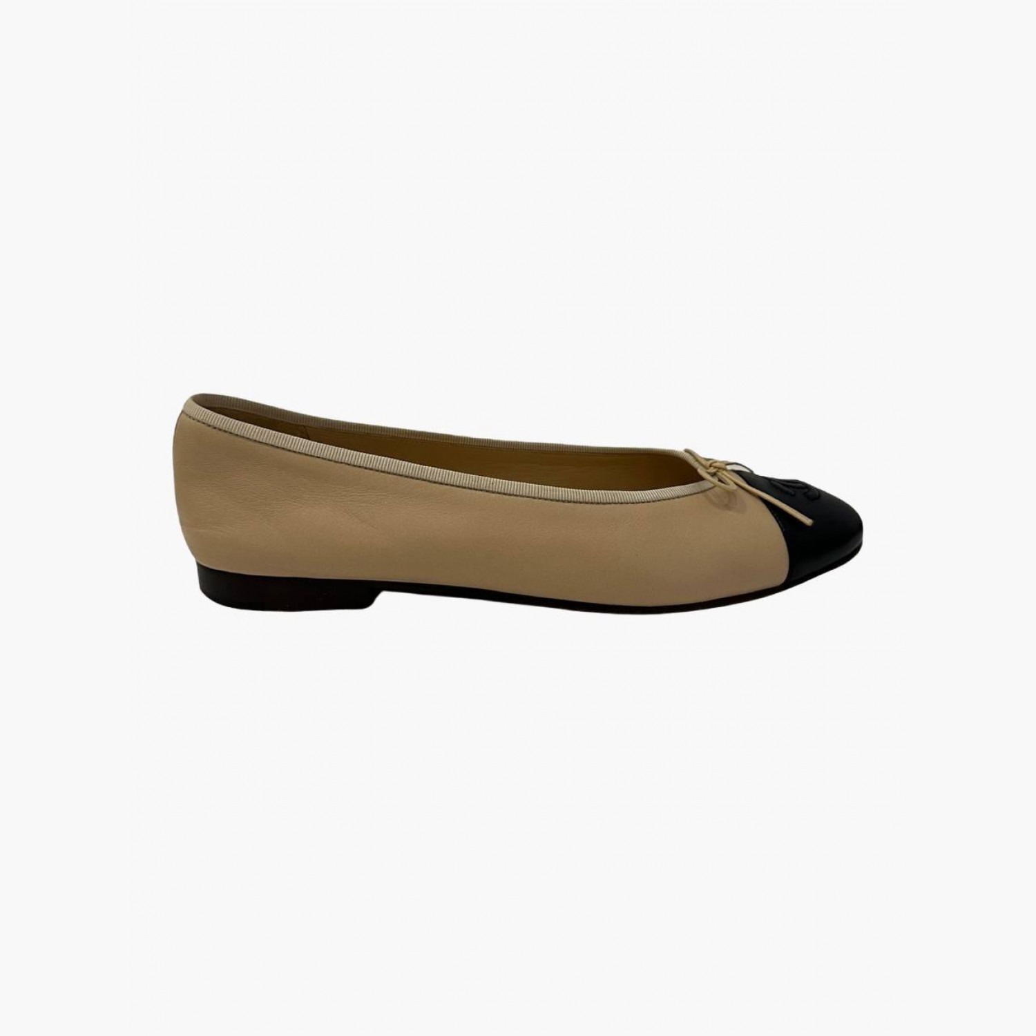 Бежевые кожаные балетки с черным носком. В хорошем состоянии, есть потертости и небольшие царапины.