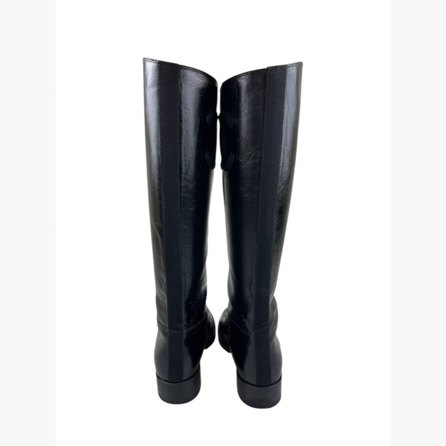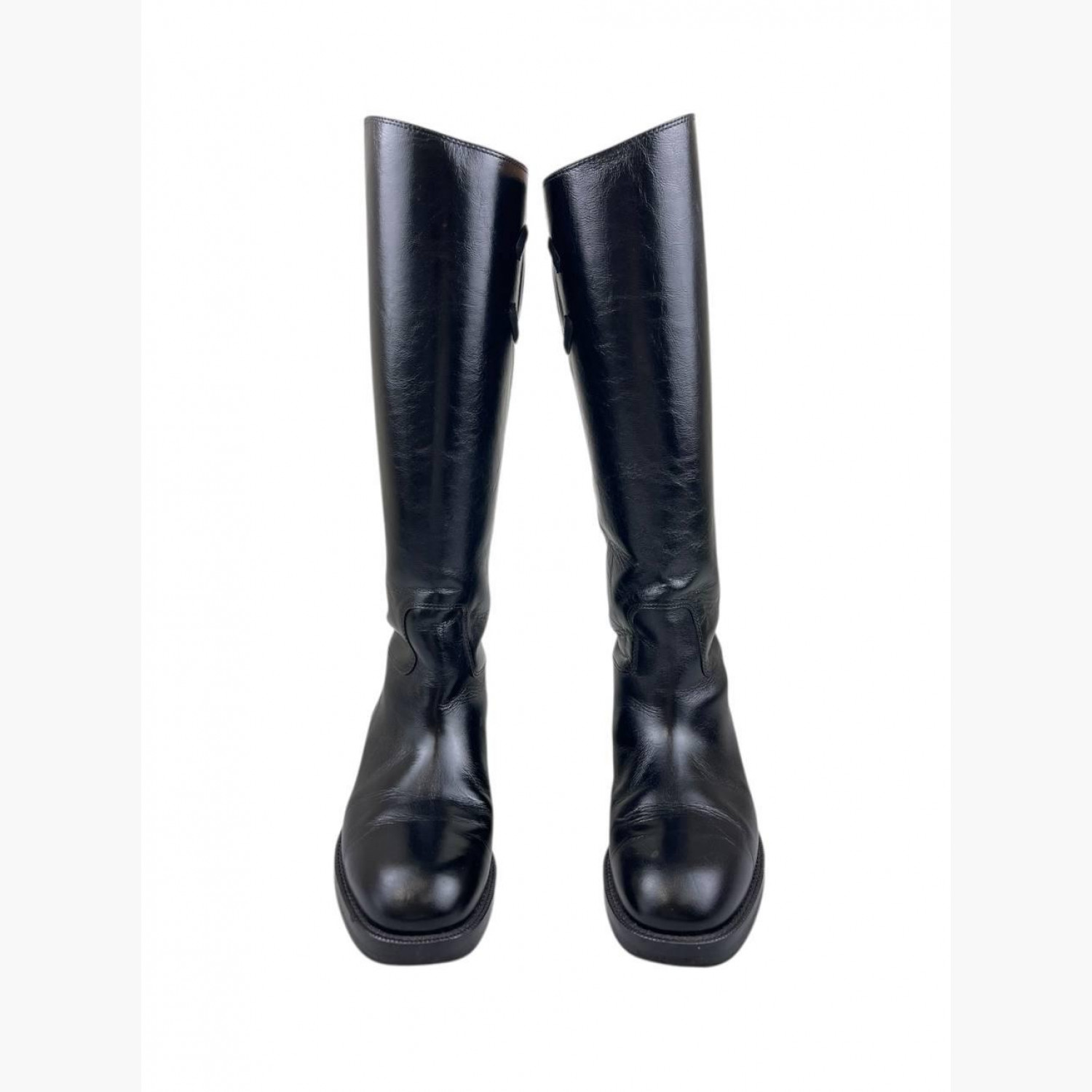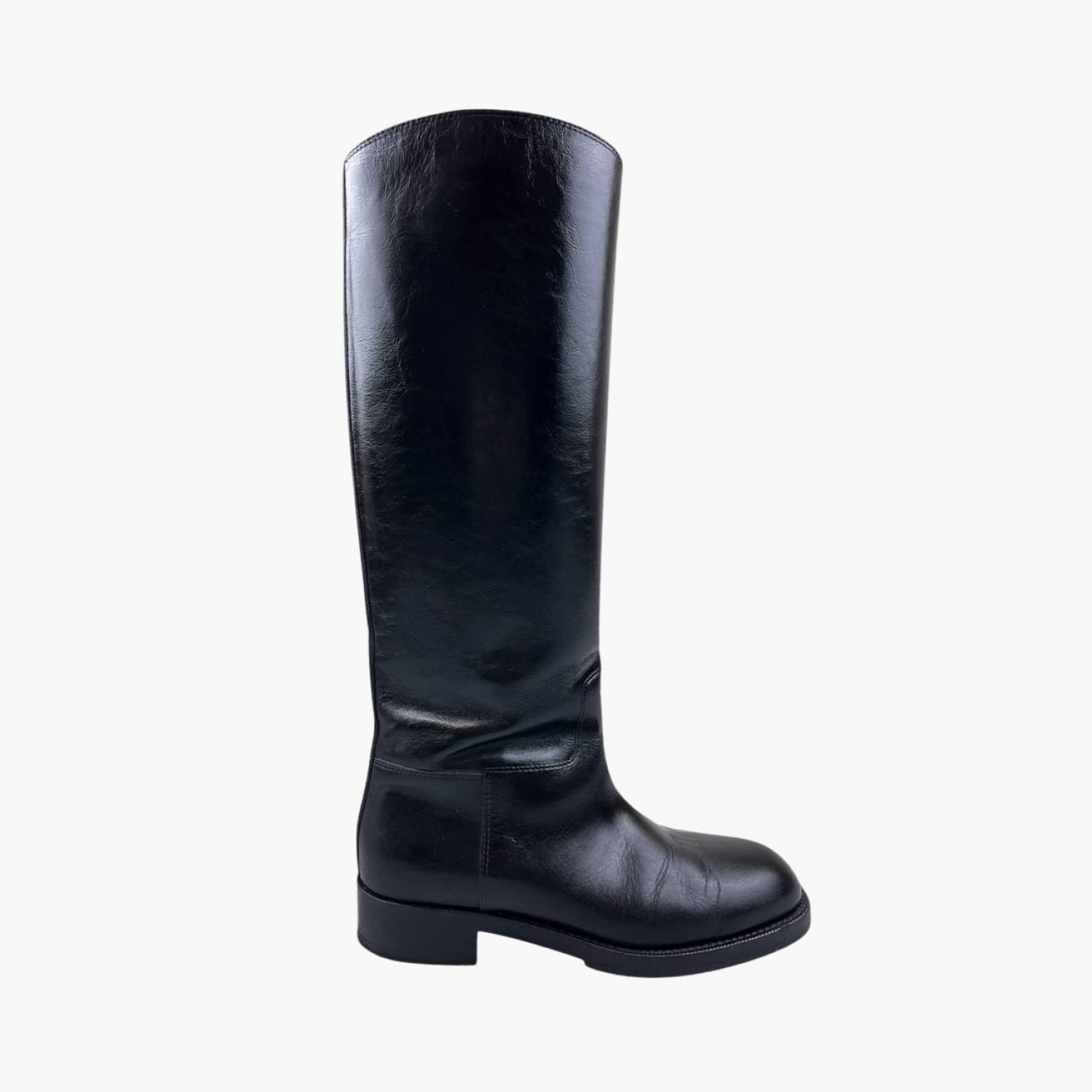 Высокие жокейские сапоги чёрного цвета с текстильным логотипом по бокам. В очень хорошем состоянии, имеются незначительные следы носки.