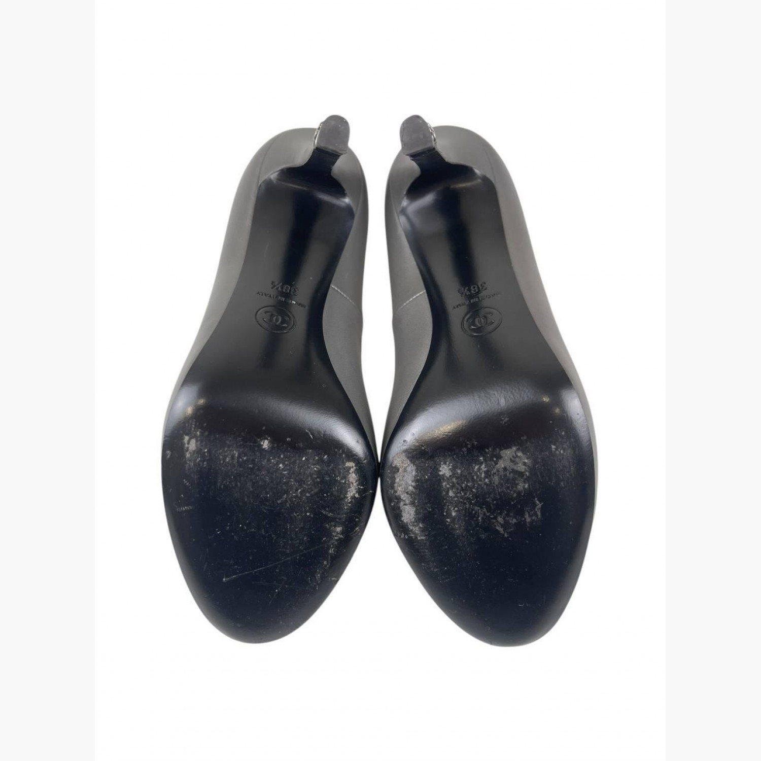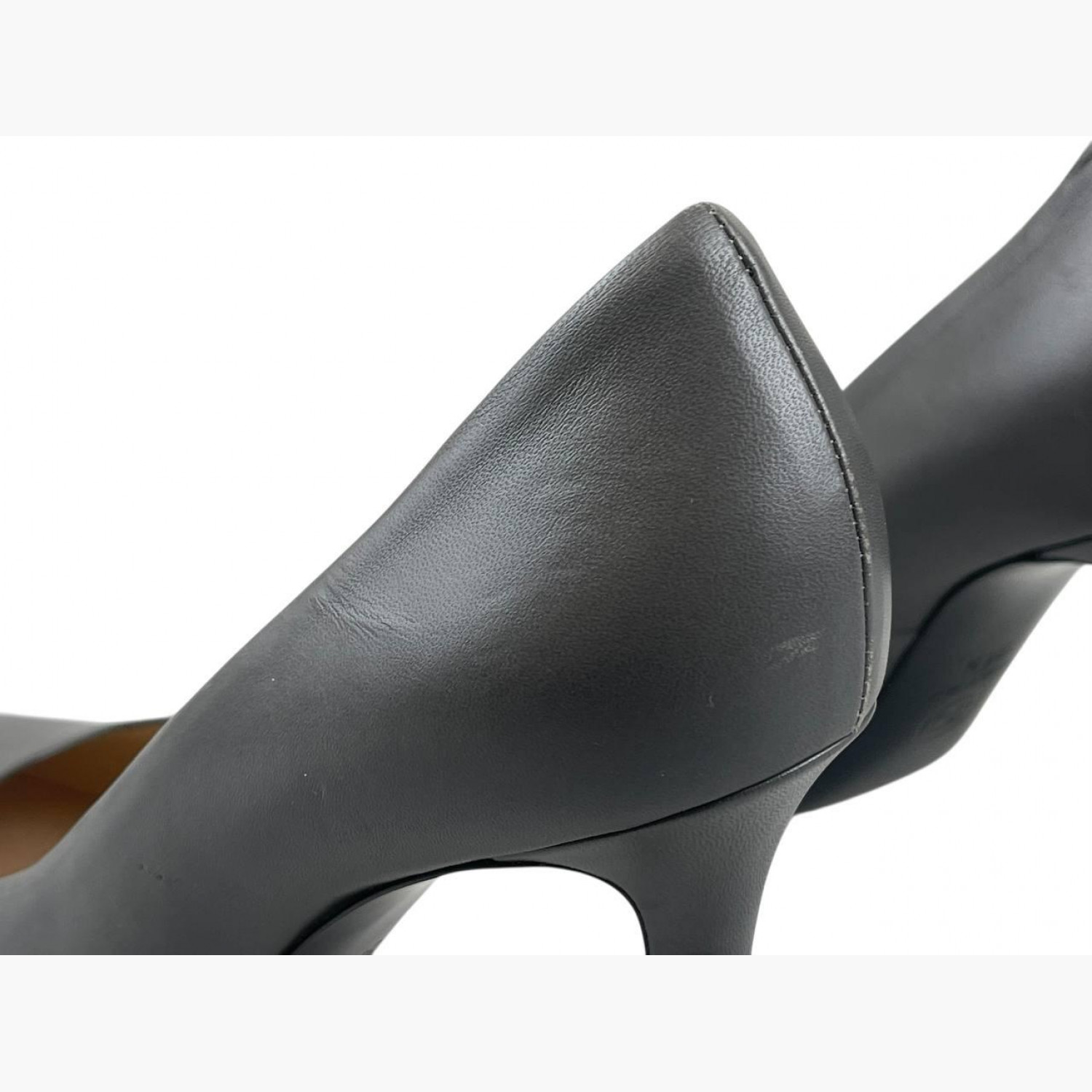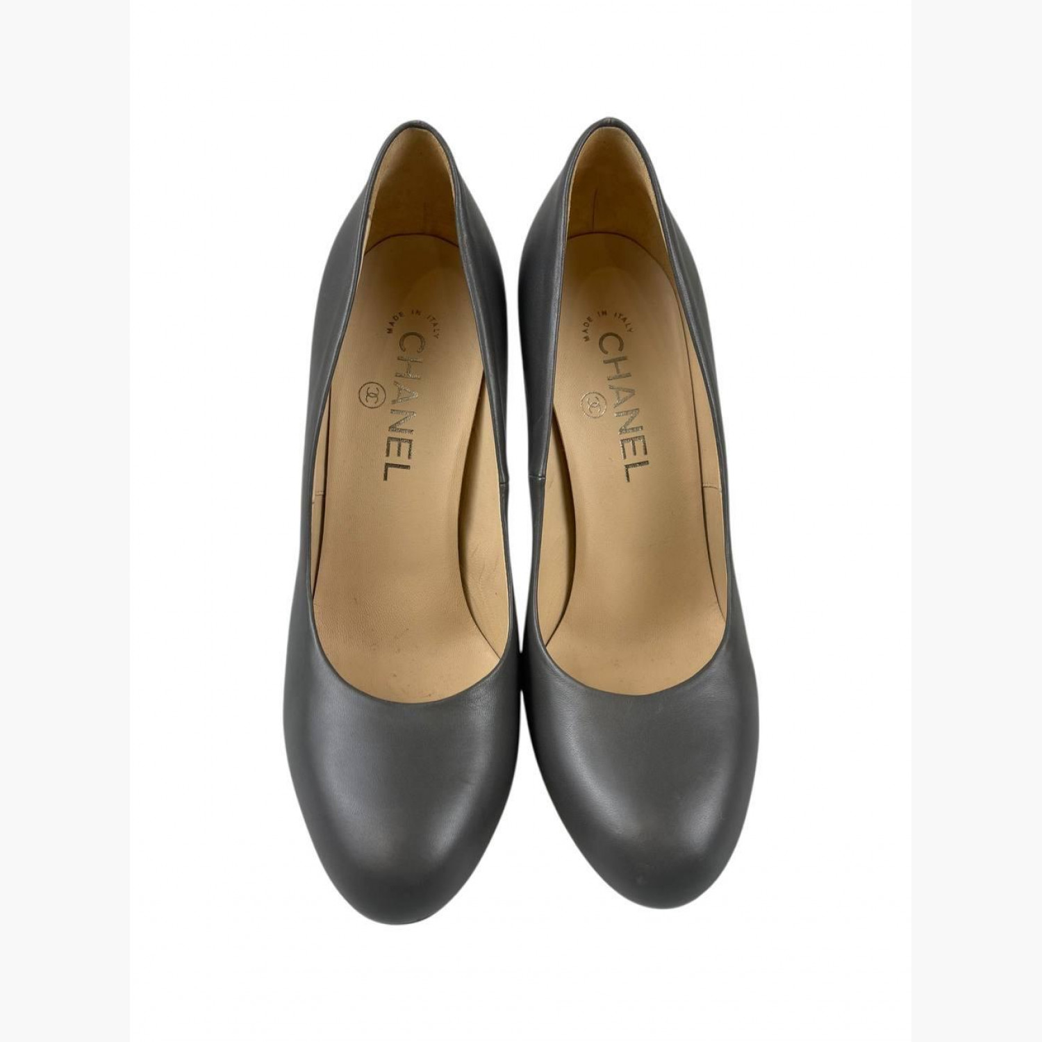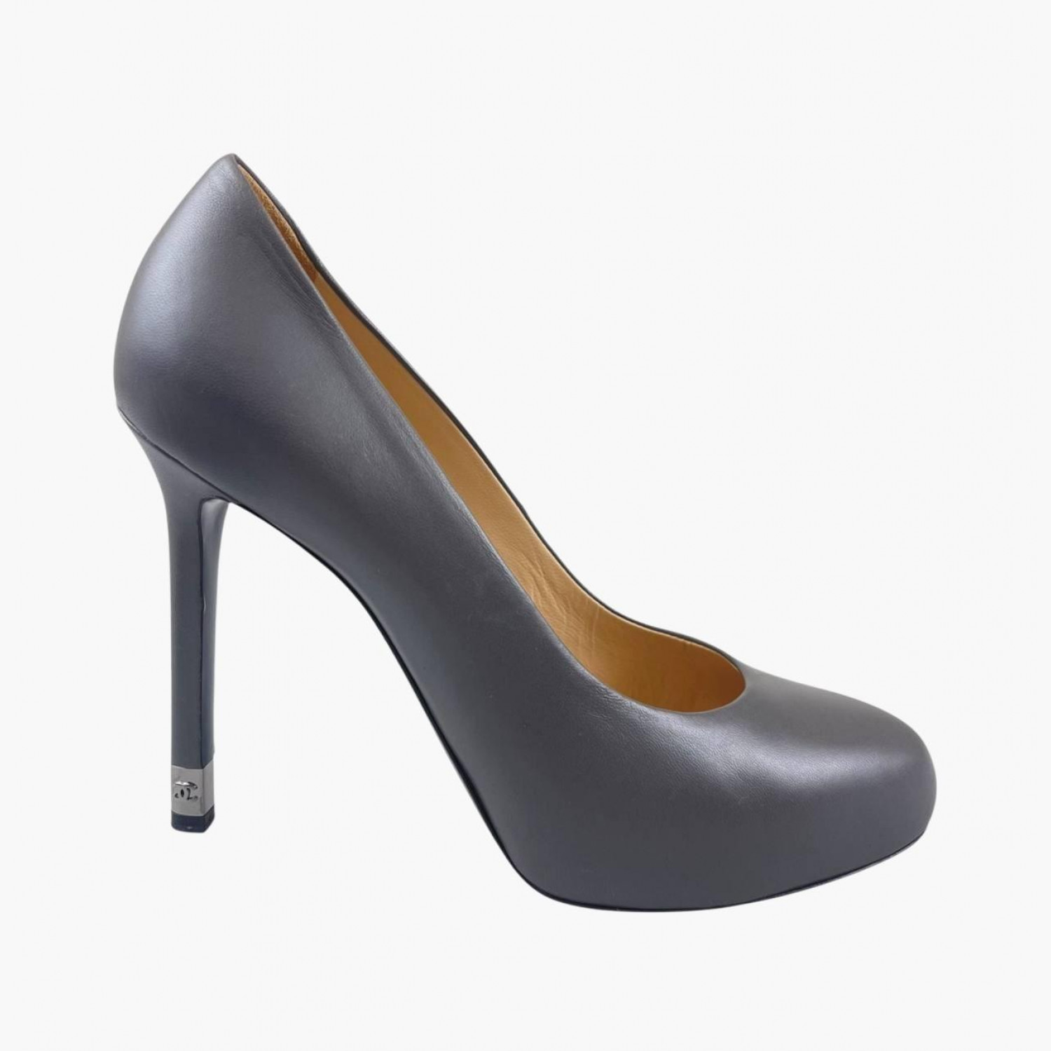 Серые кожаные туфли с круглым носком на шпильке. В хорошем состоянии, есть потертости.