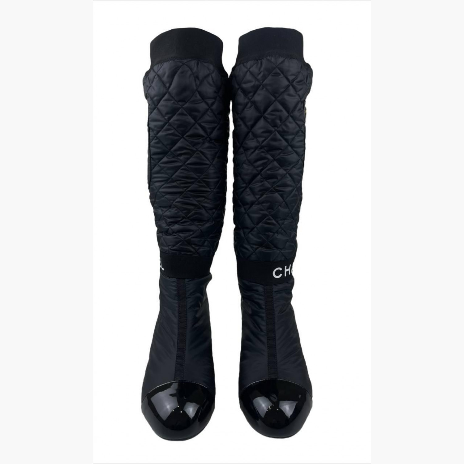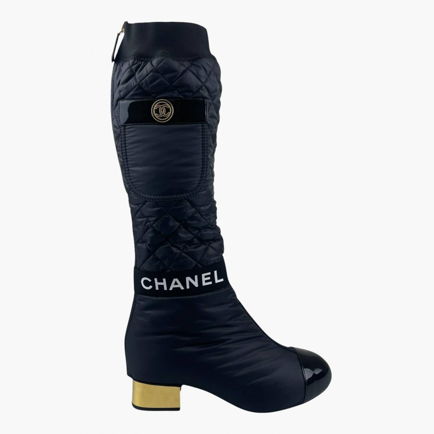 Черные сапоги-трансформеры в нейлоновом стеганом чехле на молнии с золотым каблуком. В отличном состоянии, есть незначительные следы носки.