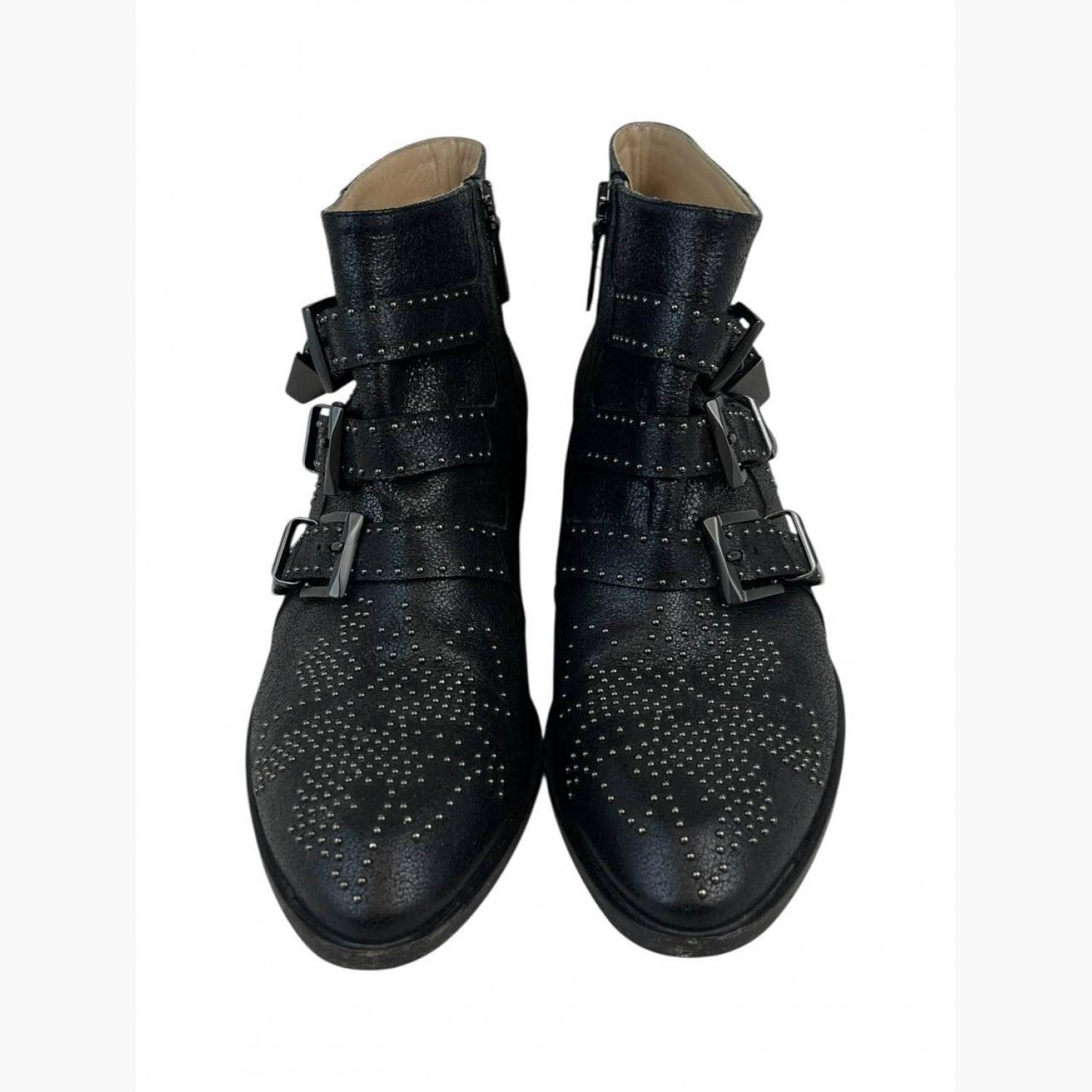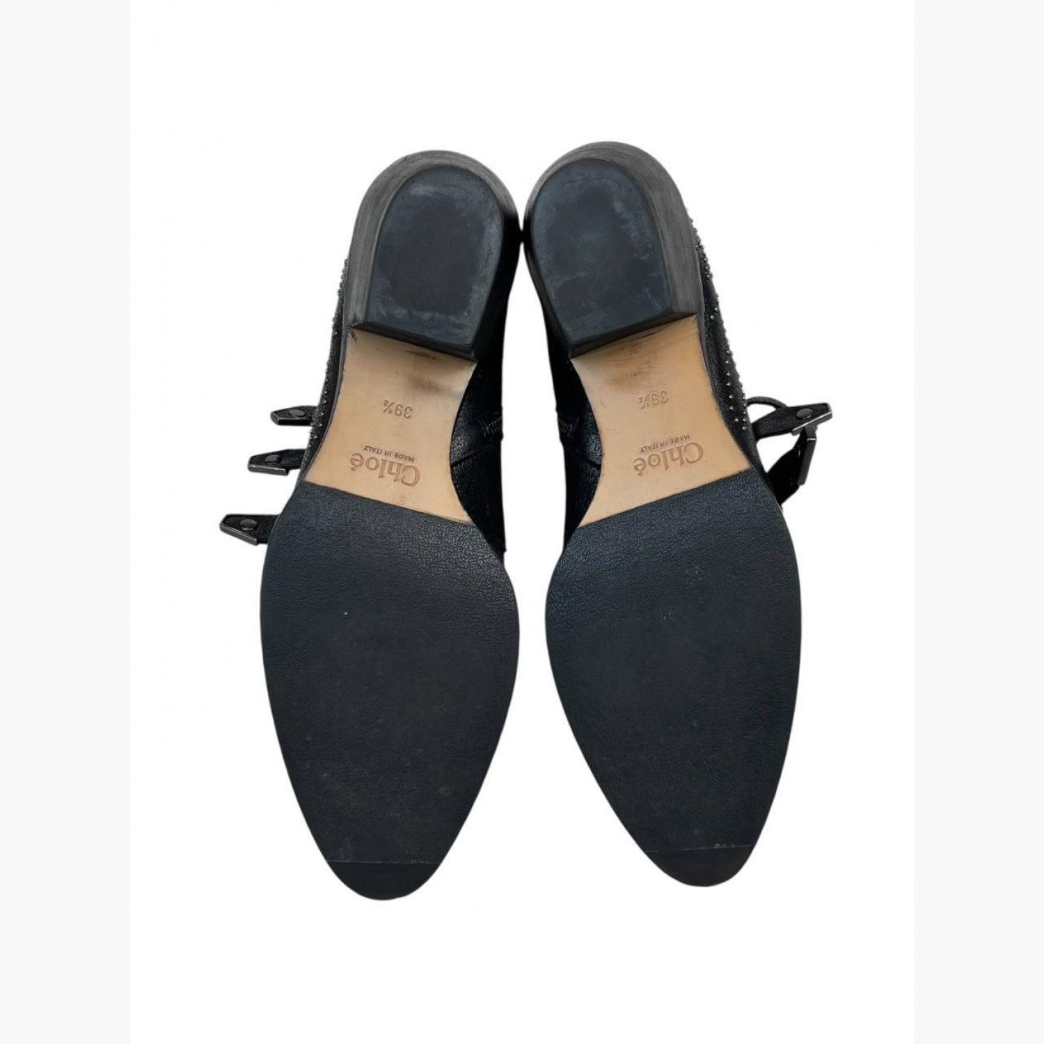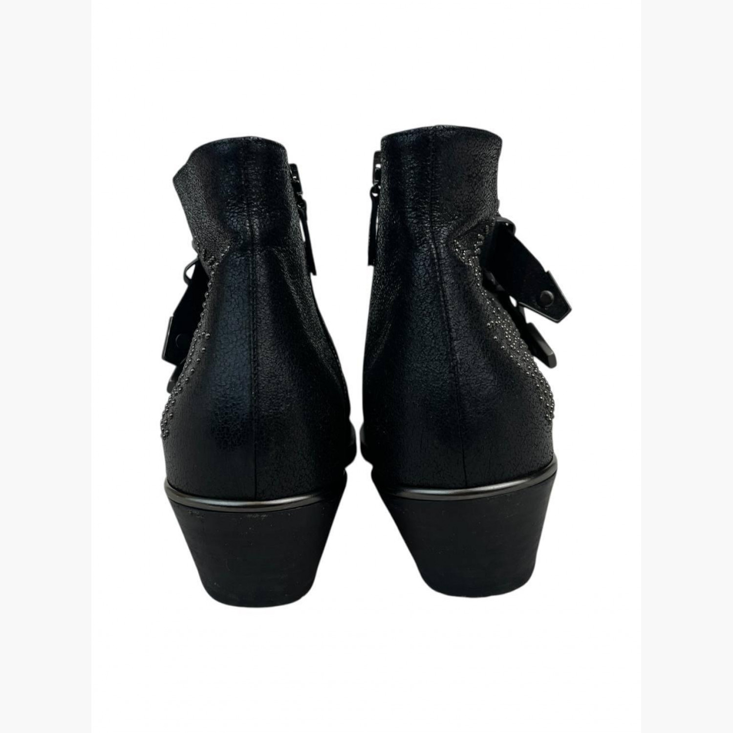 Чёрные кожаные ботильоны с металлической фурнитурой и декором. В очень хорошем состоянии, есть следы носки.
