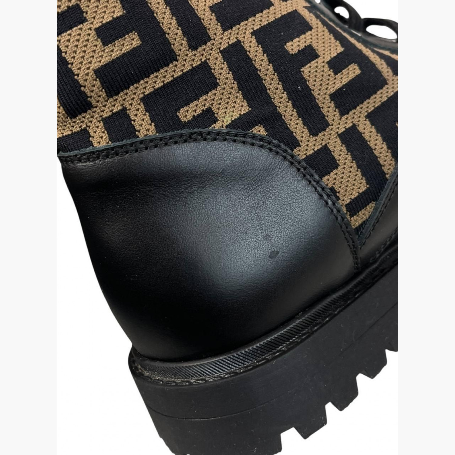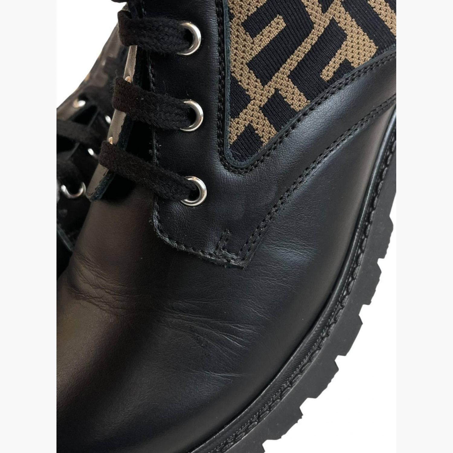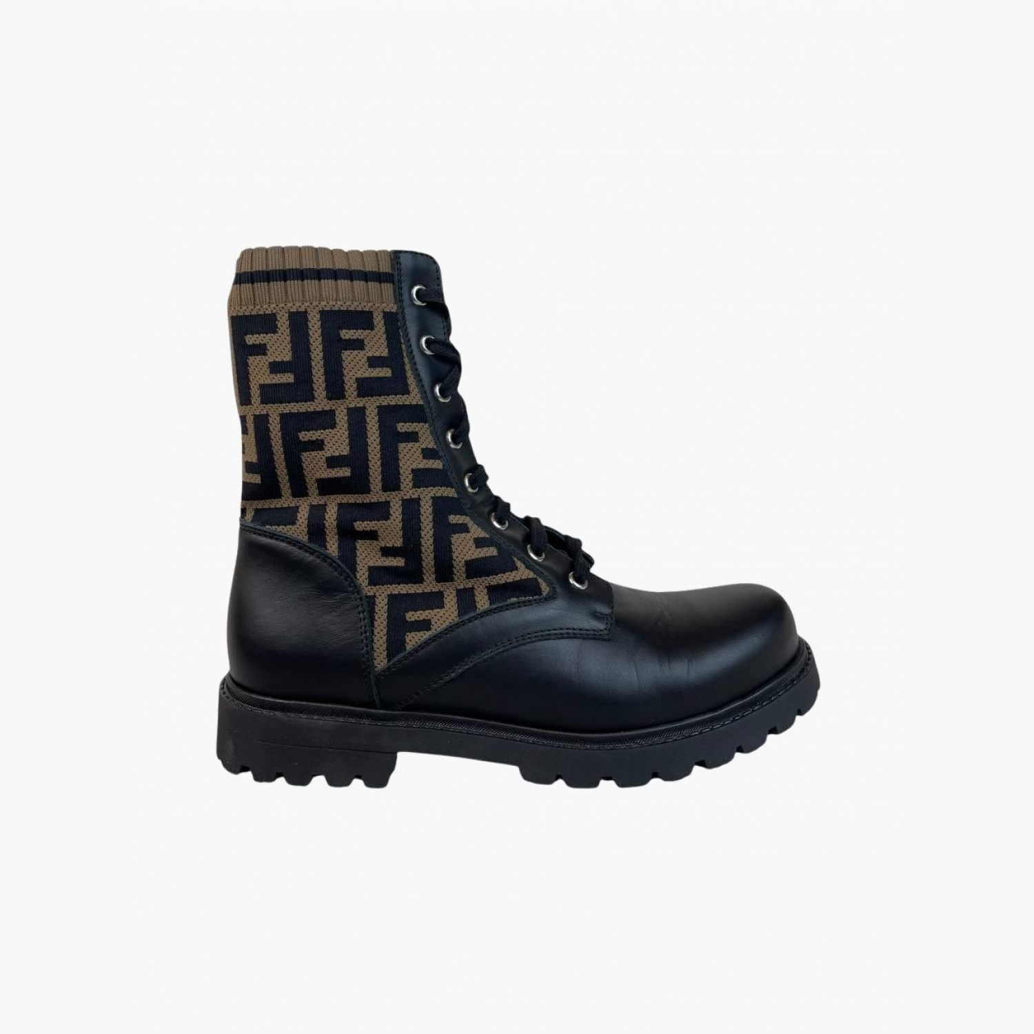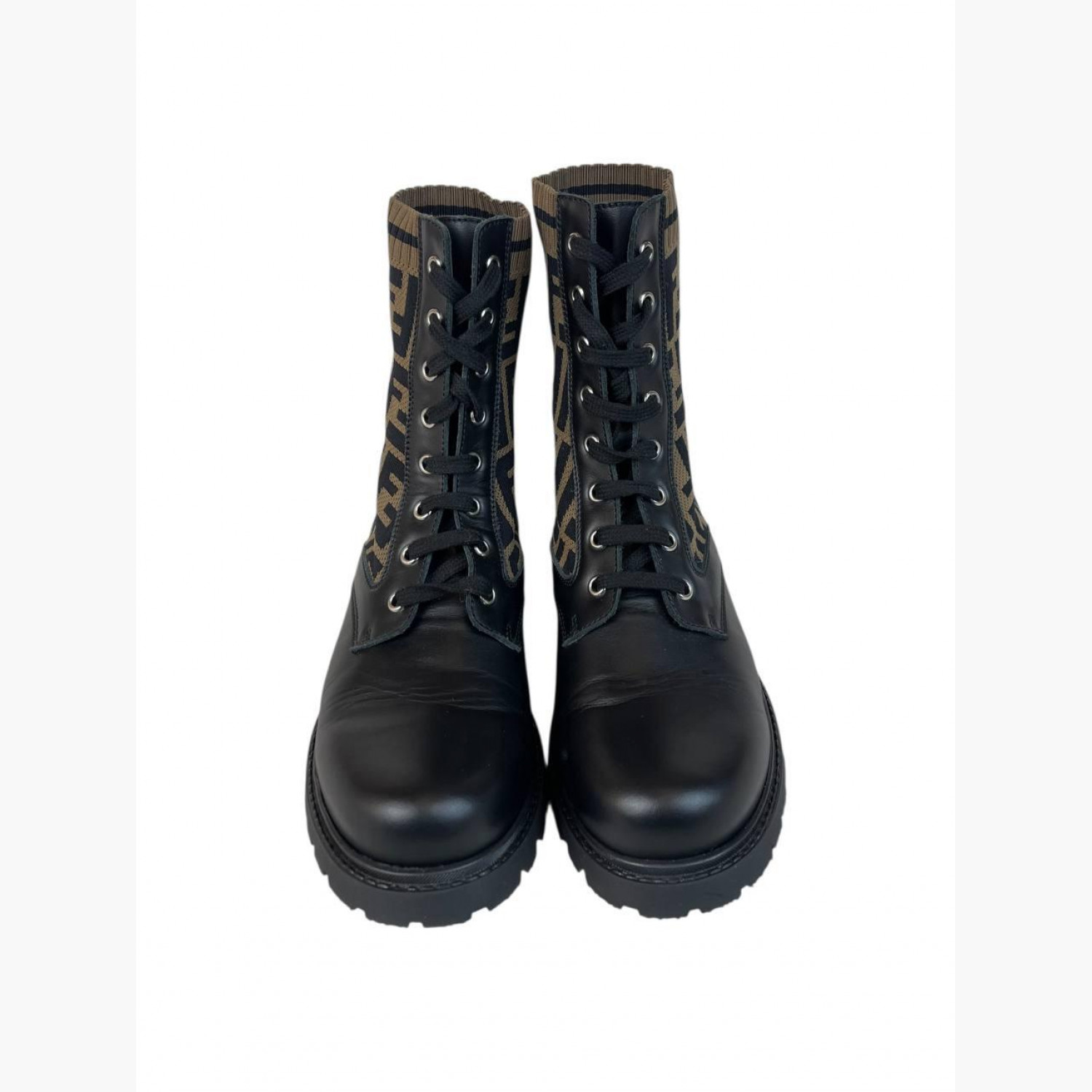 Чёрные кожаные ботинки на шнуровке с текстильными коричневыми вставками в логотип. В отличном состоянии, есть незначительные следы носки.