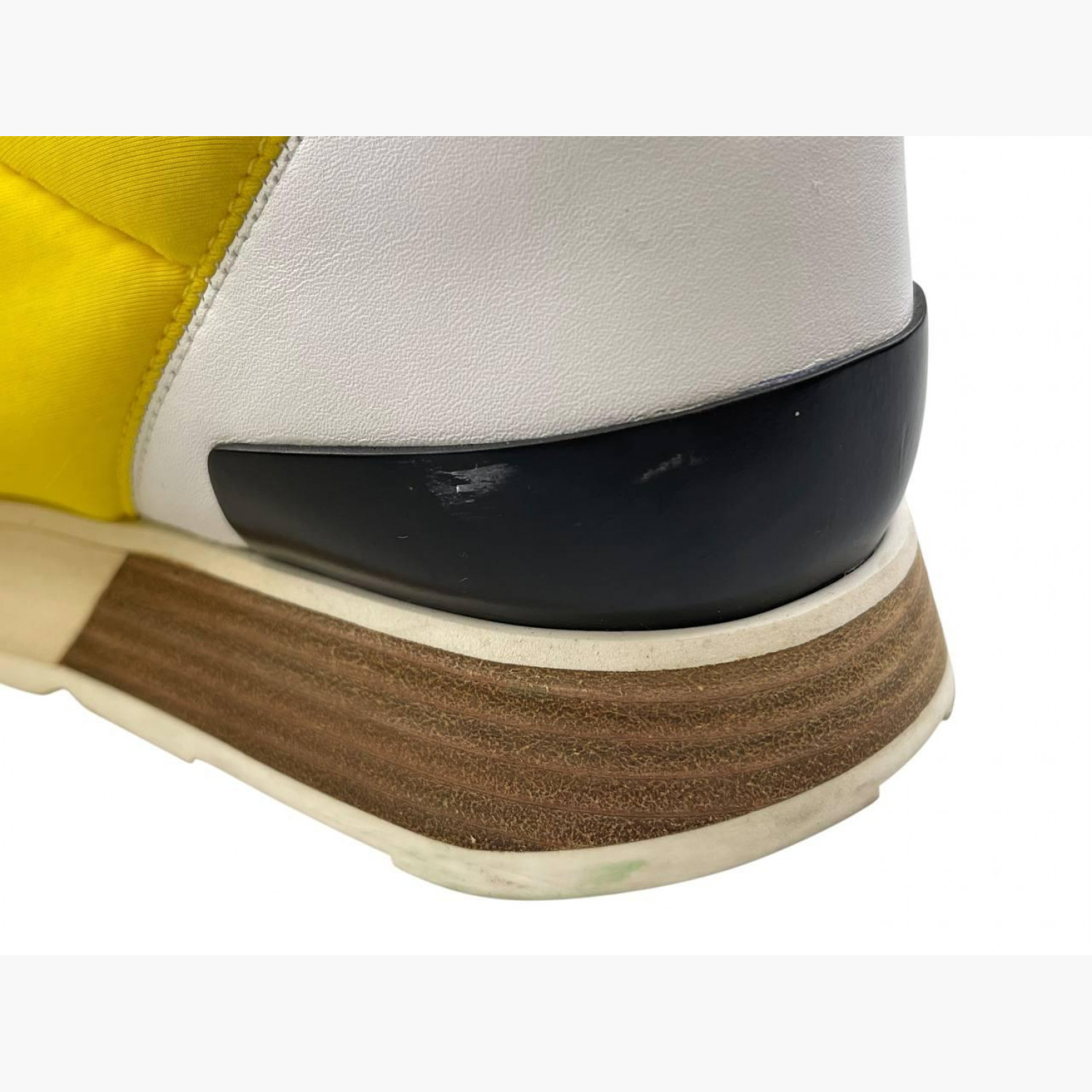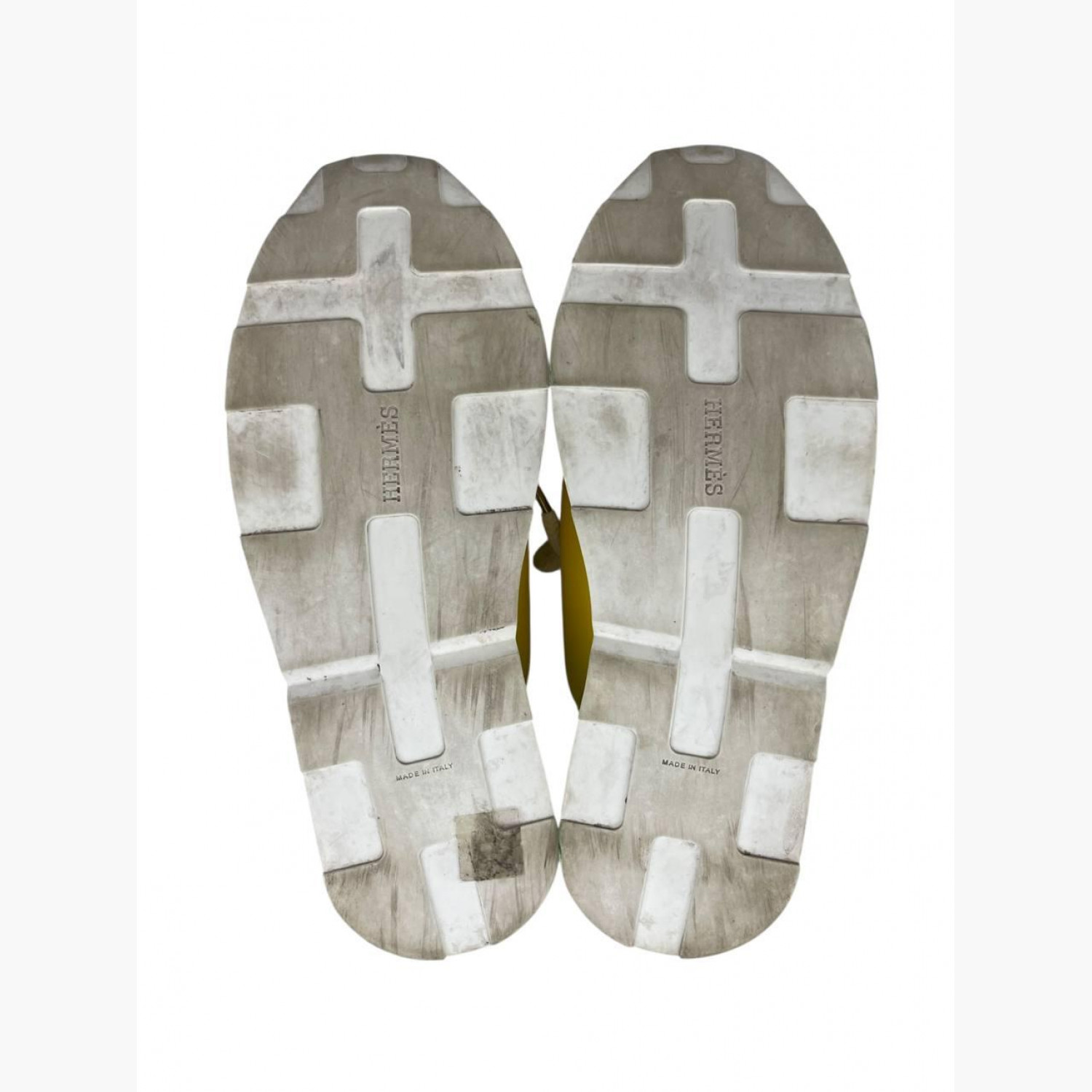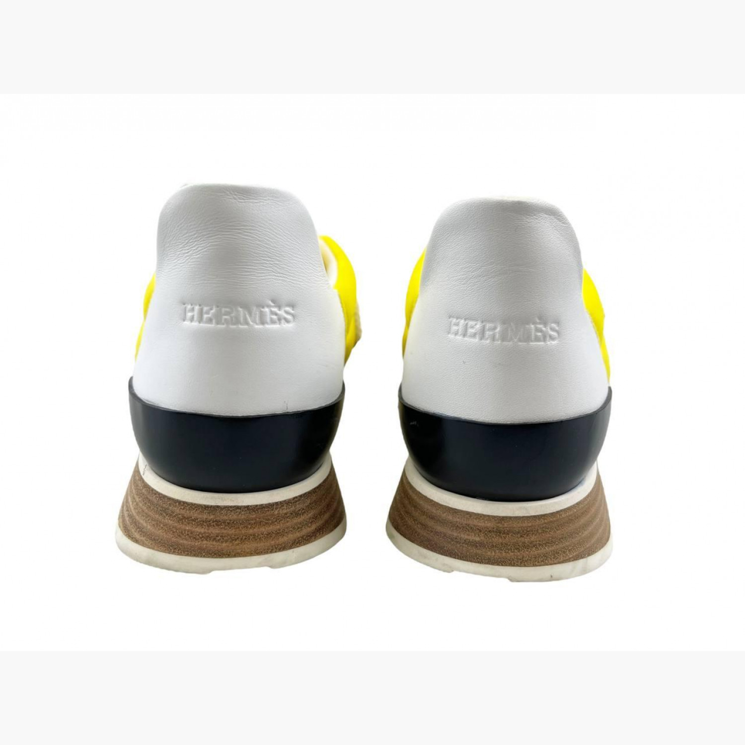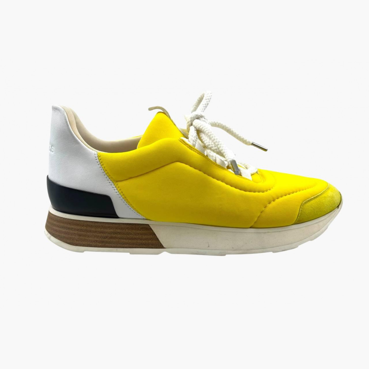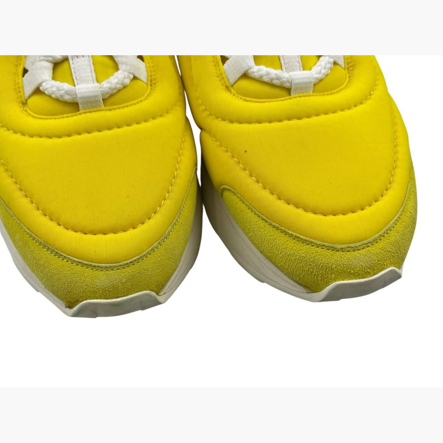 Желтые текстильные кроссовки с белыми кожаными вставками на задниках. В хорошем состоянии, есть потертости.