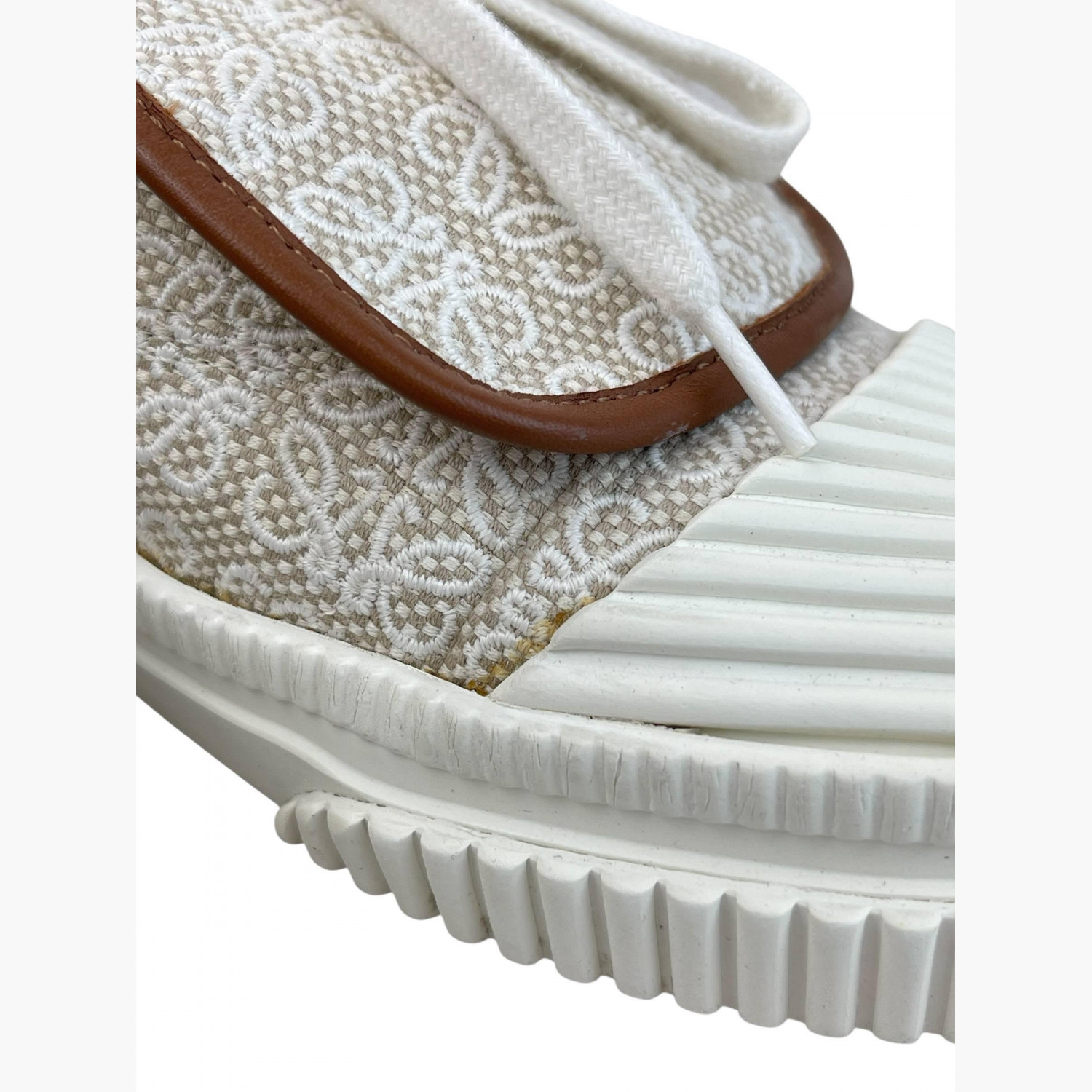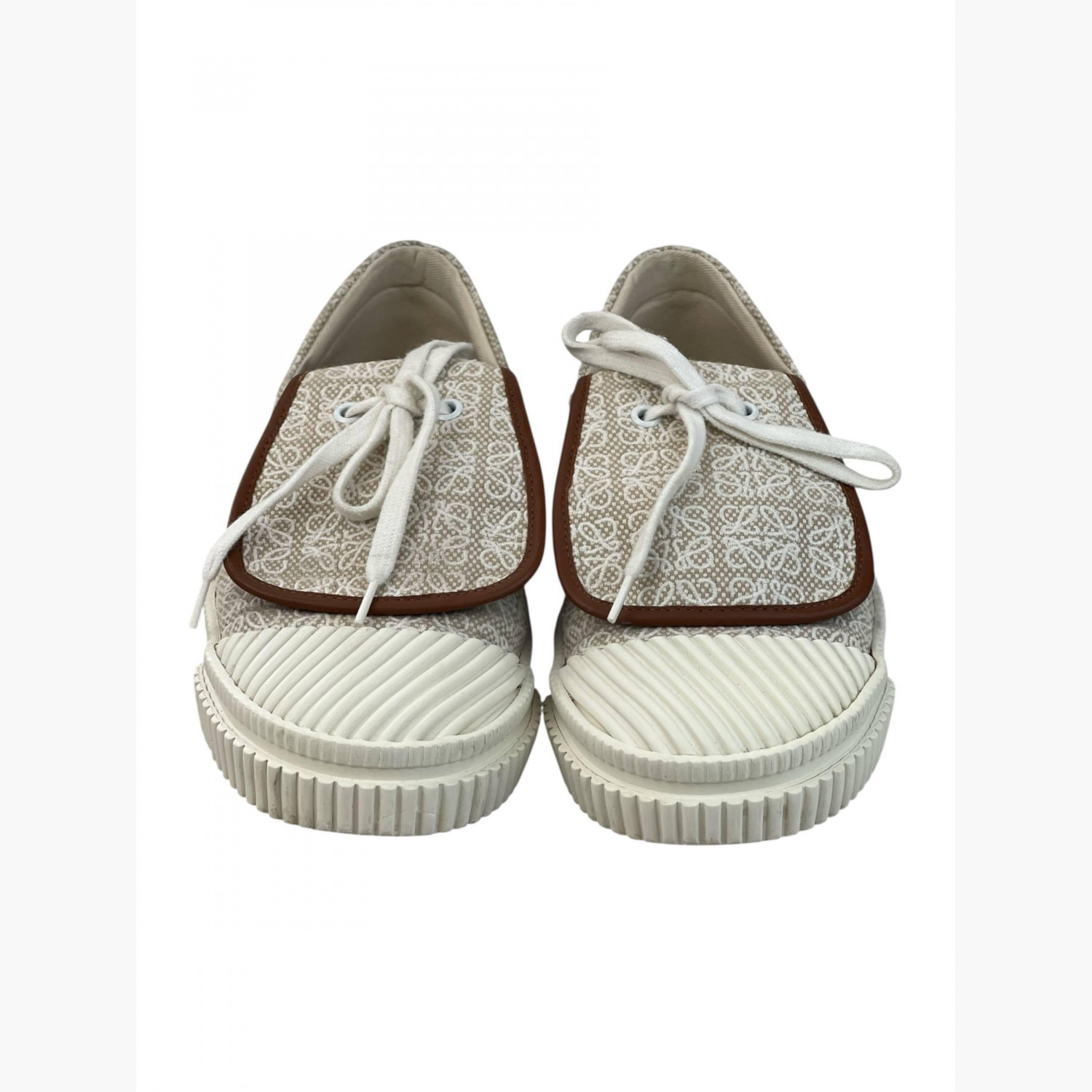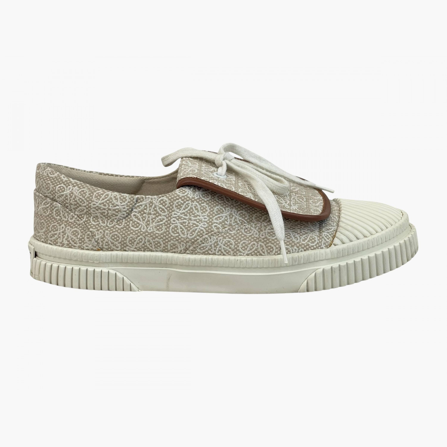 Бежевые текстильные кеды с логотипом, с вывернутым язычком и кожаной коричневой окантовкой, под которой находится шнуровка.В хорошем состоянии, есть следы носки.