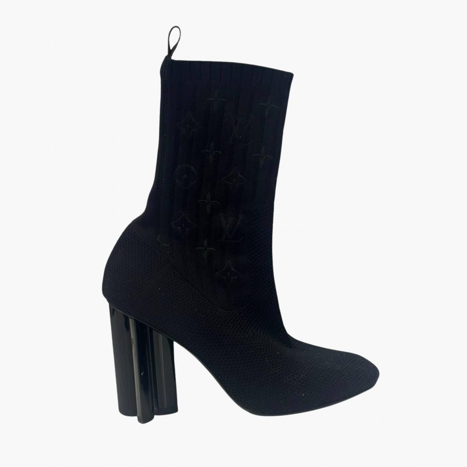 Черные текстильные ботильоны на каблуке. В хорошем состоянии, есть потертости.