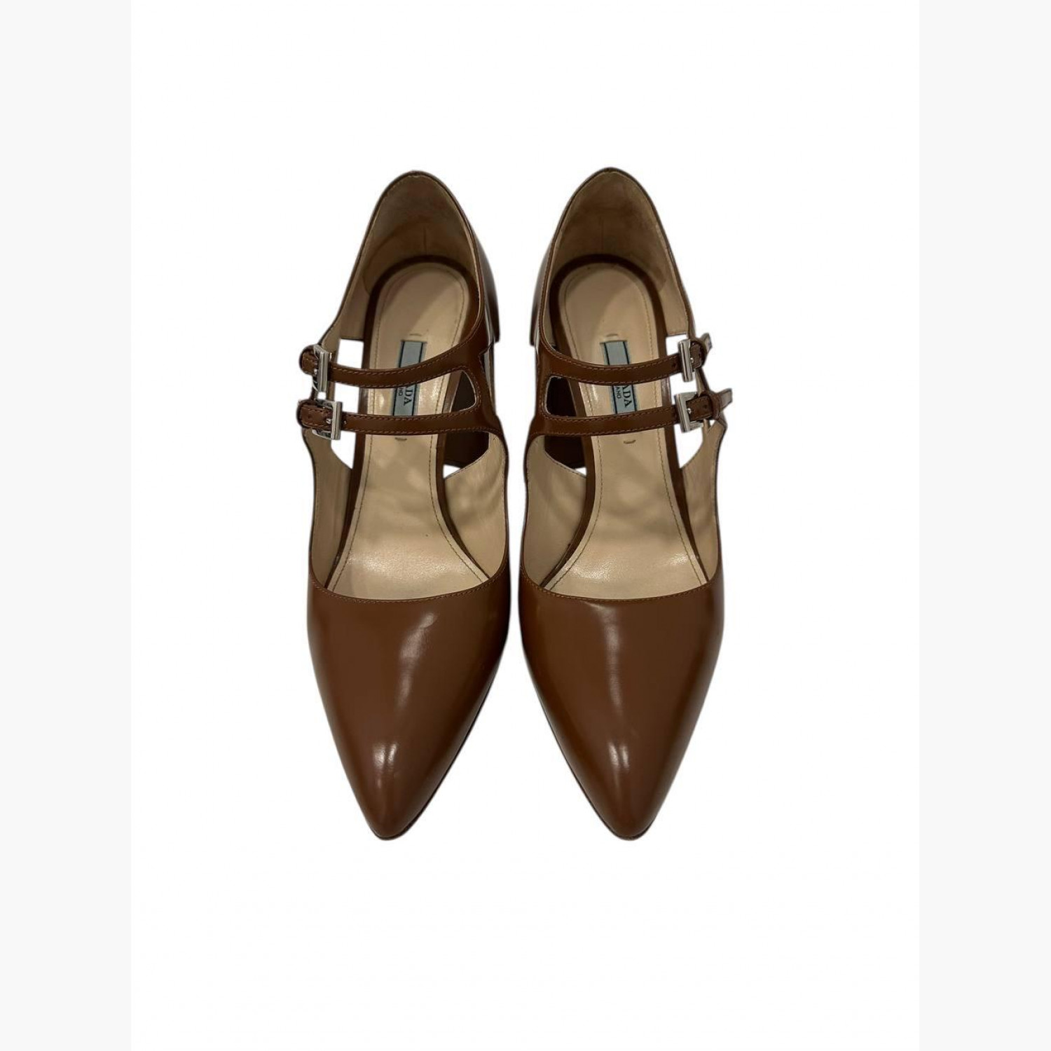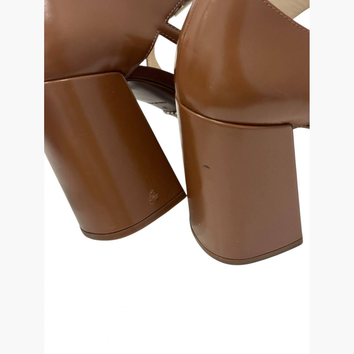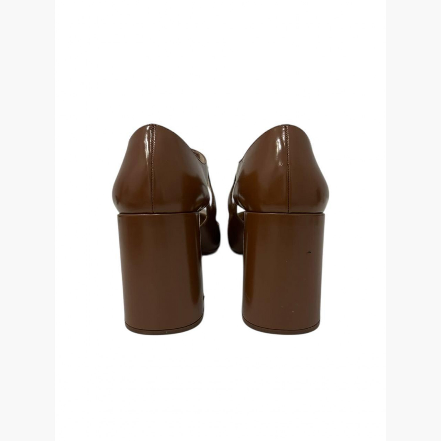 Коричневые кожаные туфли на устойчивом каблуке. В хорошем состоянии, есть потертости и царапины.