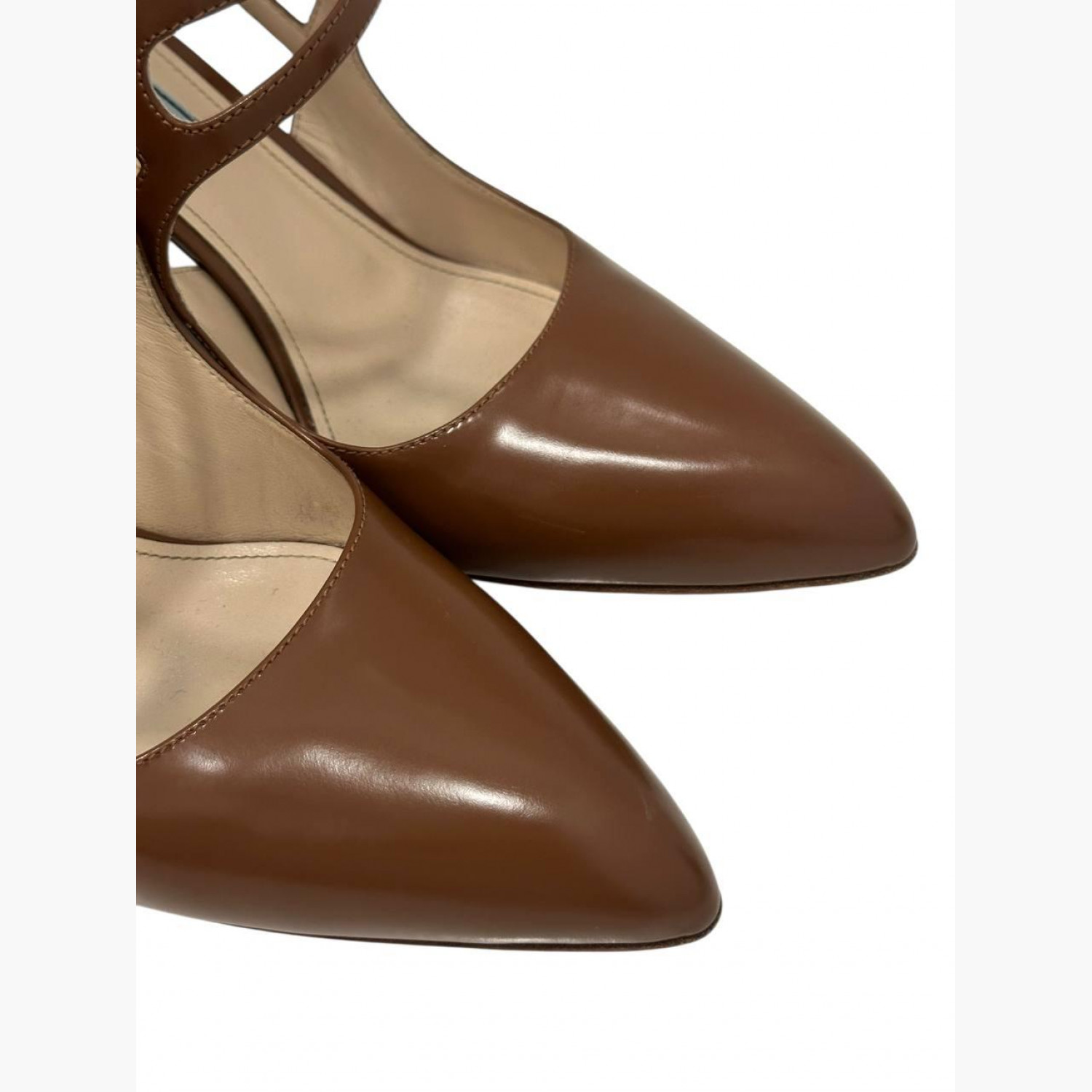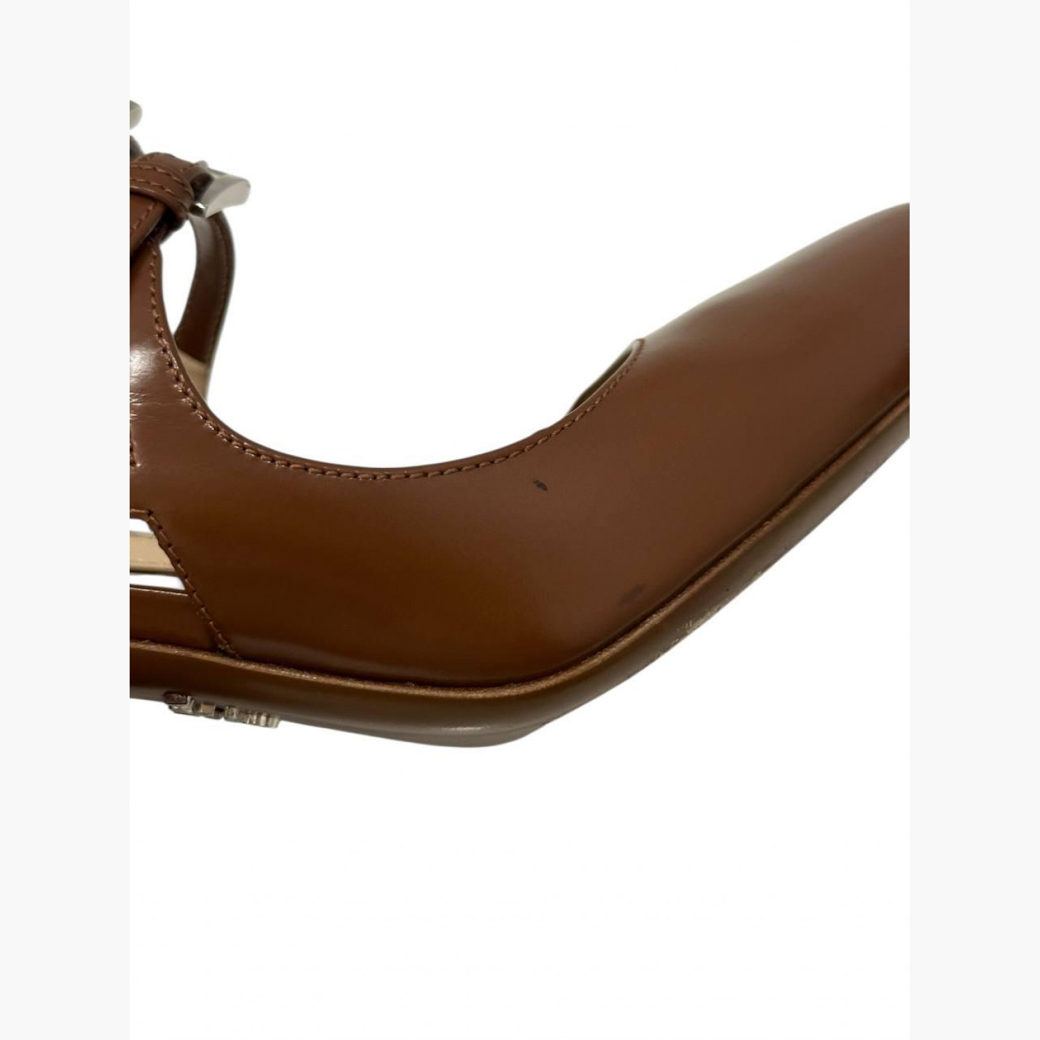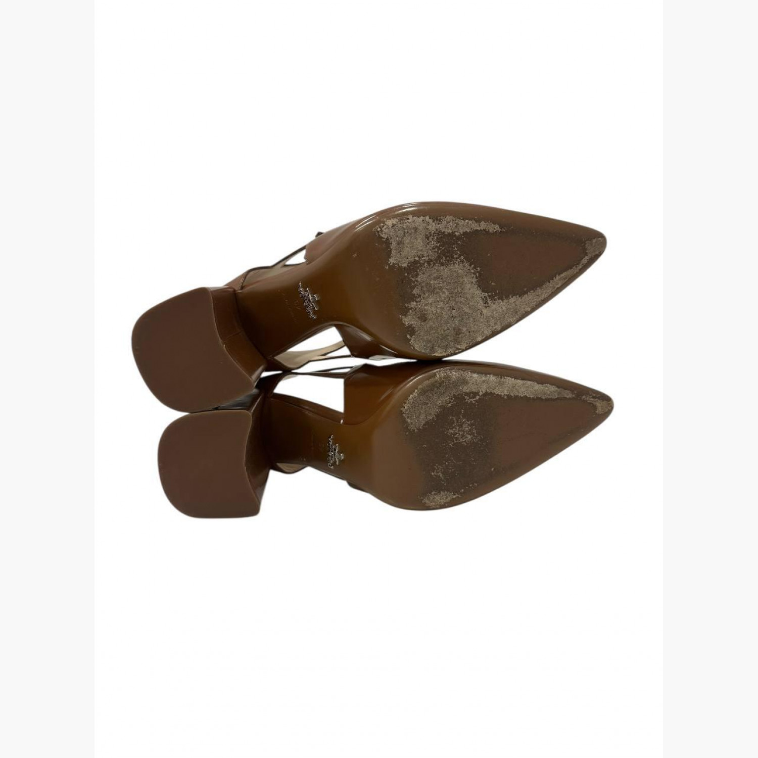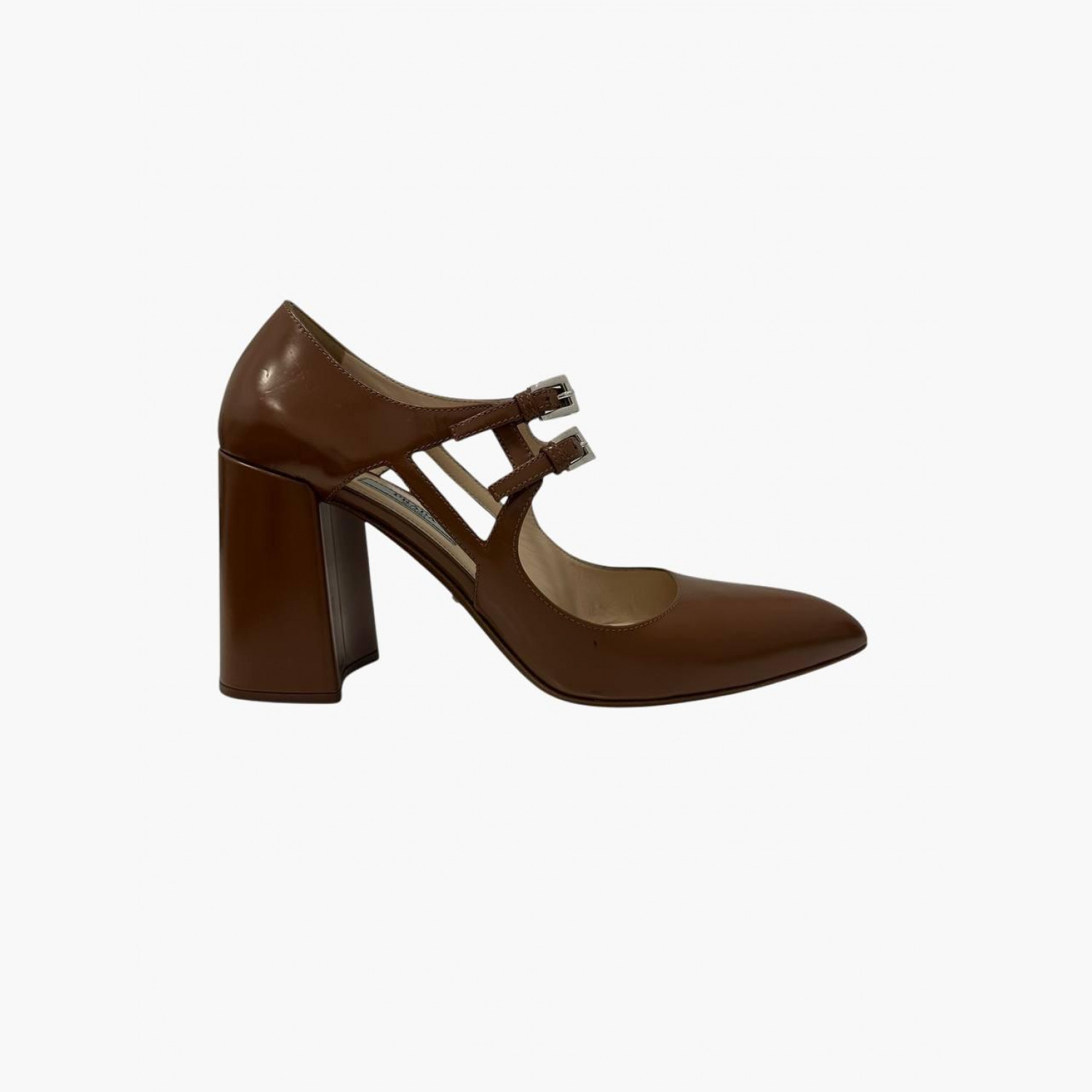 Коричневые кожаные туфли на устойчивом каблуке. В хорошем состоянии, есть потертости и царапины.