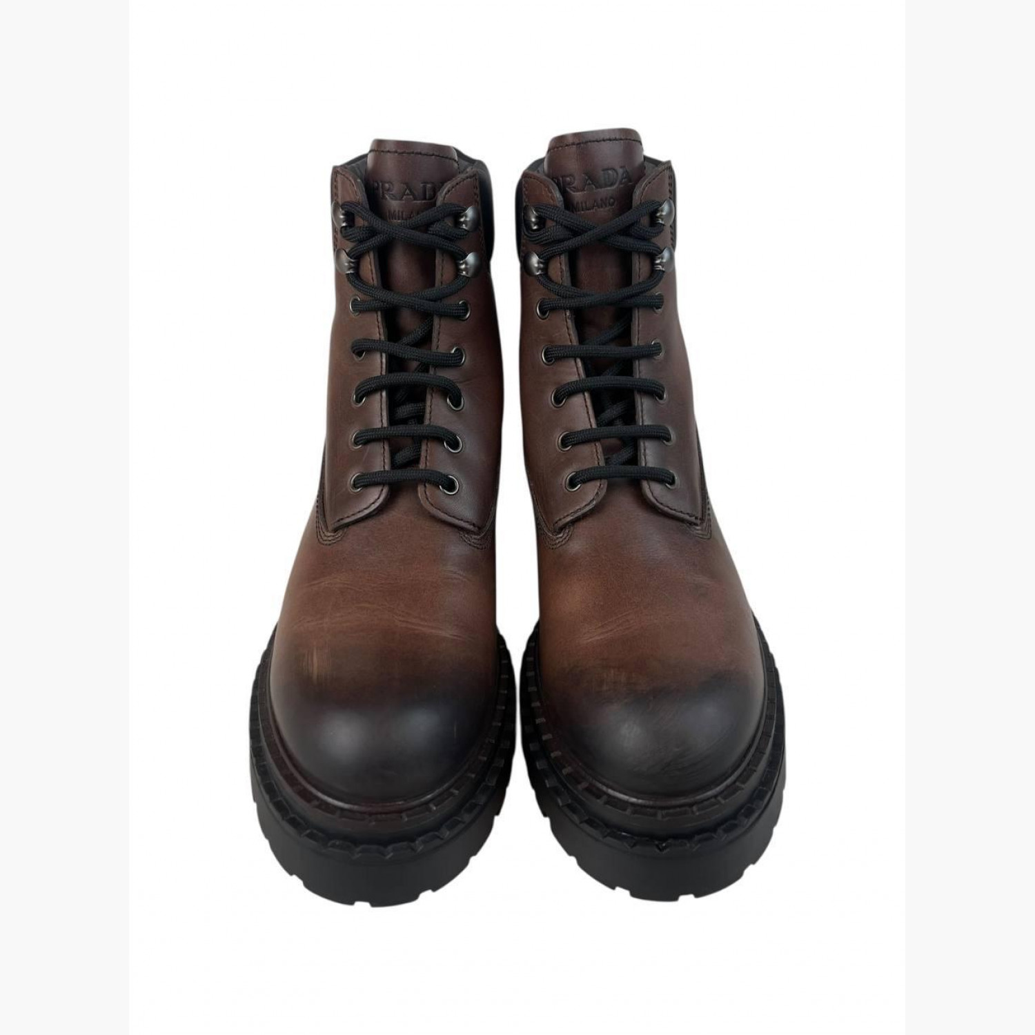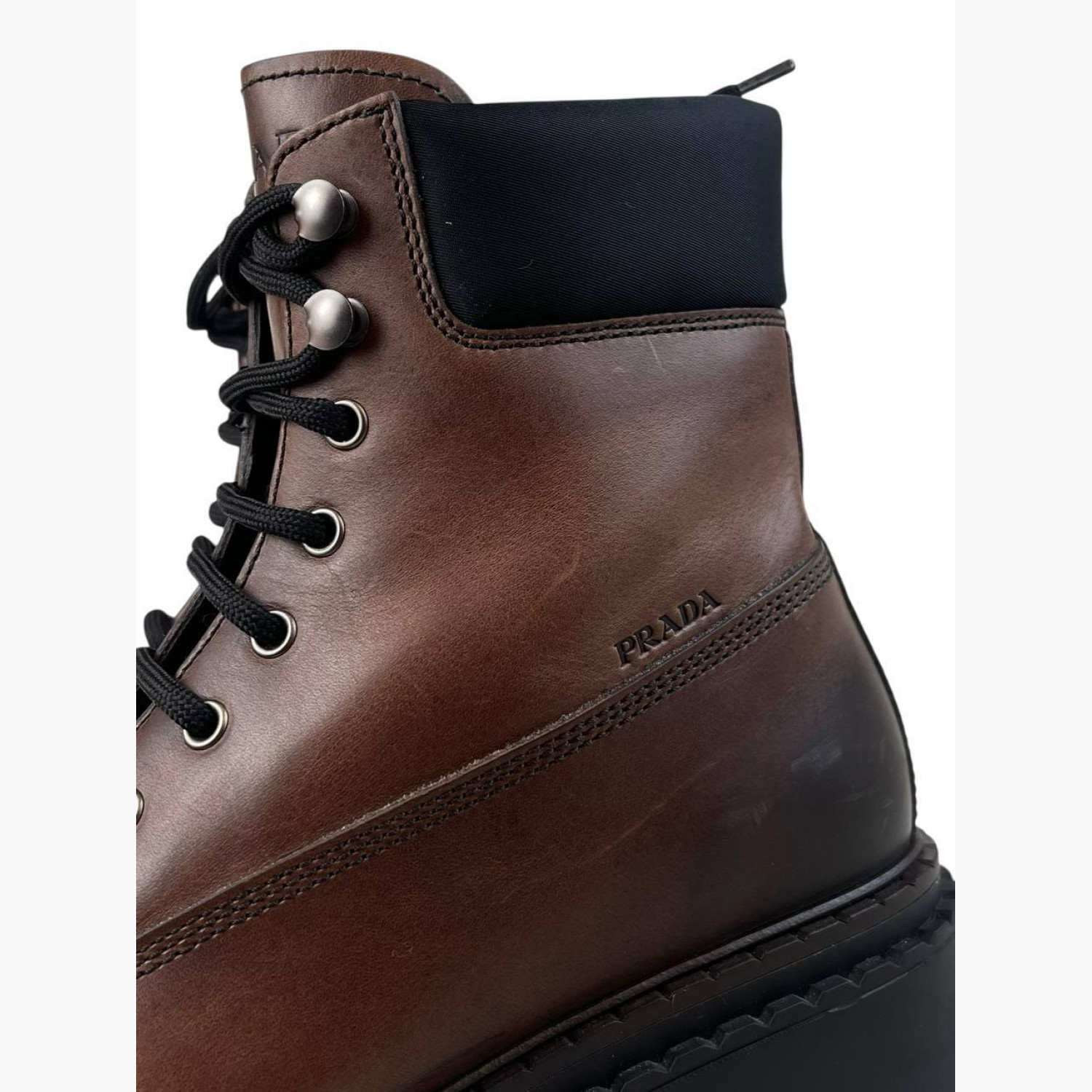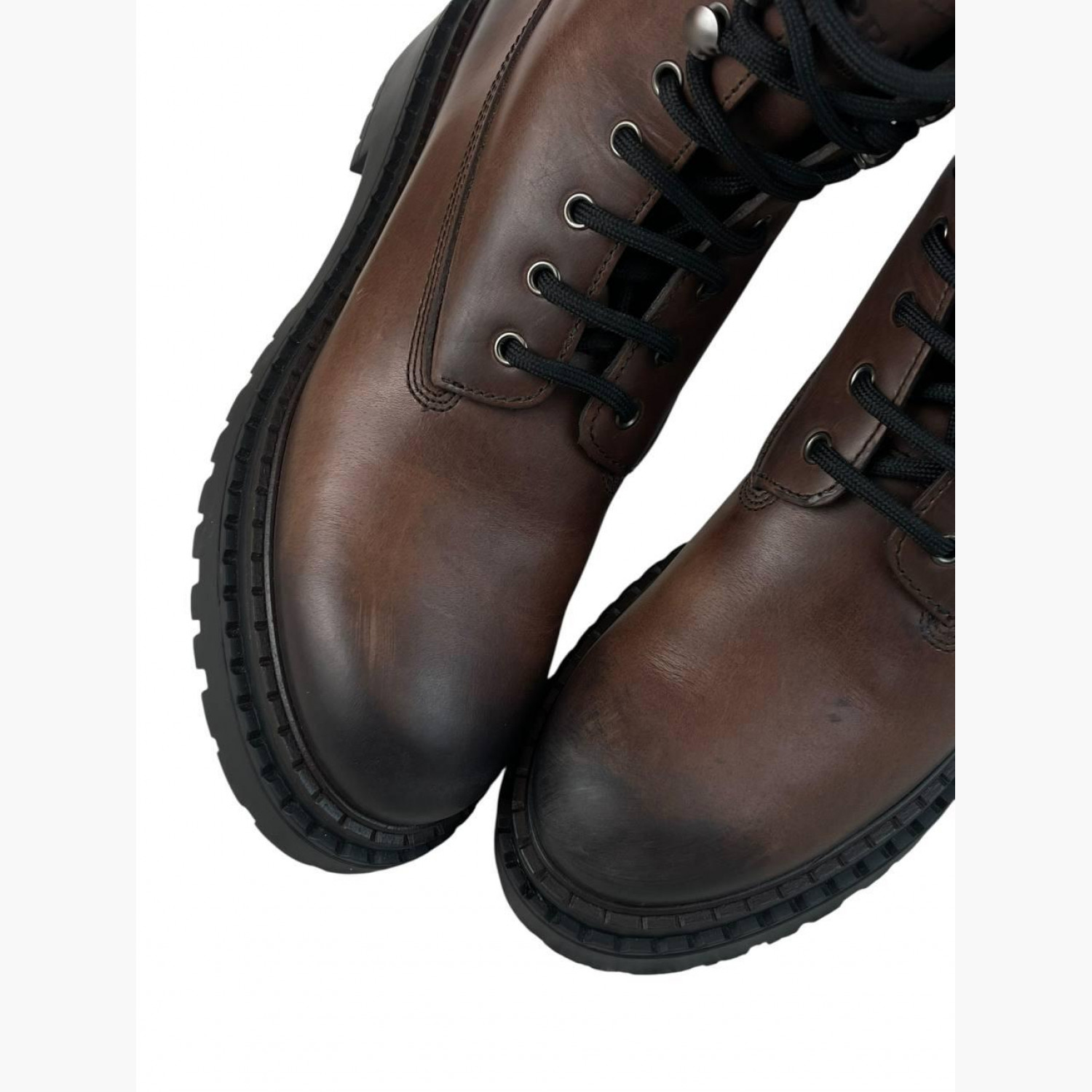Коричневые кожаные ботинки на шнуровке с текстильной вставкой в верхней части. В хорошем состоянии, есть потертости.