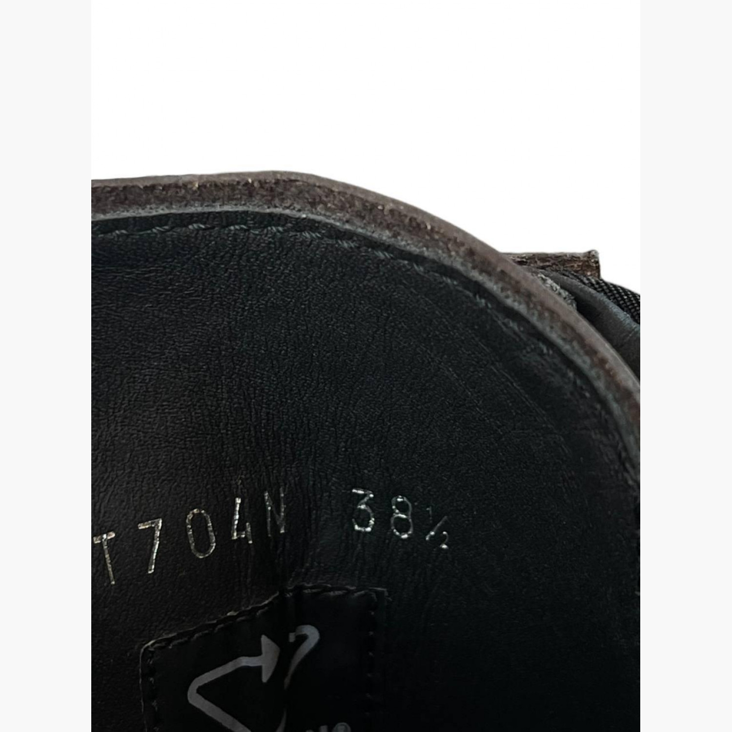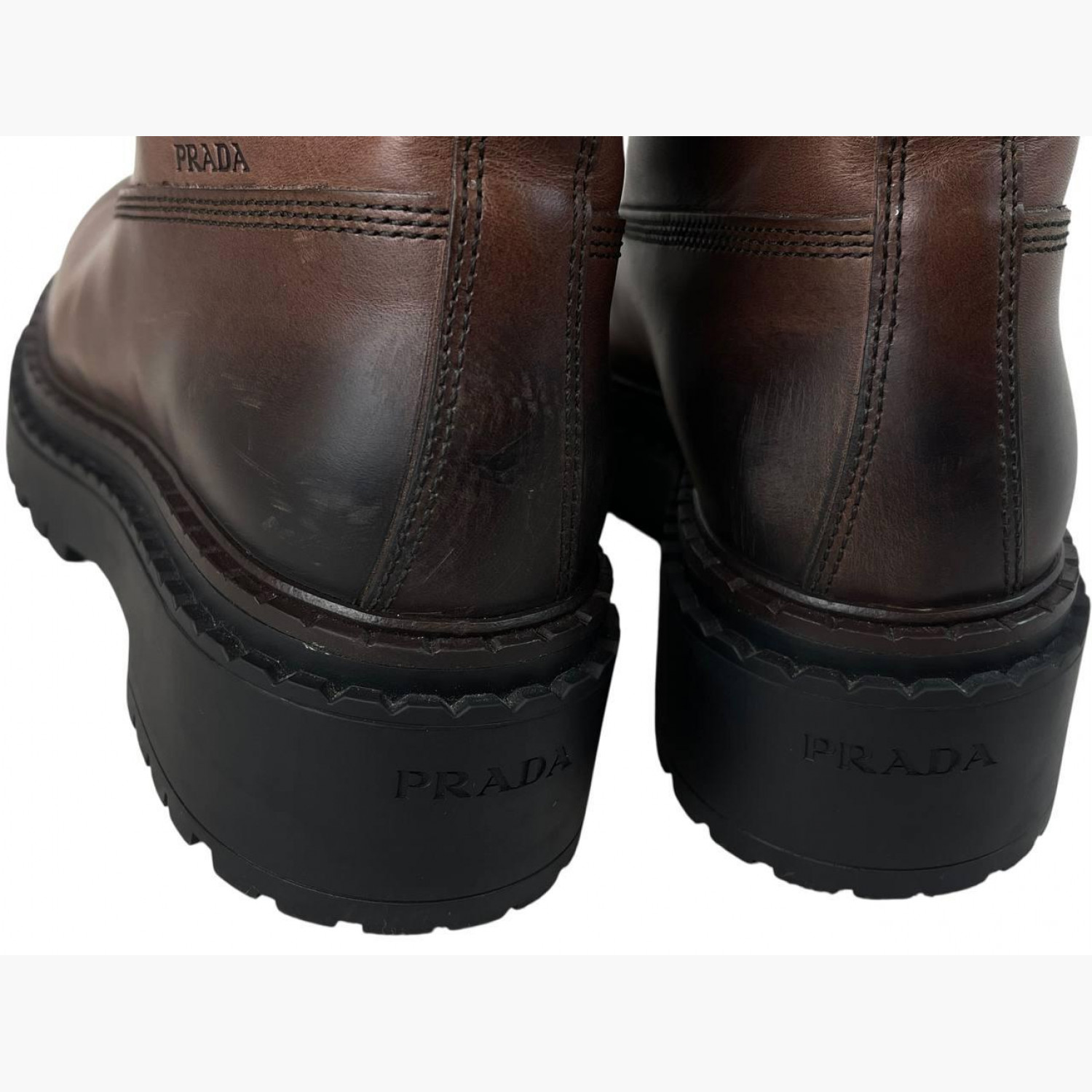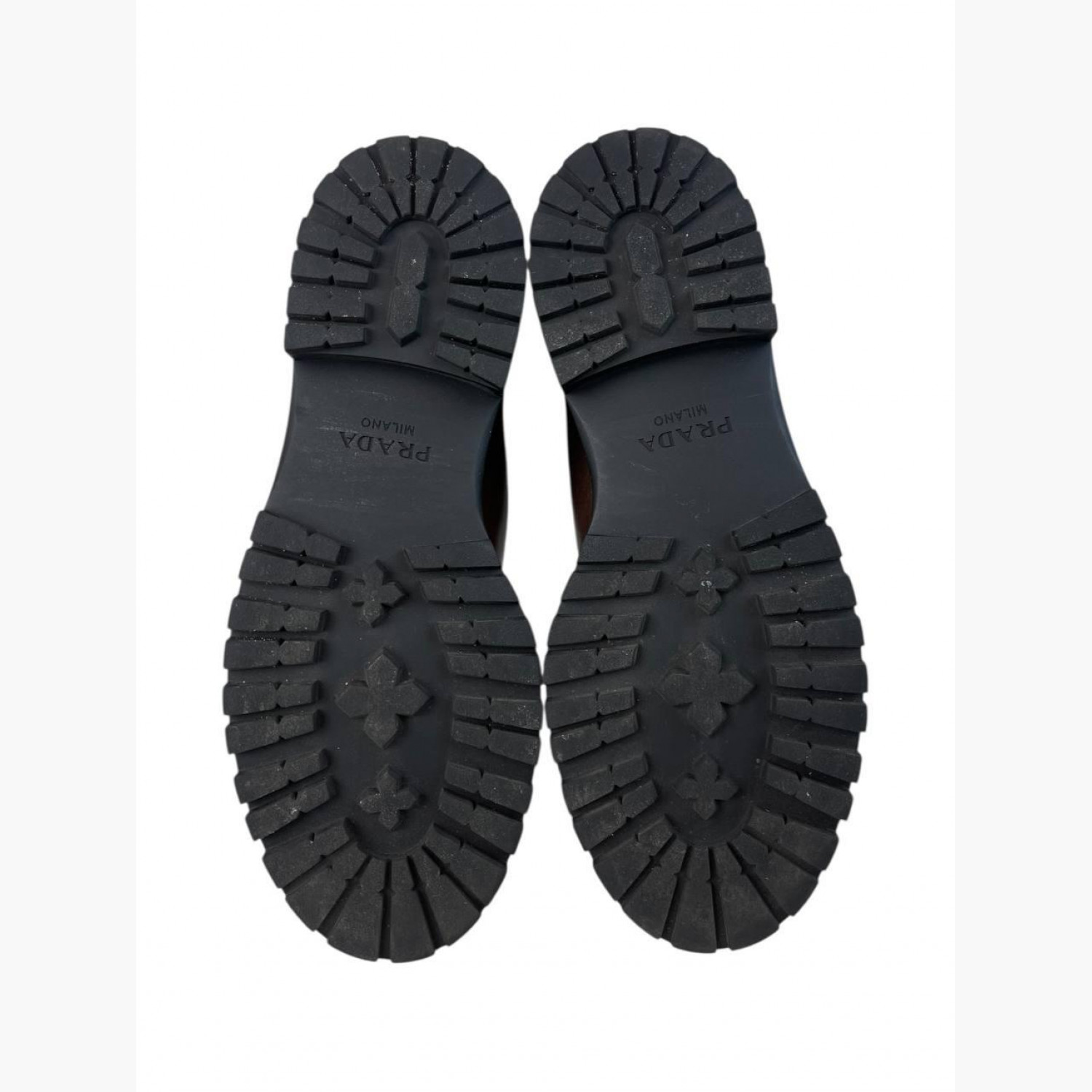 Коричневые кожаные ботинки на шнуровке с текстильной вставкой в верхней части. В хорошем состоянии, есть потертости.
