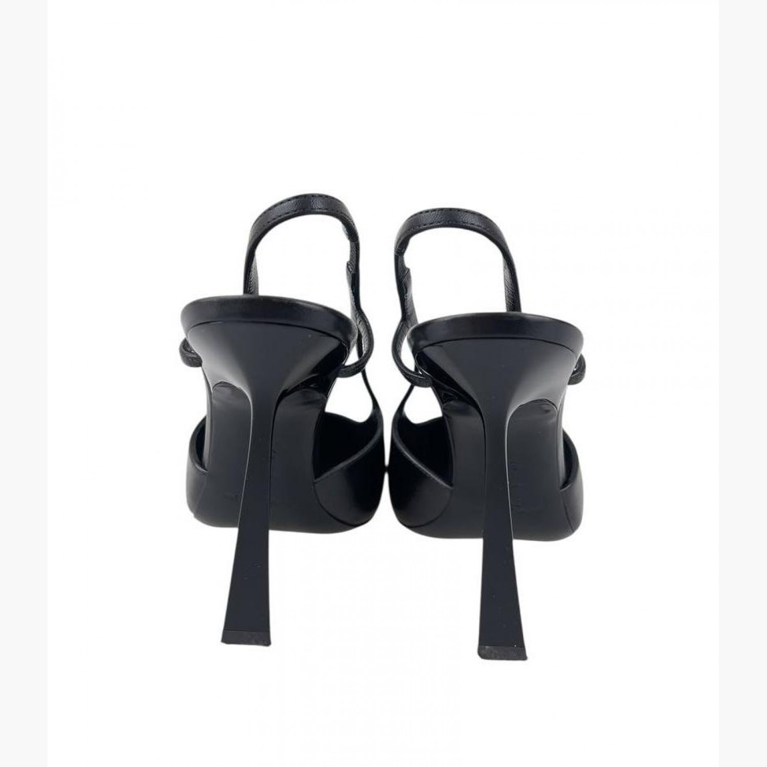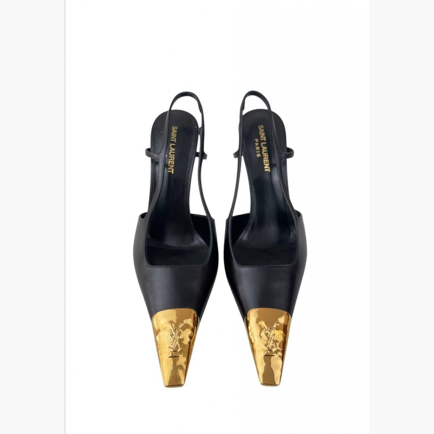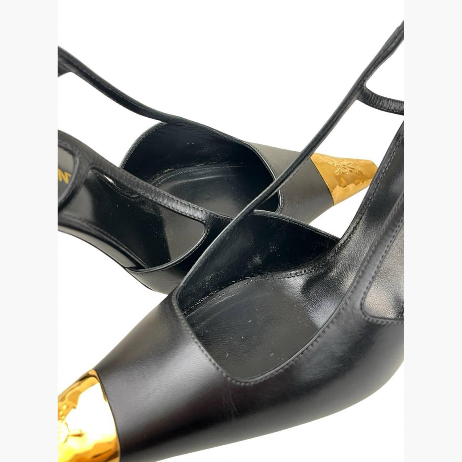 Черные кожаные туфли с металлическим элементом. В хорошем состоянии, есть незначительные следы носки.