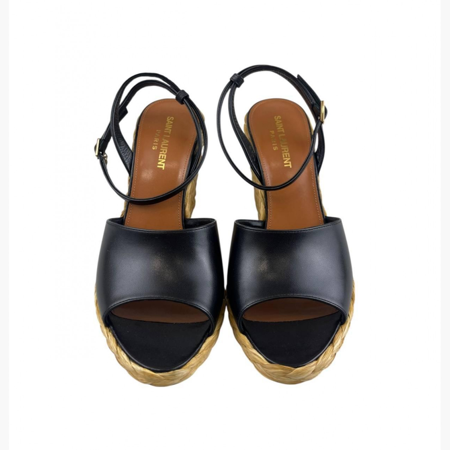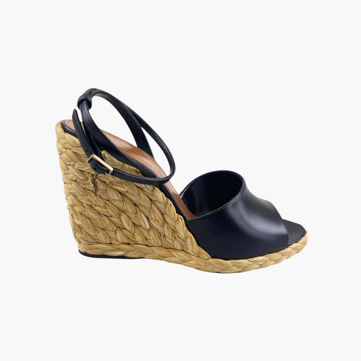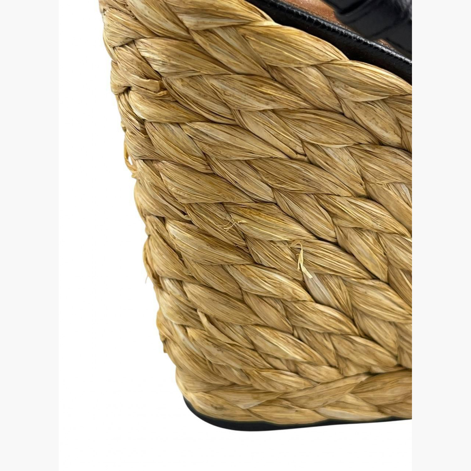 Чёрные кожаные босоножки на плетёной танкетке. Абсолютно новые, с незначительными следами примерки на подошве.