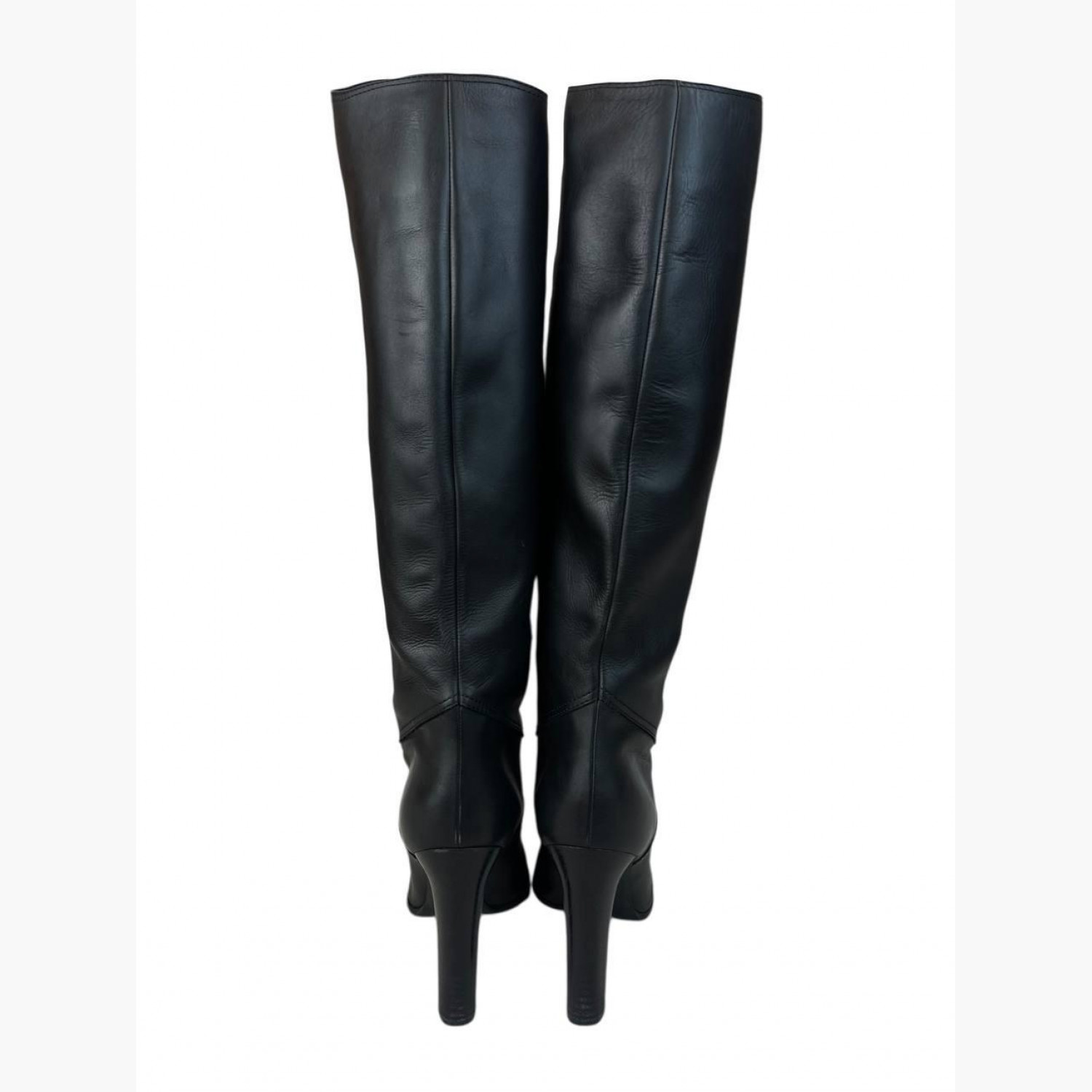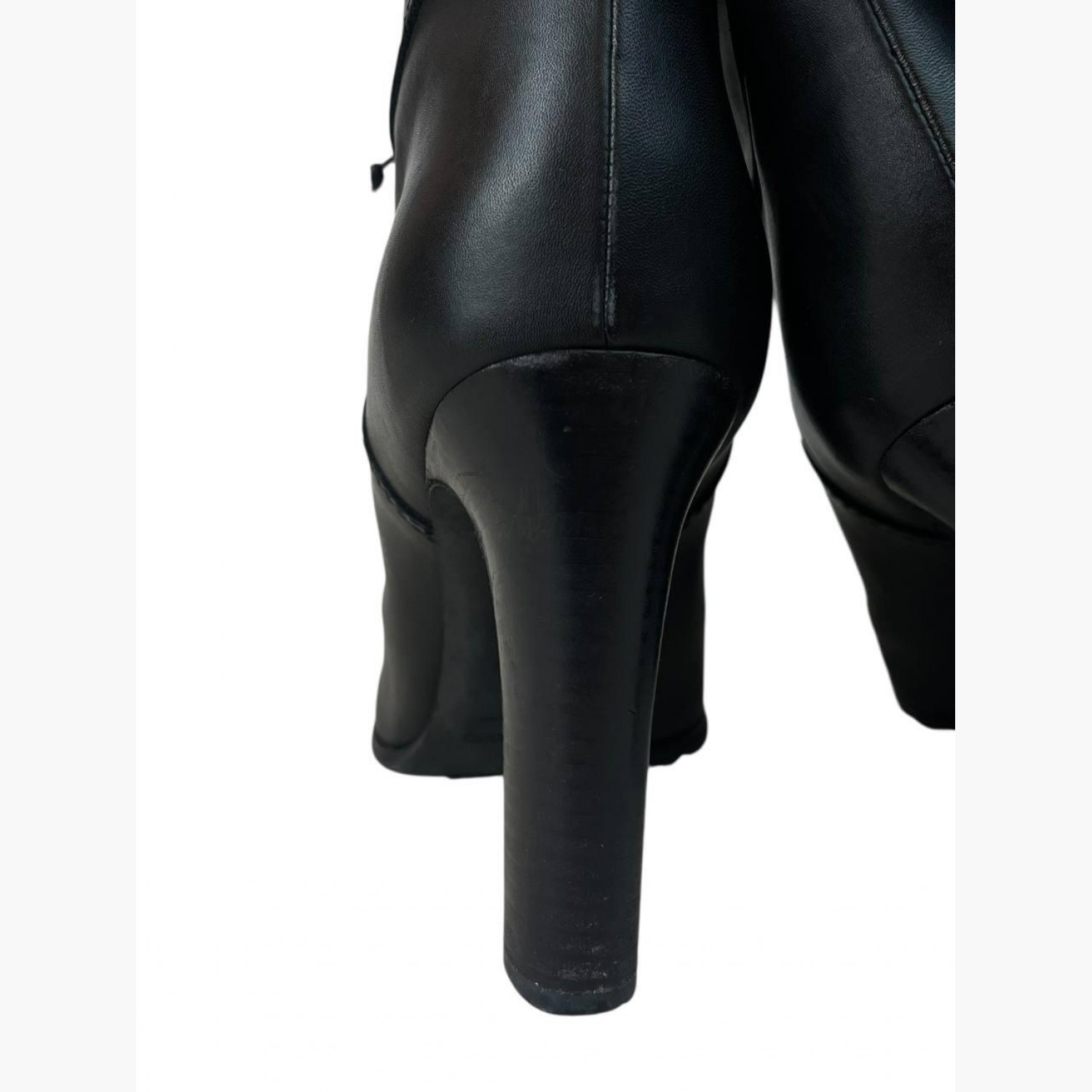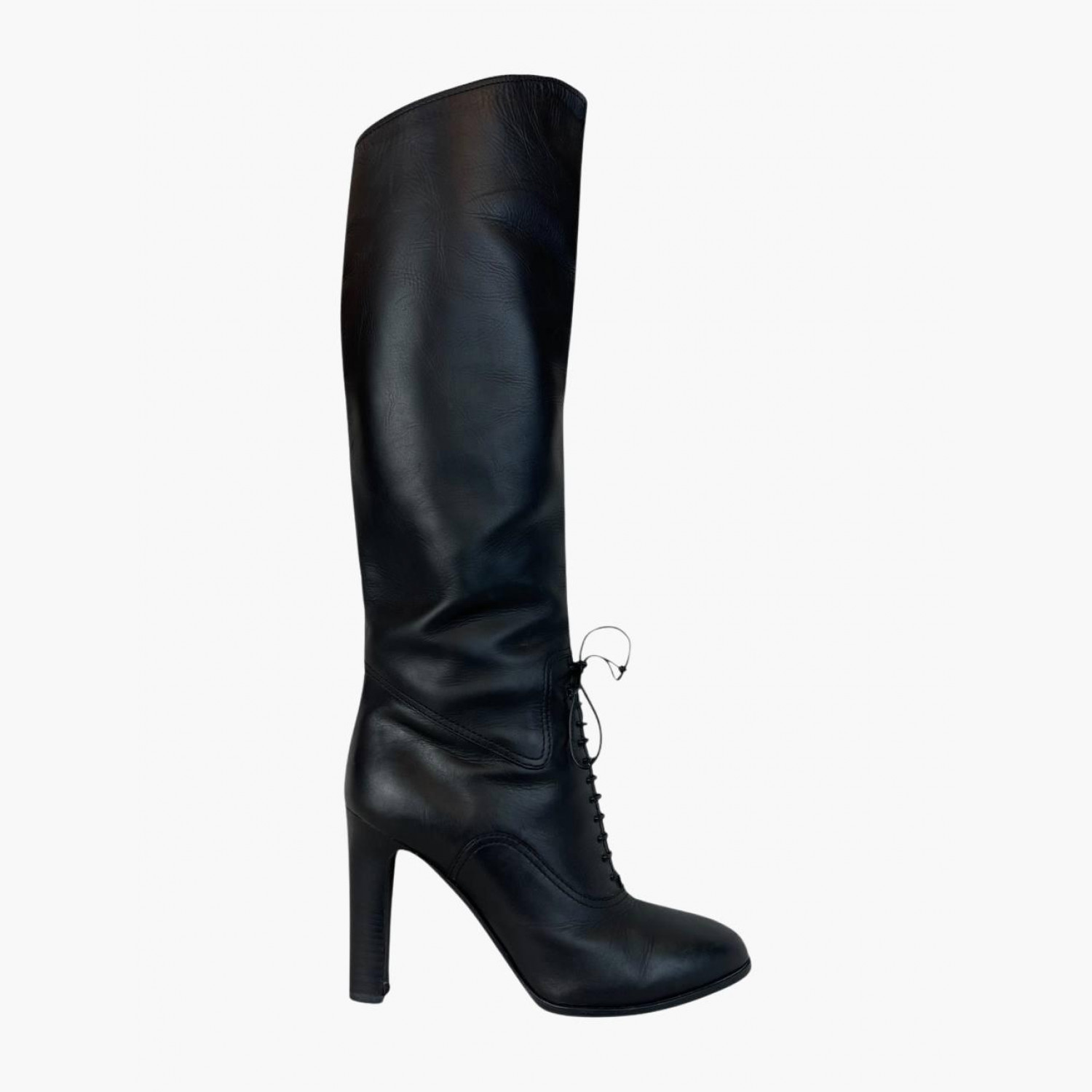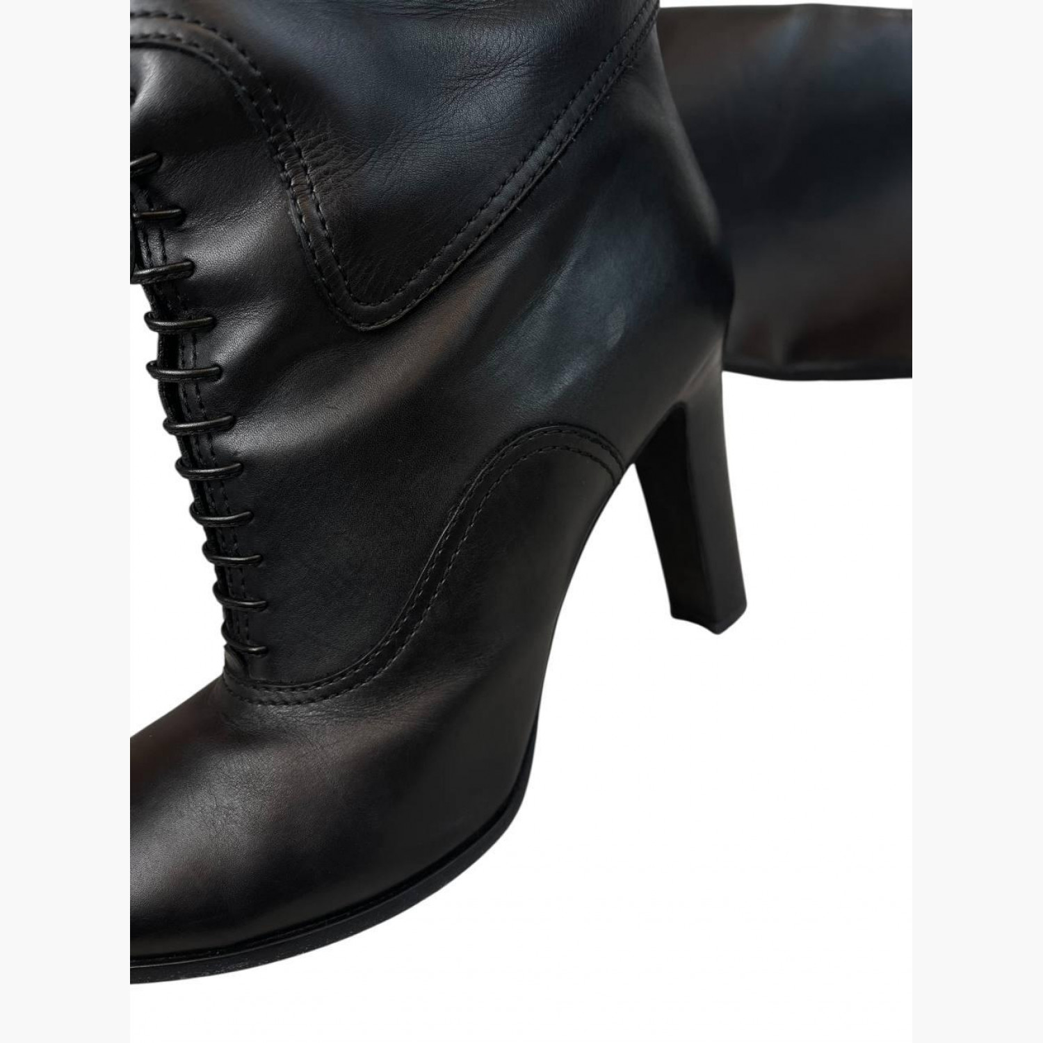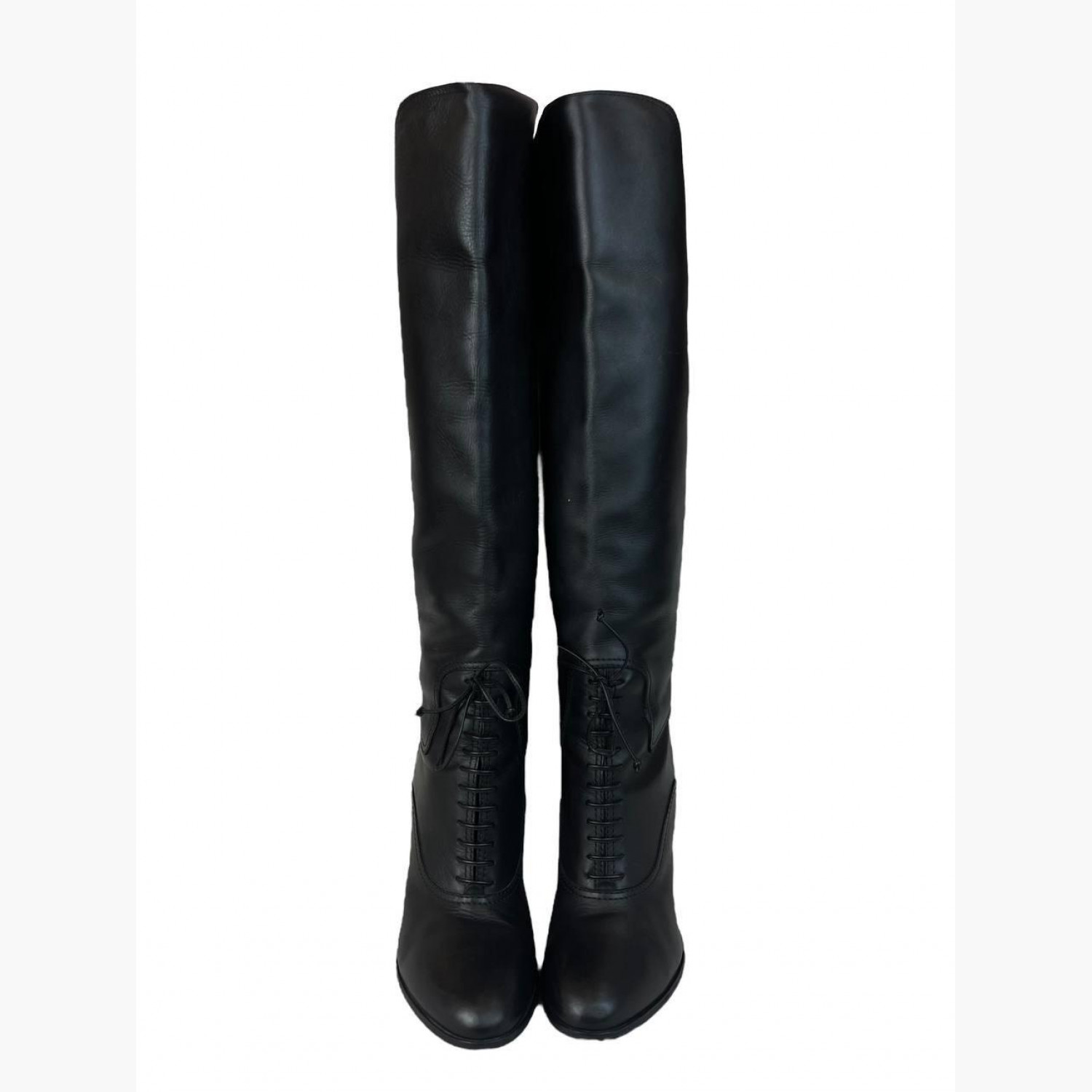 Черные высокие сапоги выполнены из кожи с декоративной шнуровкой. В хорошем состоянии, есть следы носки.