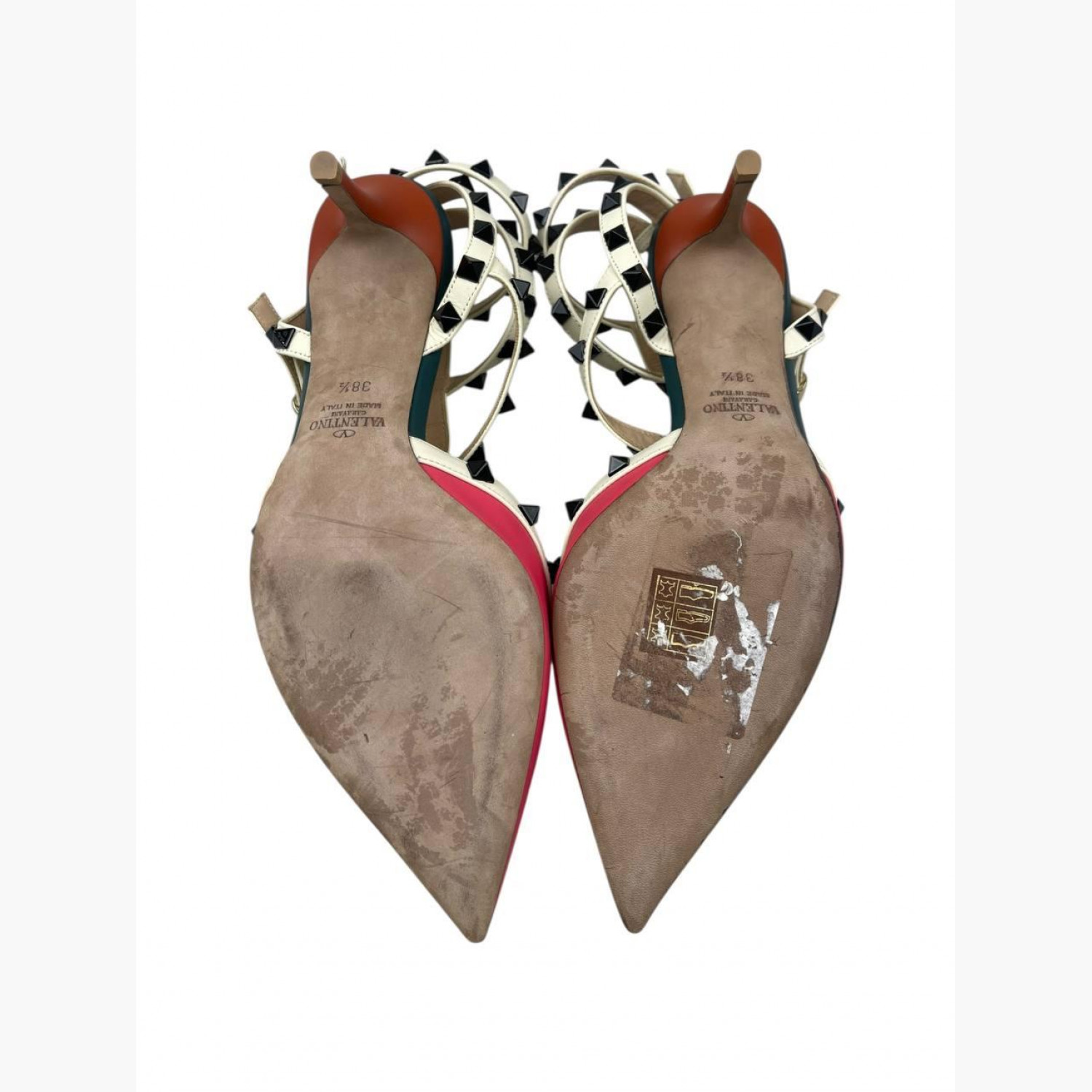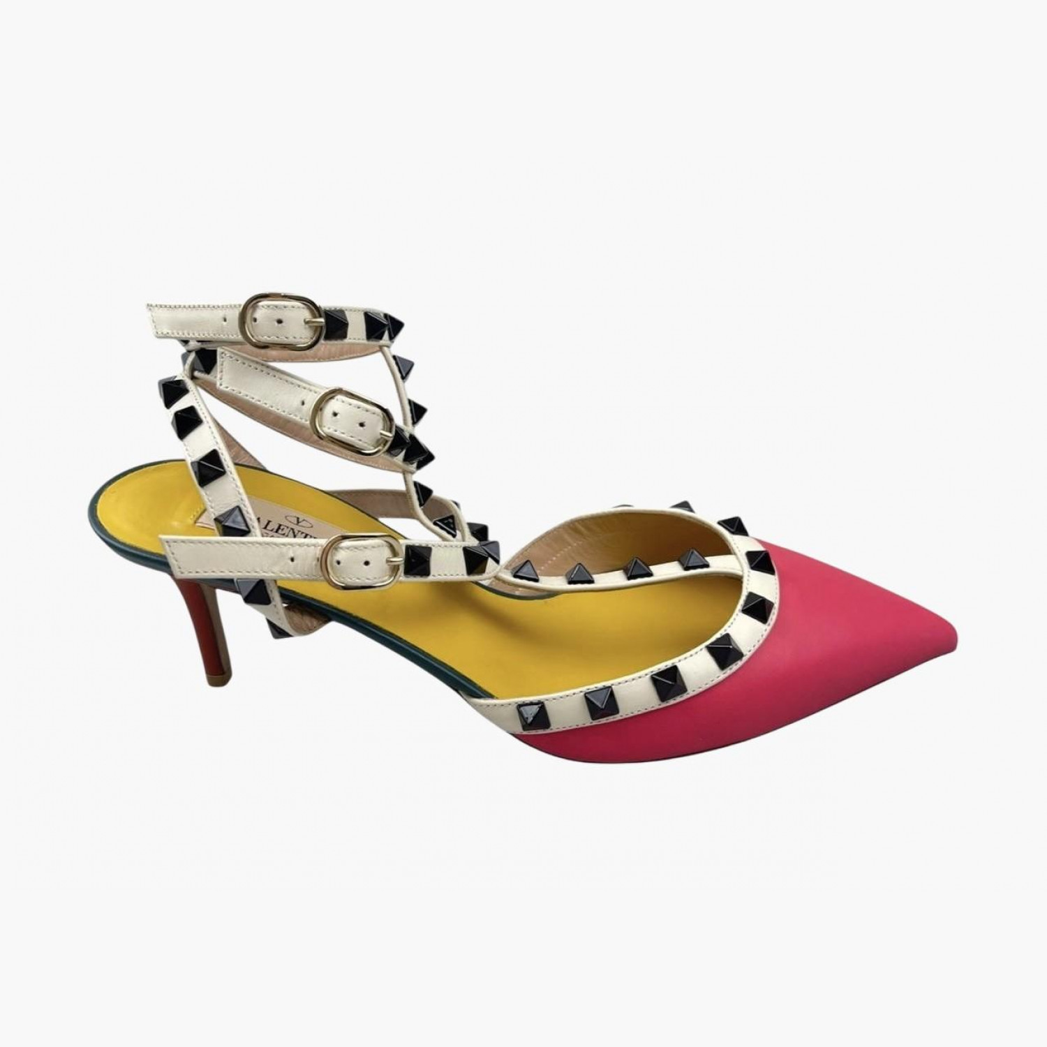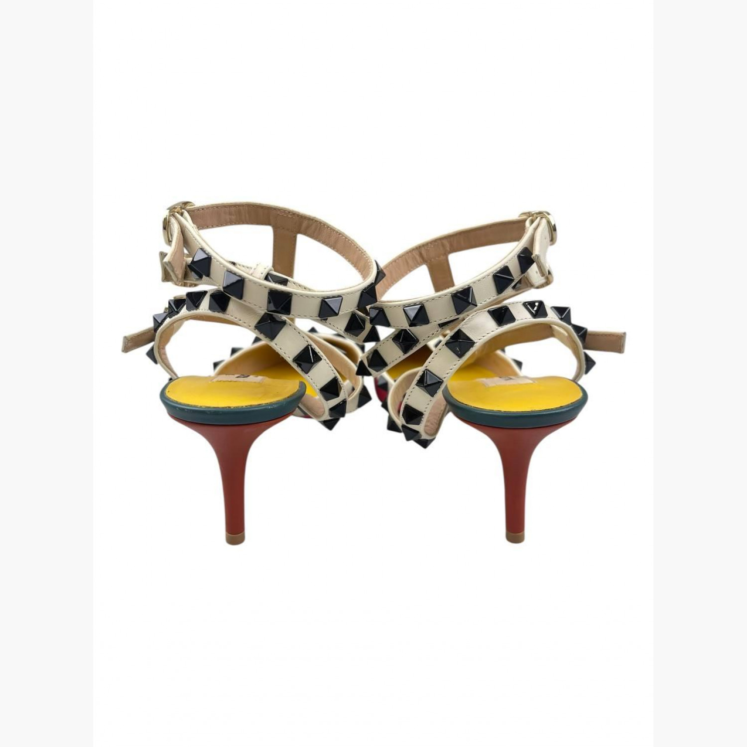 Кожаные босоножки выполнены в трёх цветах — жёлтом, розовом и оранжевом, с тремя белыми пряжками, украшенными чёрными шипами. В хорошем состоянии, есть незначительные следы носки.