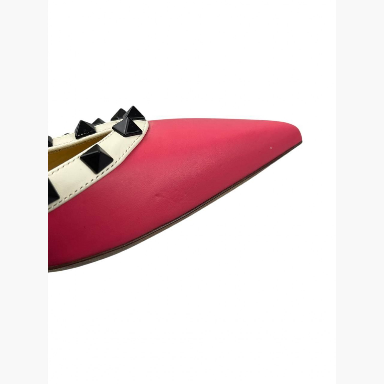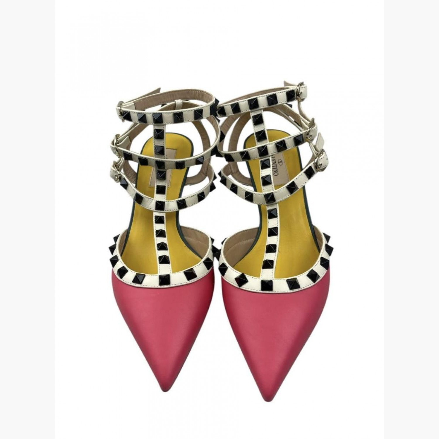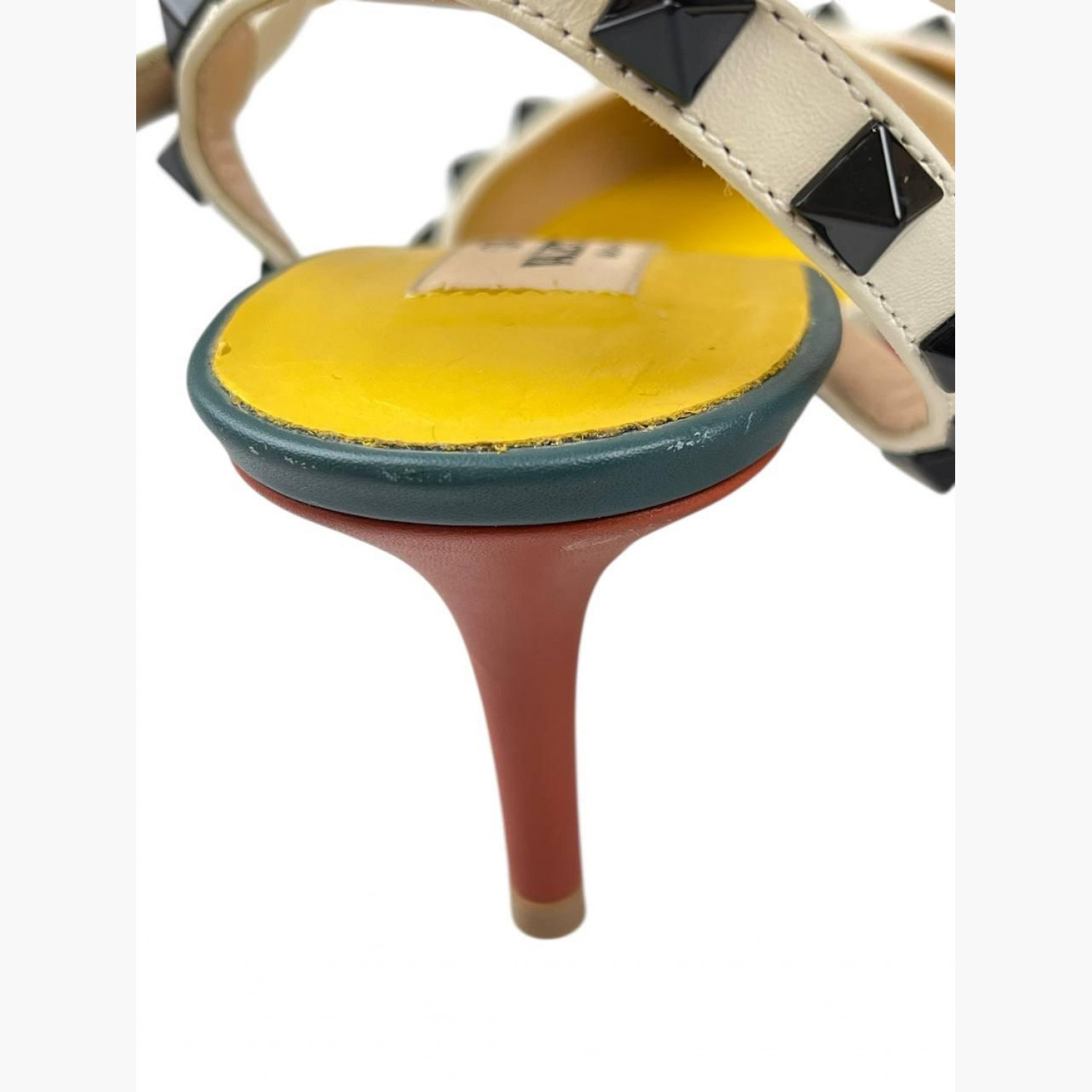 Кожаные босоножки выполнены в трёх цветах — жёлтом, розовом и оранжевом, с тремя белыми пряжками, украшенными чёрными шипами. В хорошем состоянии, есть незначительные следы носки.