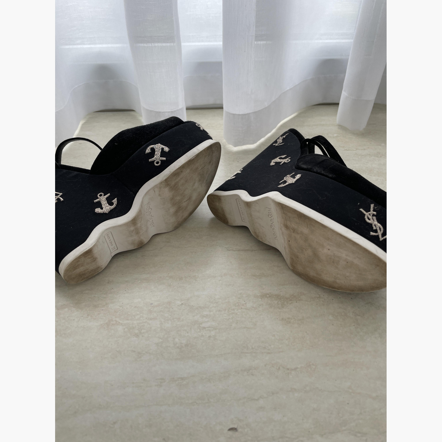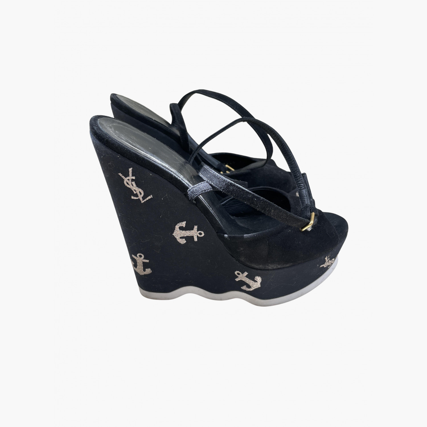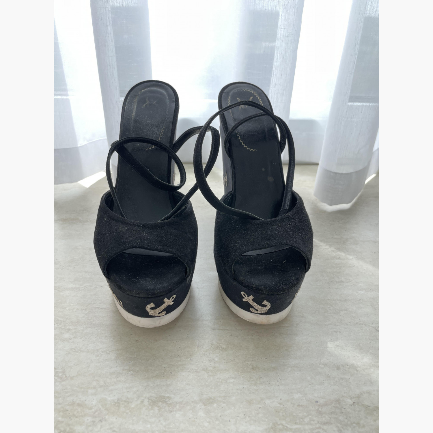 Редкая модель босоножек на танкетке из тёмно-синей замши с вышивкой в морском стиле. В хорошем состоянии.