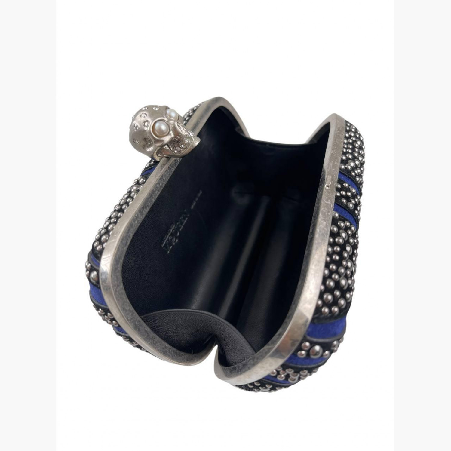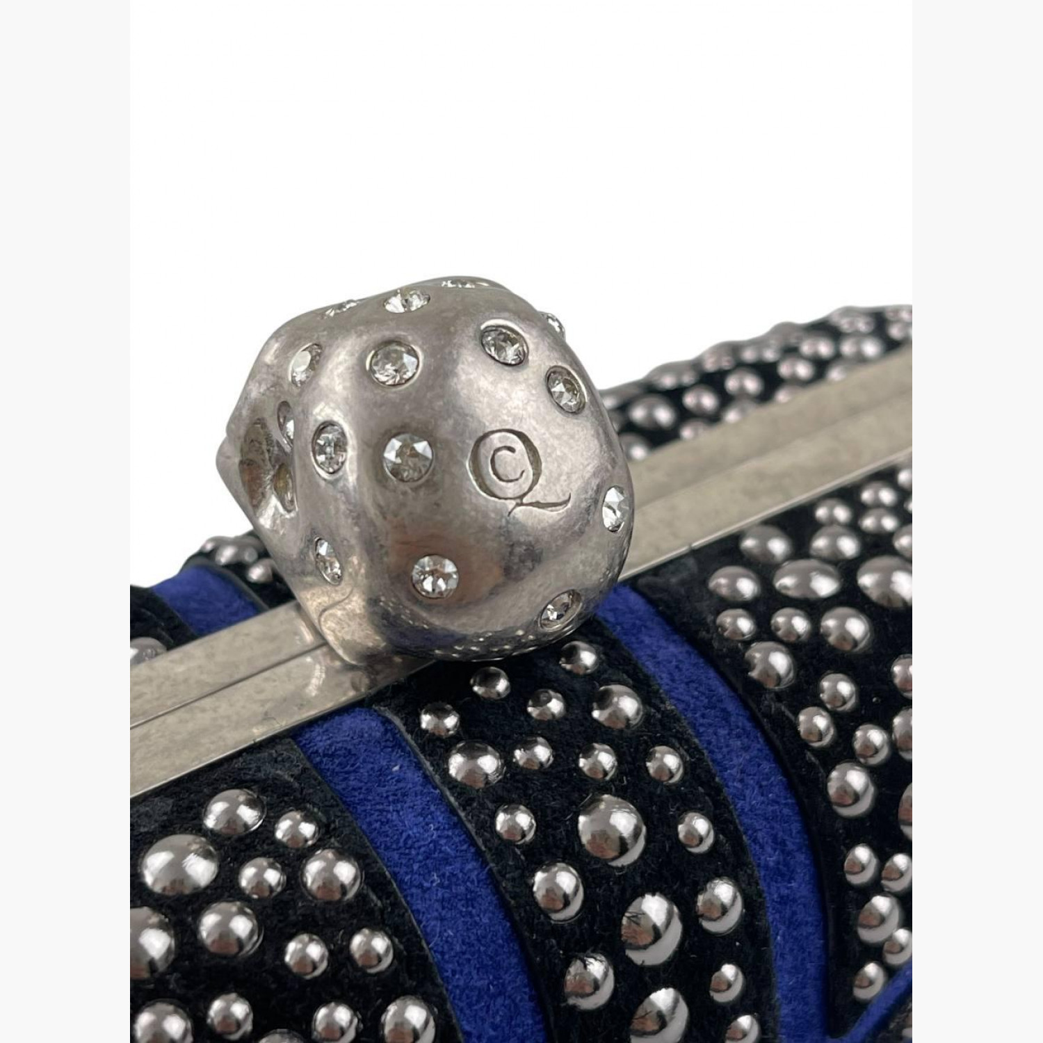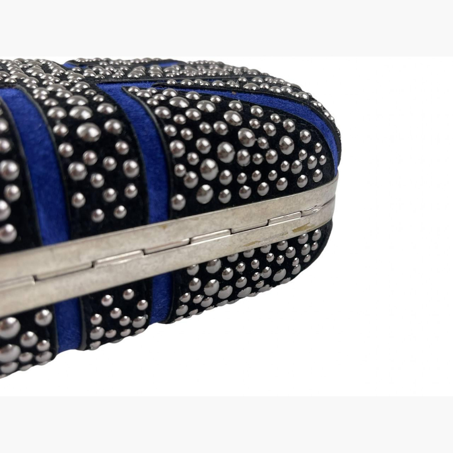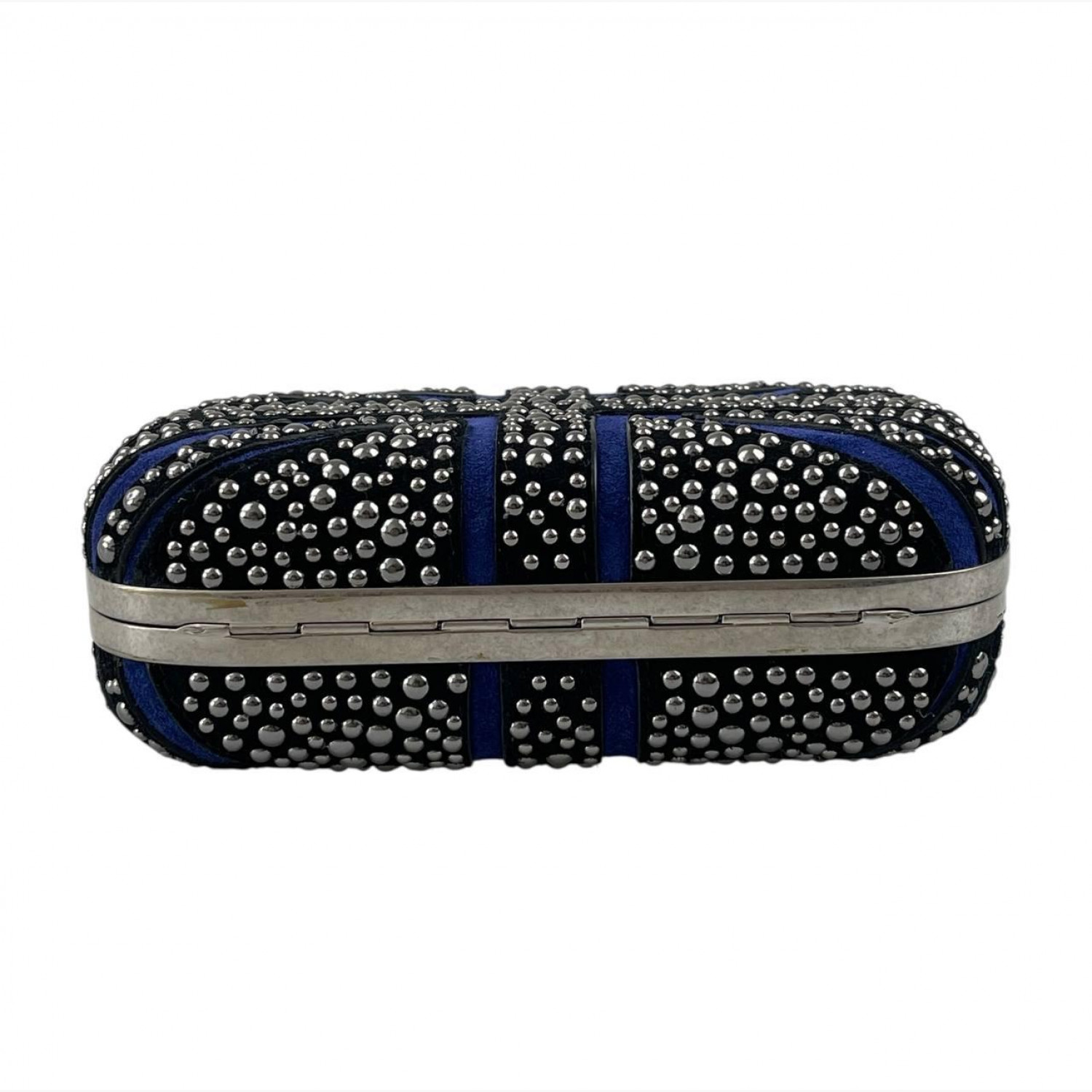 Черный клатч с синими полосами. Внутри одно основное отделение. В хорошем состоянии, есть следы носки.