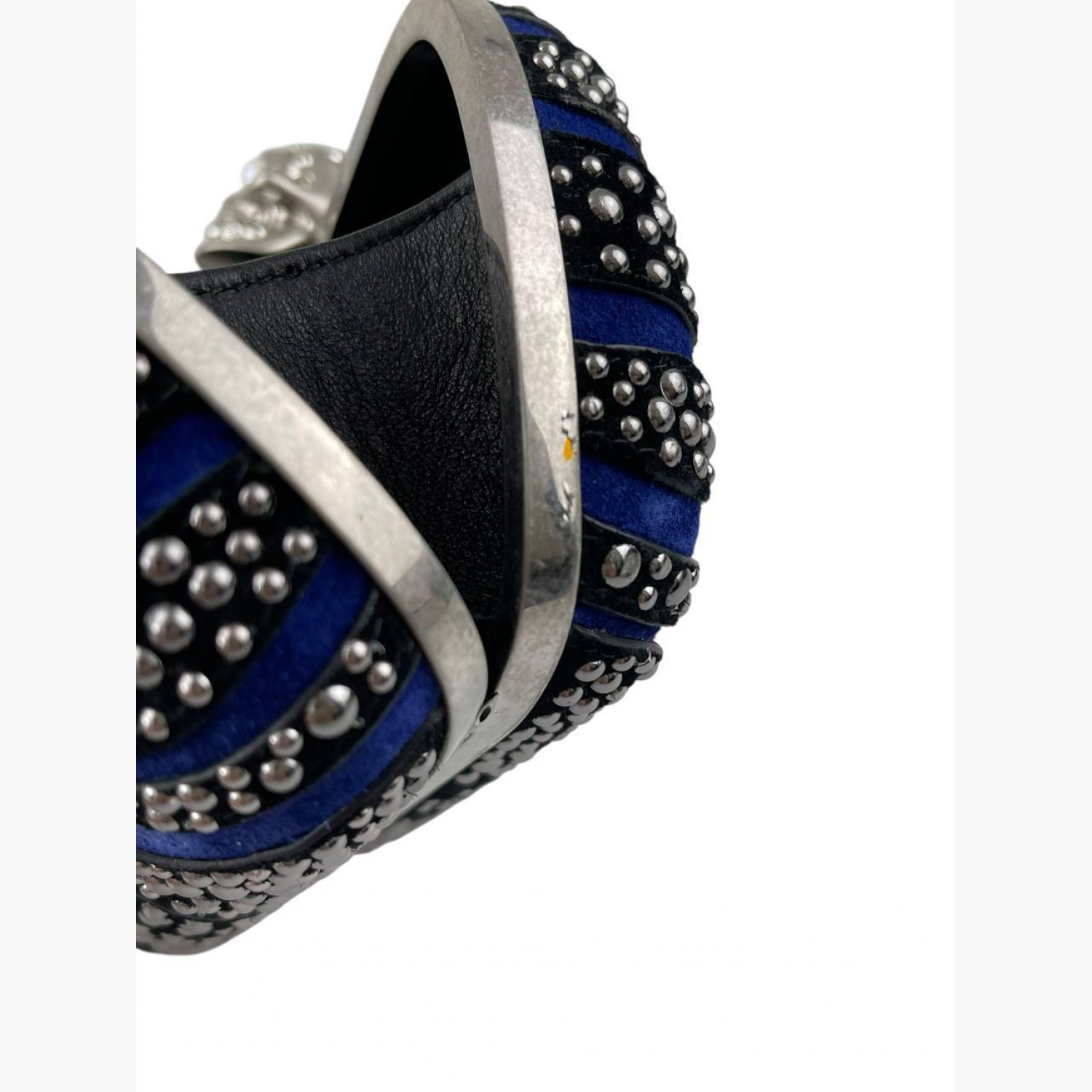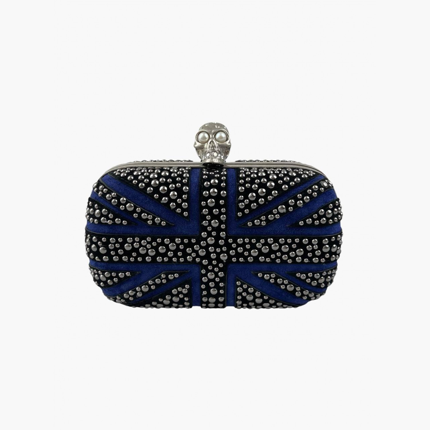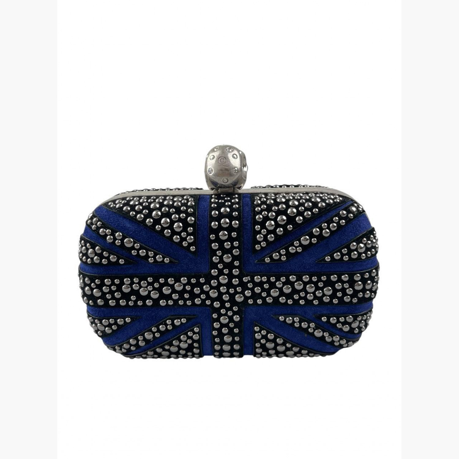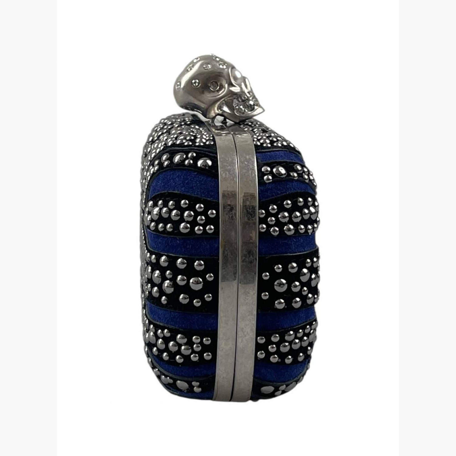 Черный клатч с синими полосами. Внутри одно основное отделение. В хорошем состоянии, есть следы носки.