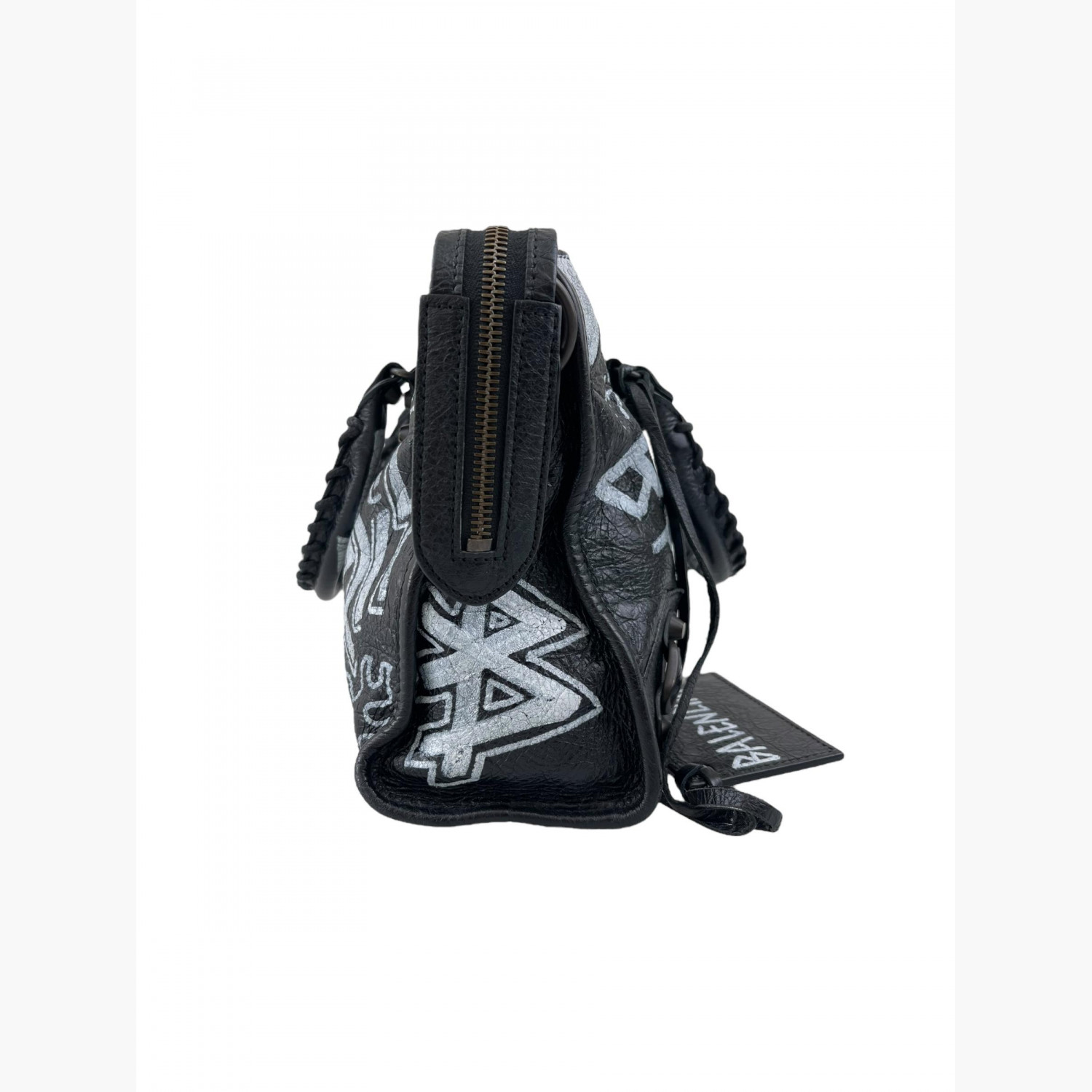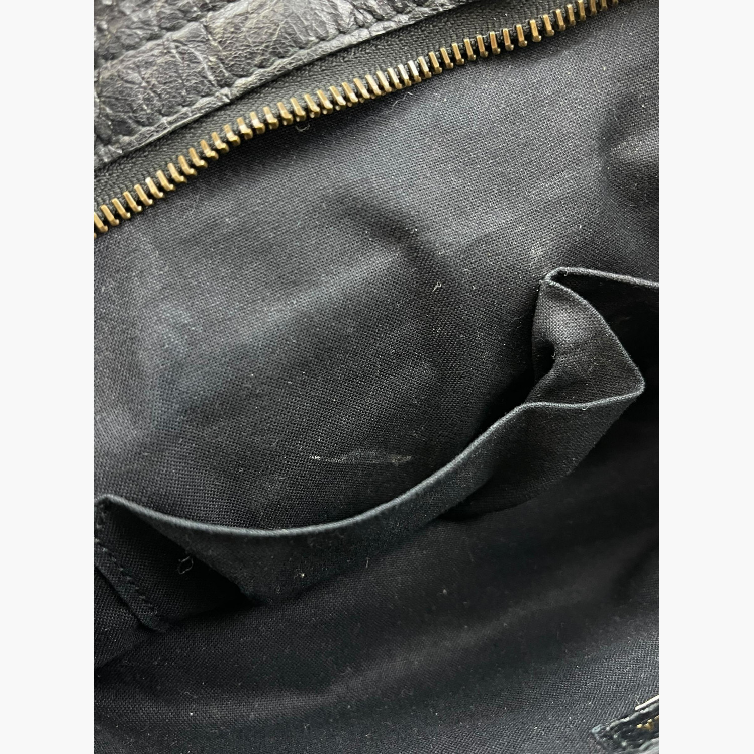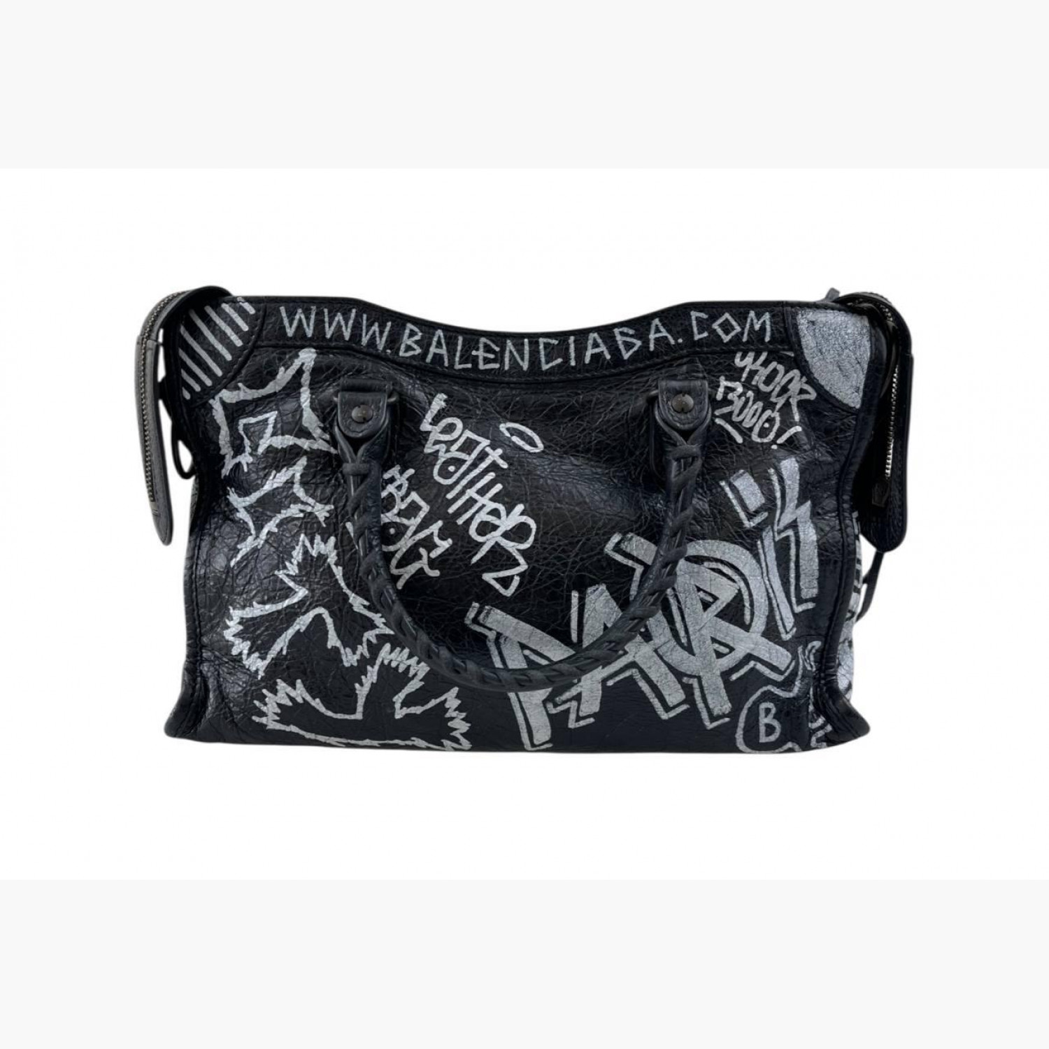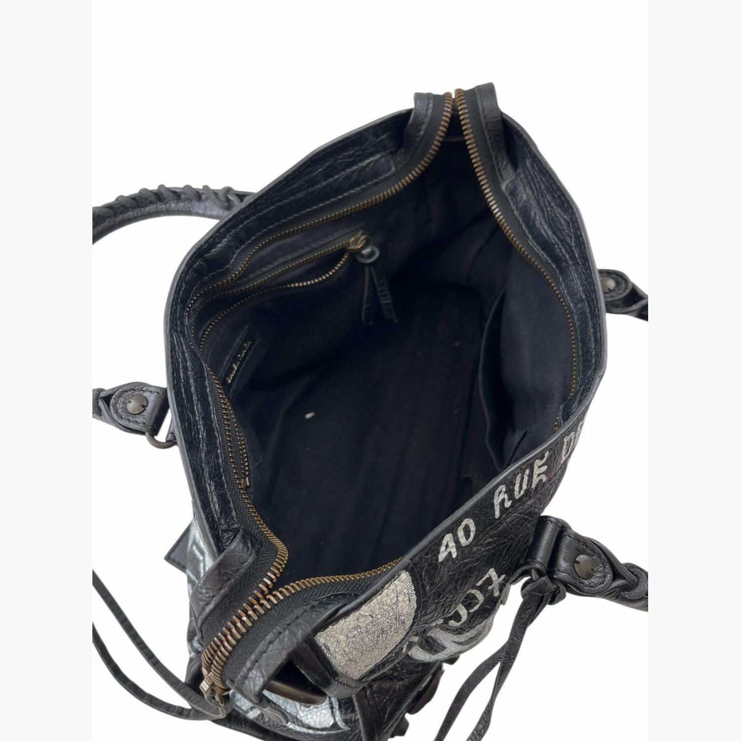 Чёрная кожаная сумка с надписями и зеркальцем. Внутри одно основное отделение, карман на молнии, с противоположной стороны — двойной открытый карман, а спереди — карман на молнии. В хорошем состоянии, есть следы носки и потёртости.