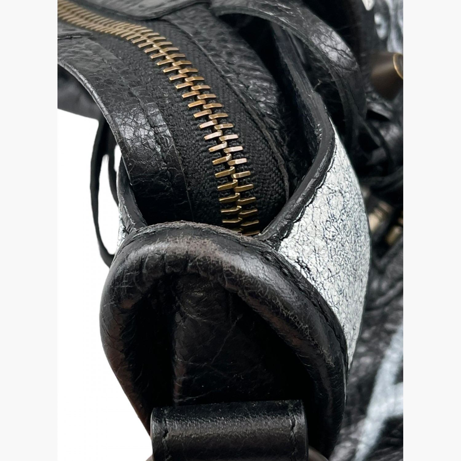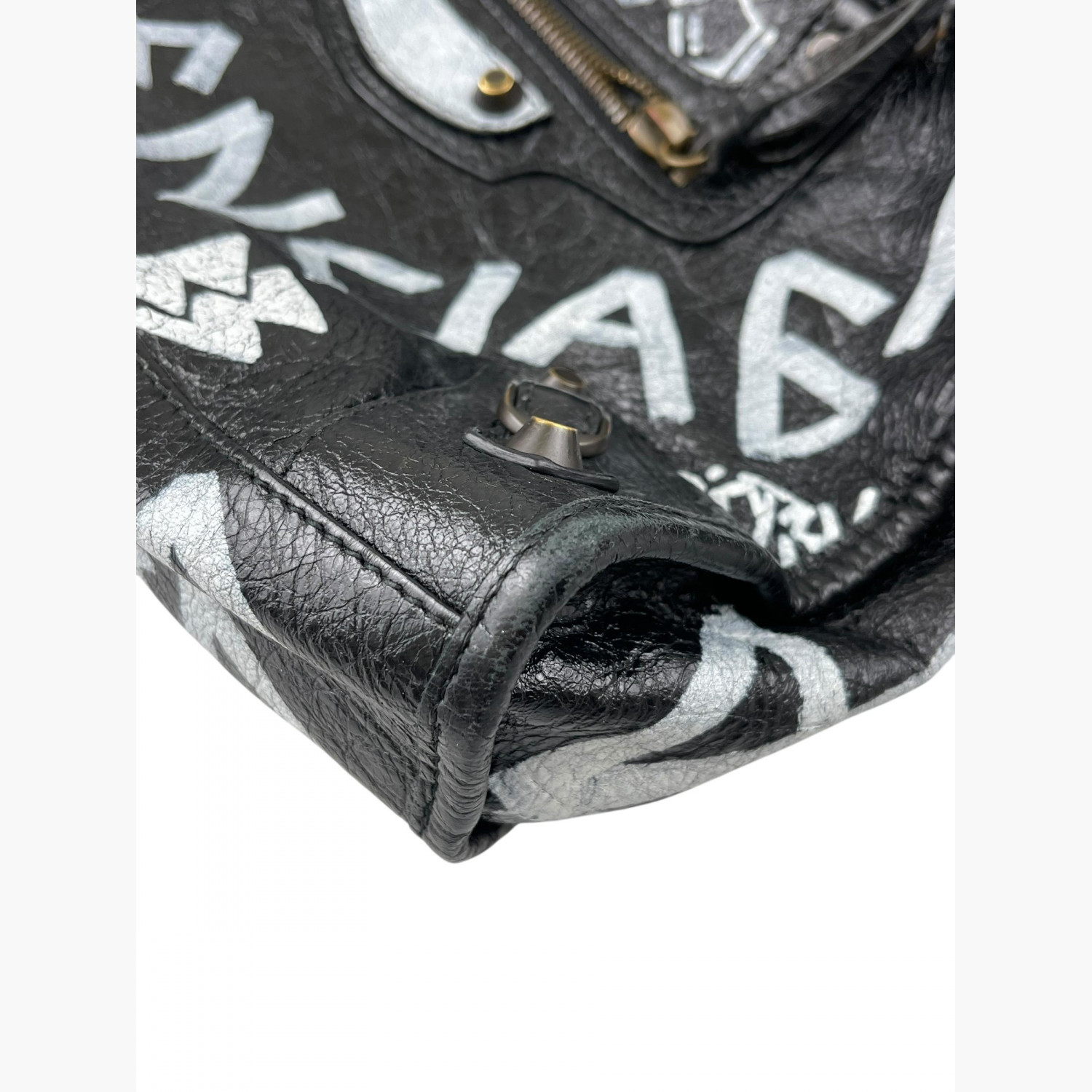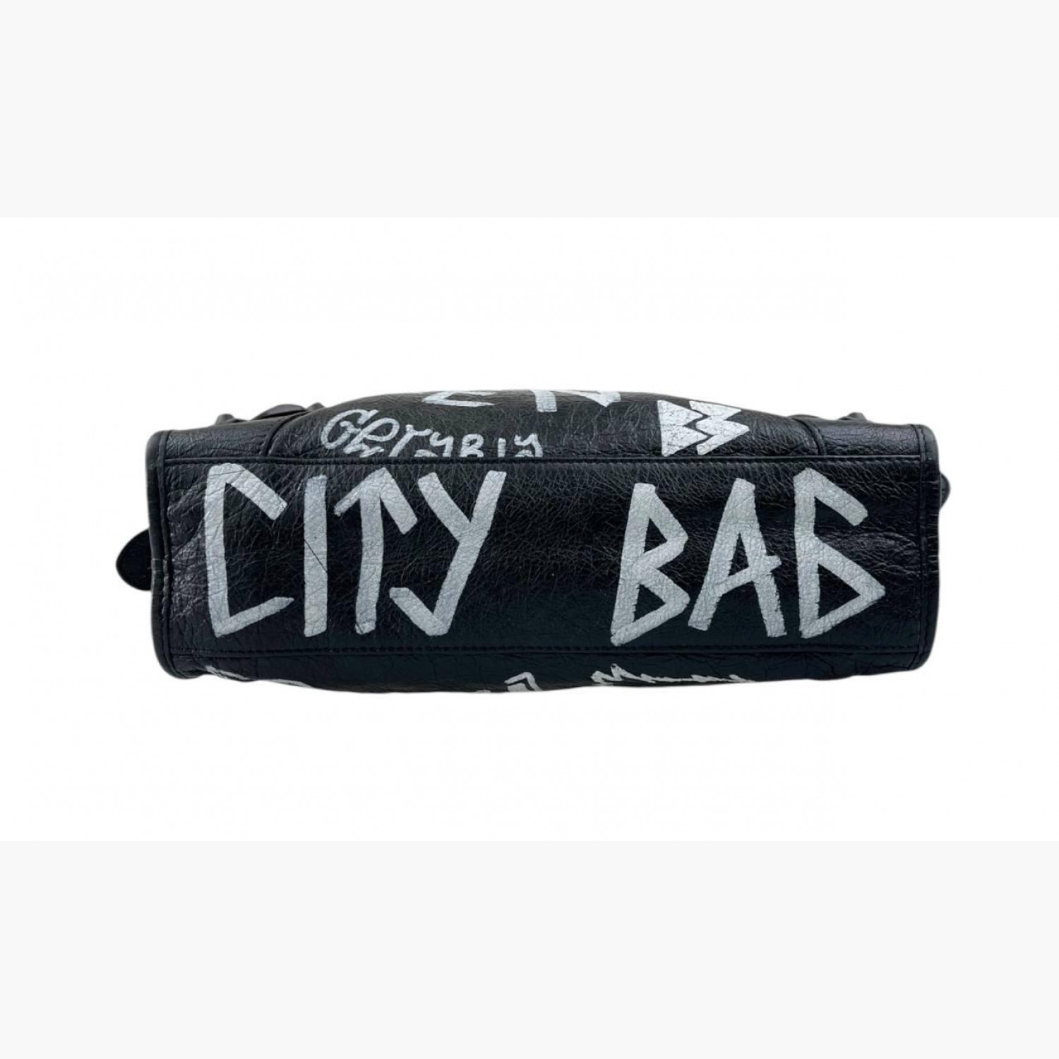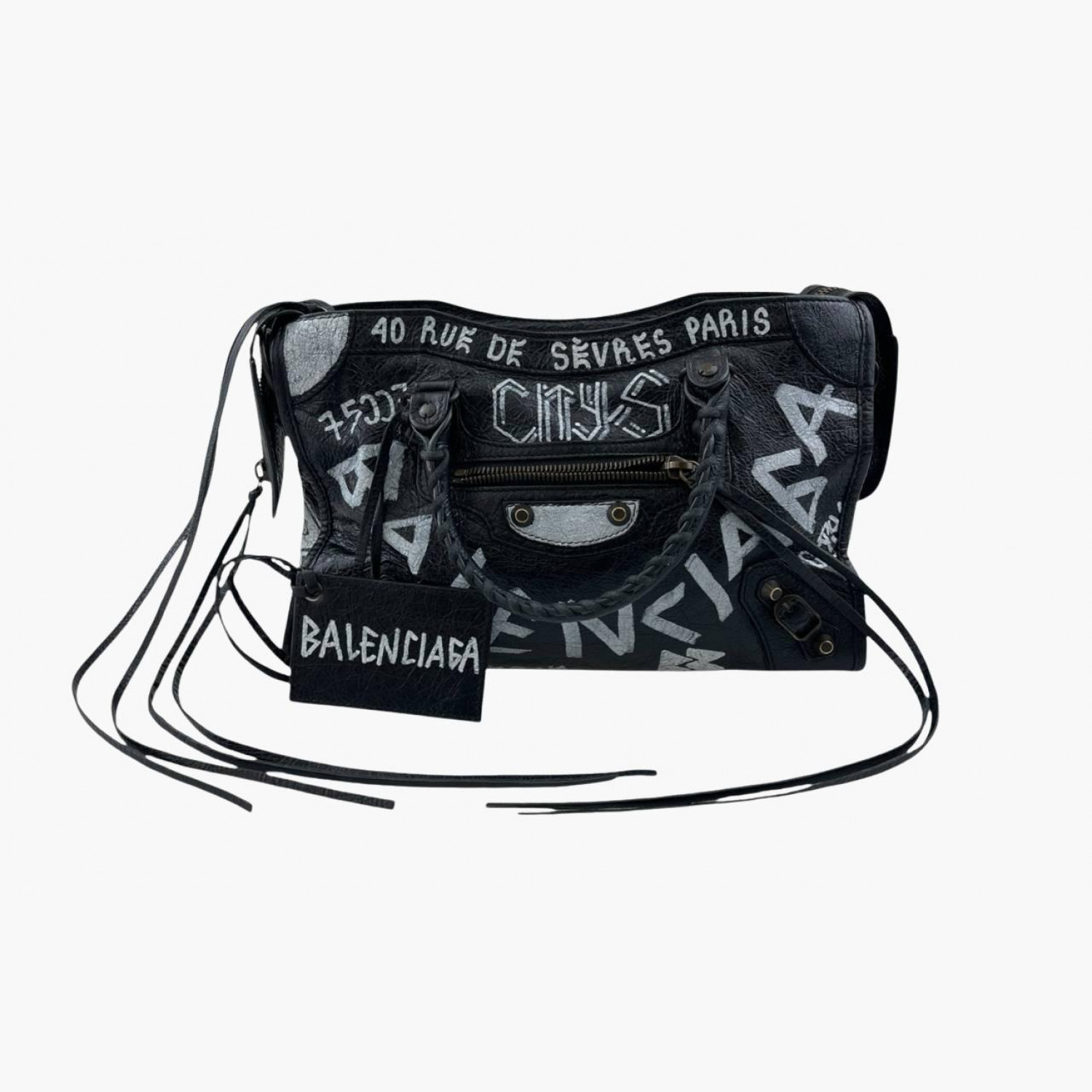 Чёрная кожаная сумка с надписями и зеркальцем. Внутри одно основное отделение, карман на молнии, с противоположной стороны — двойной открытый карман, а спереди — карман на молнии. В хорошем состоянии, есть следы носки и потёртости.