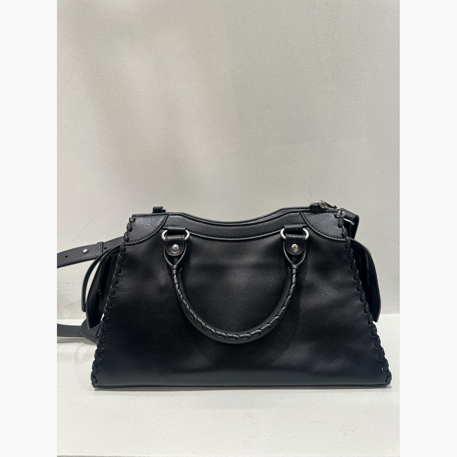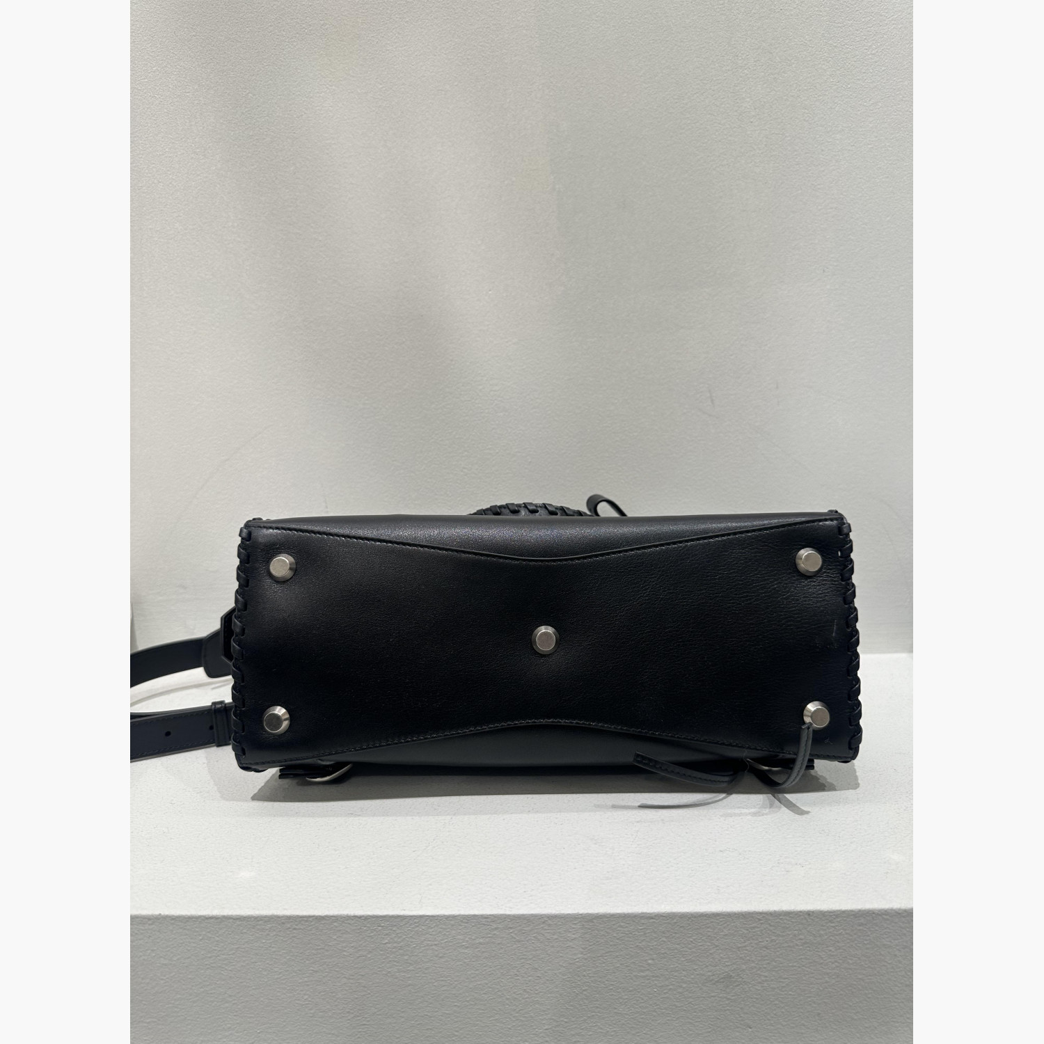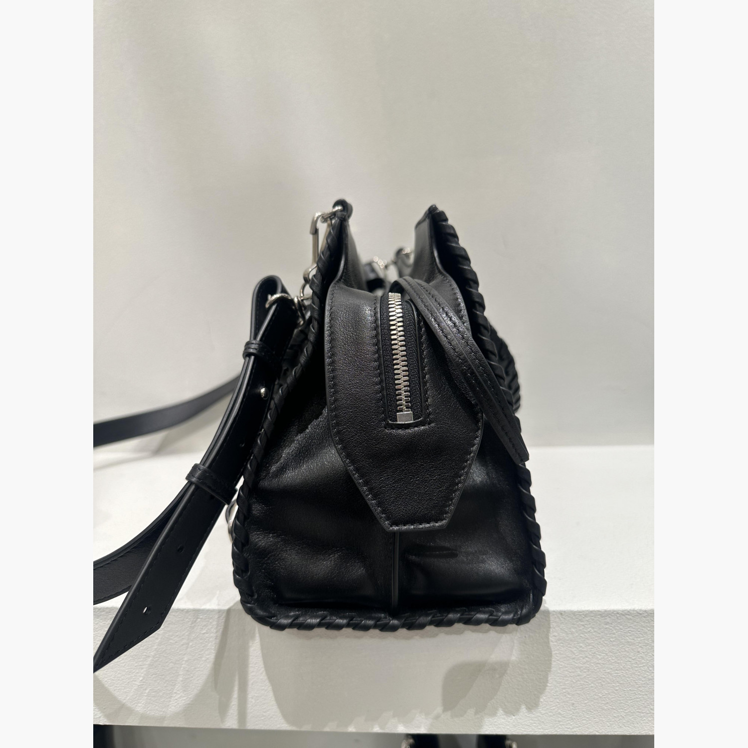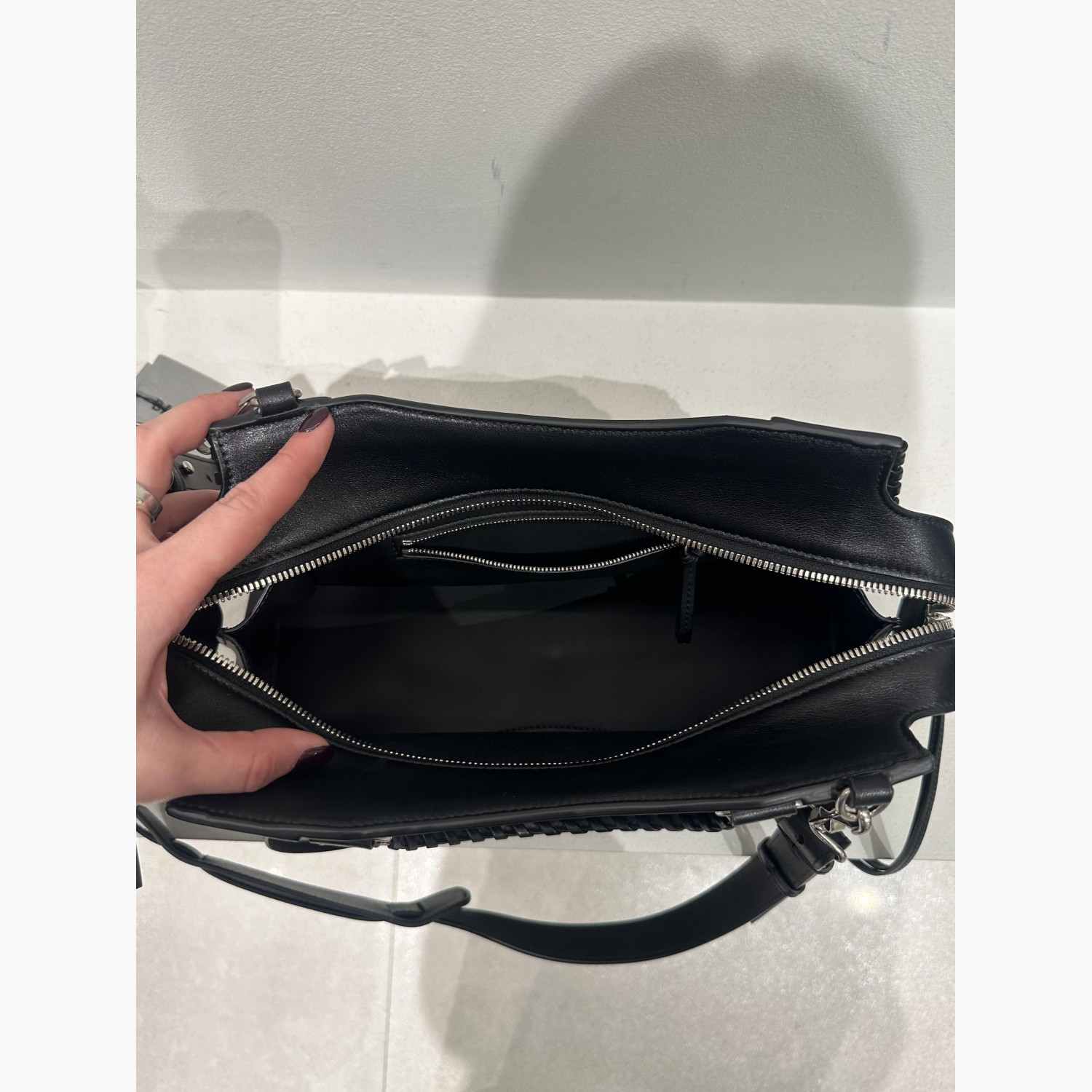 Кожаная чёрная сумка трапециевидной формы с двумя верхними плетёными ручками.Внутри одно основное отделение с карманом на молнии, а также карман на молнии с передней стороны сумки.В комплекте дополнительный ремень. Абсолютно новая, с биркой.