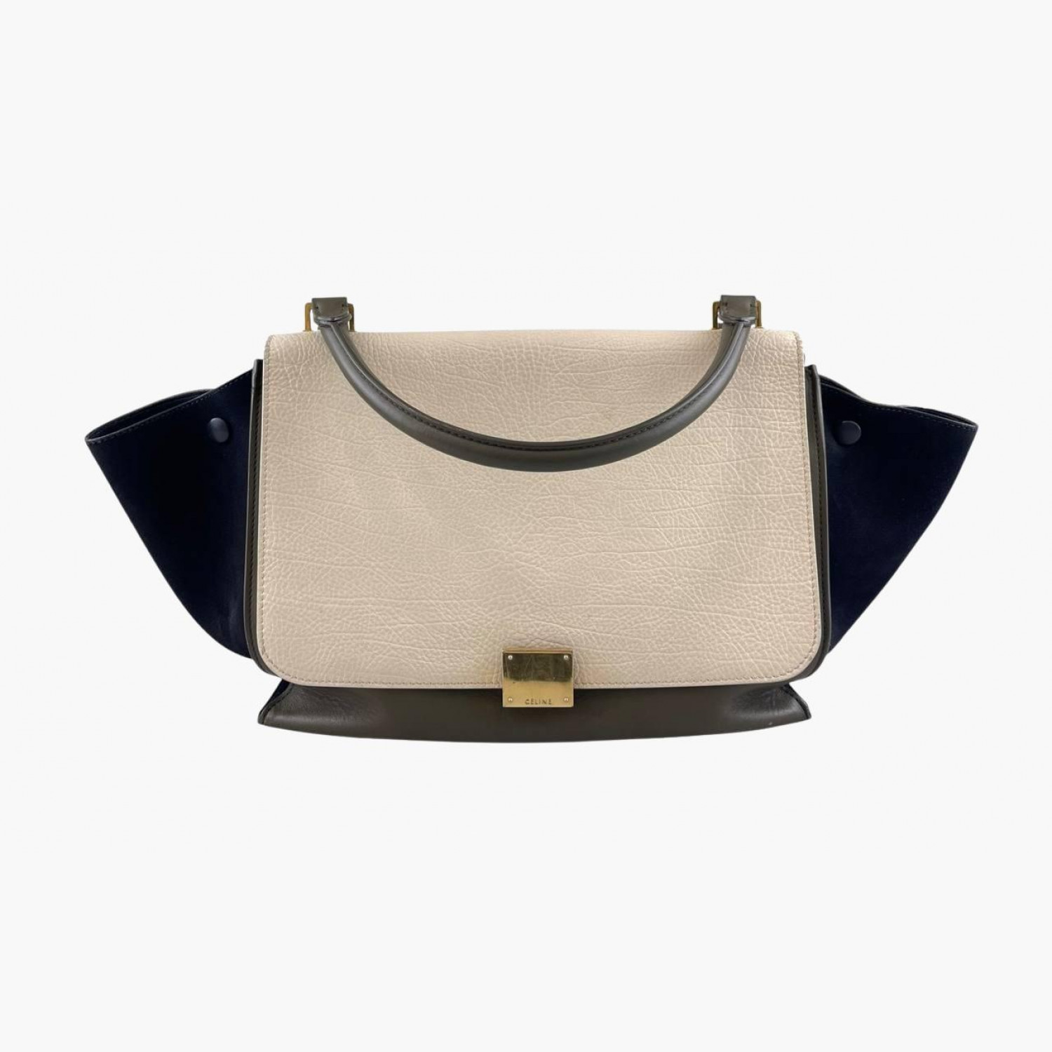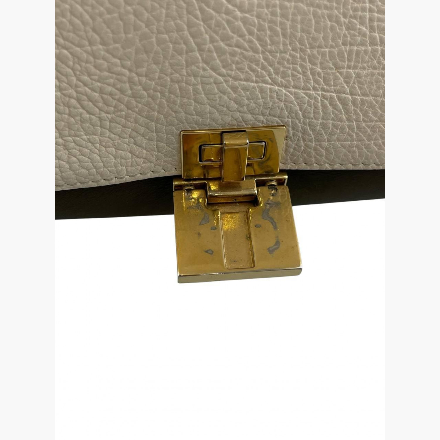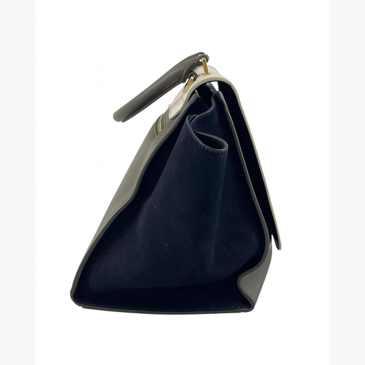 Белая кожаная сумка с темно-синими замшевыми боками, в комплекте длинный ремешок. Внутри одно основное отделение с двумя открытыми карманами, а также карман на молнии на задней стороне сумки. В хорошем состоянии, есть потертости.