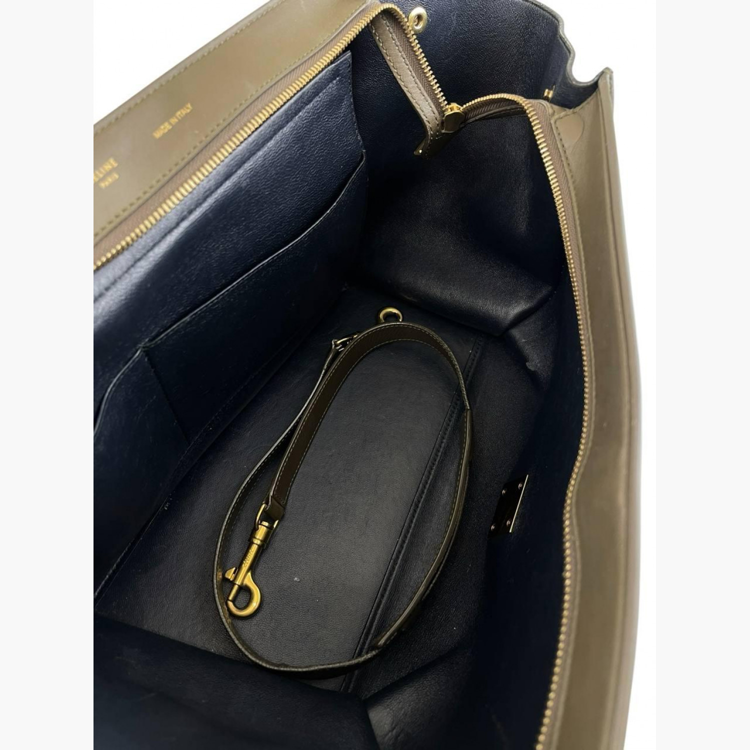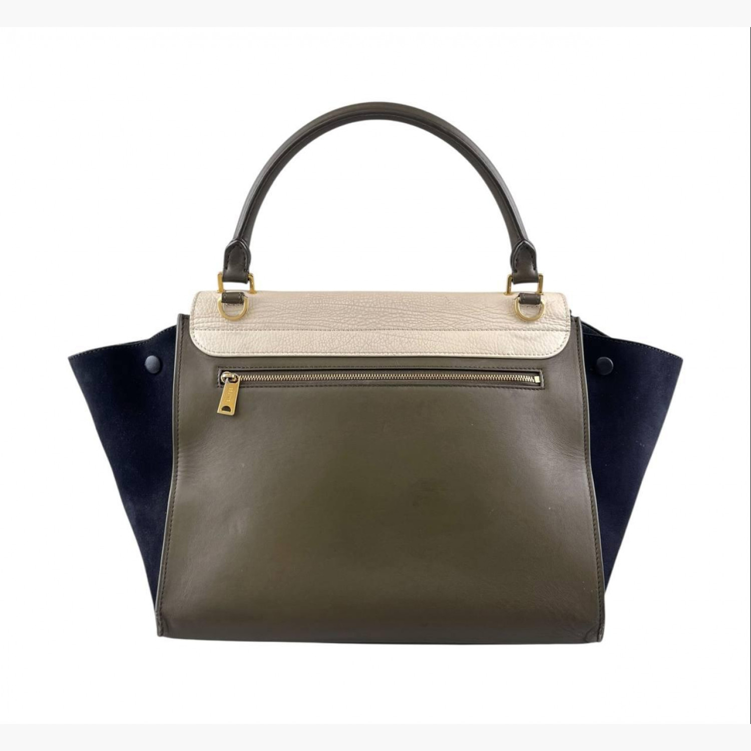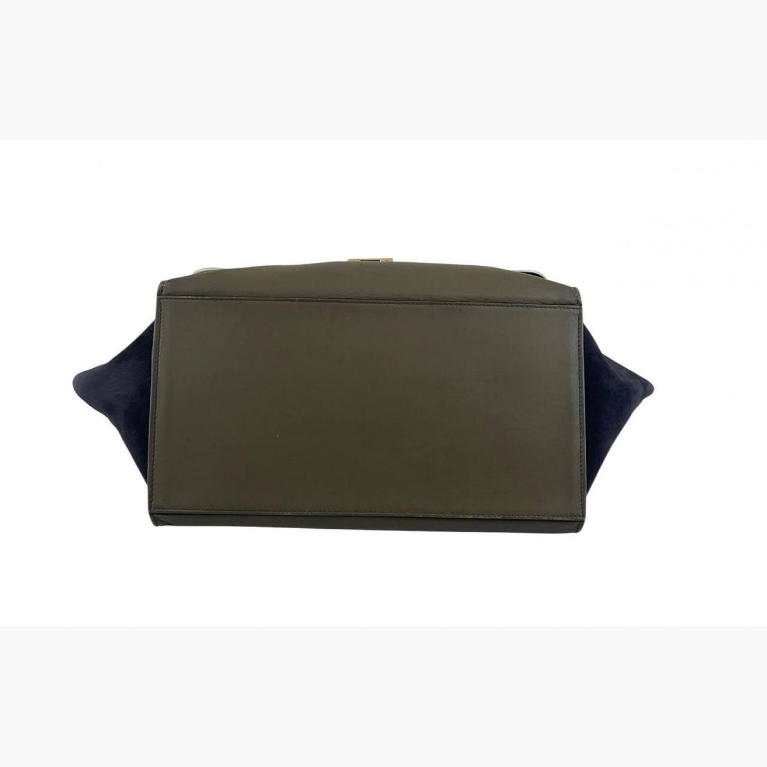 Белая кожаная сумка с темно-синими замшевыми боками, в комплекте длинный ремешок. Внутри одно основное отделение с двумя открытыми карманами, а также карман на молнии на задней стороне сумки. В хорошем состоянии, есть потертости.