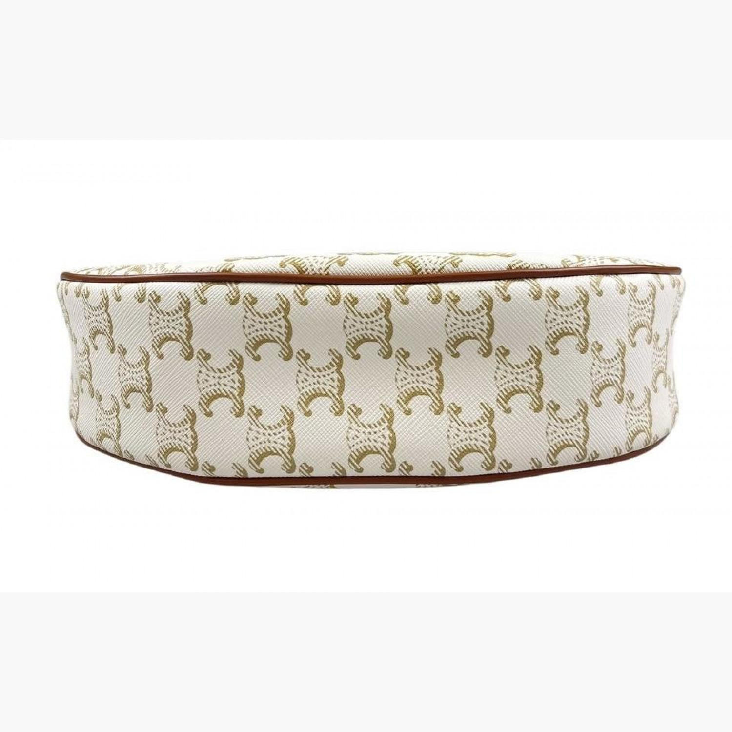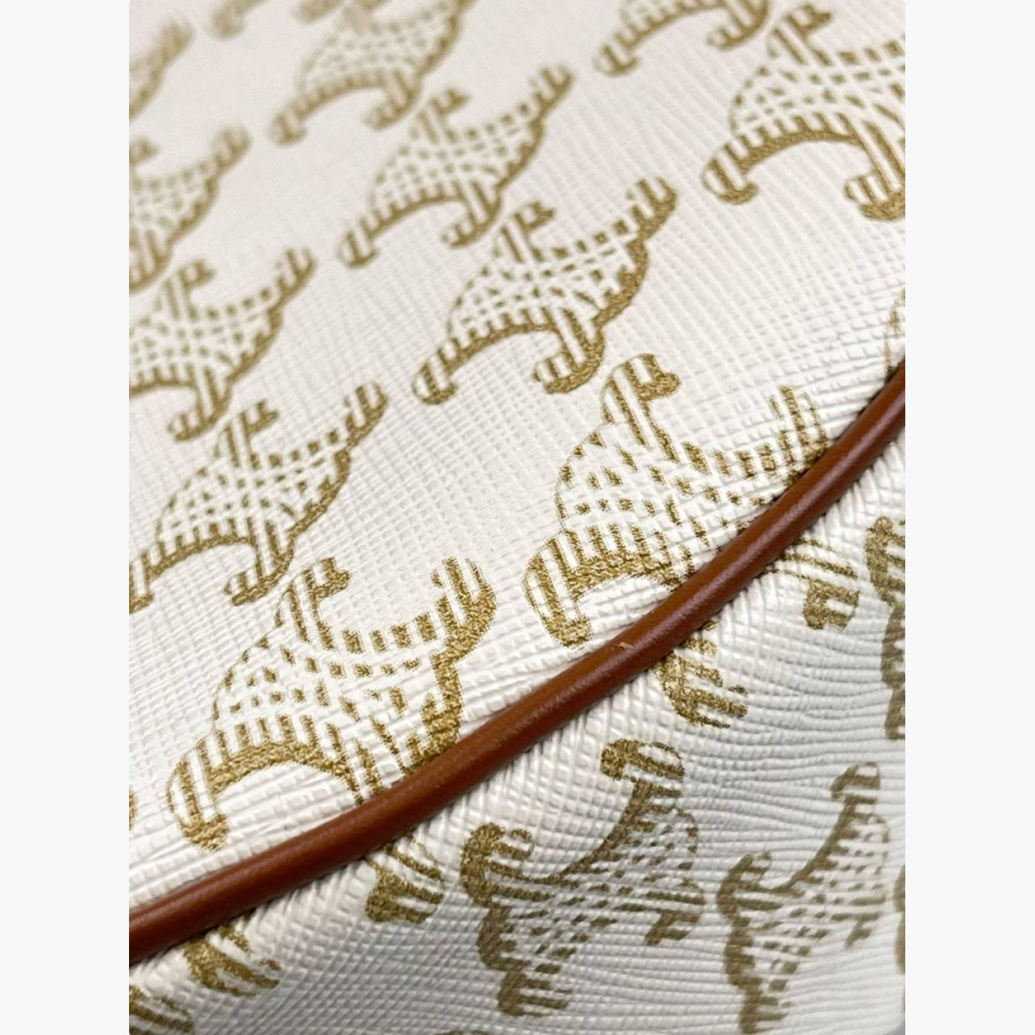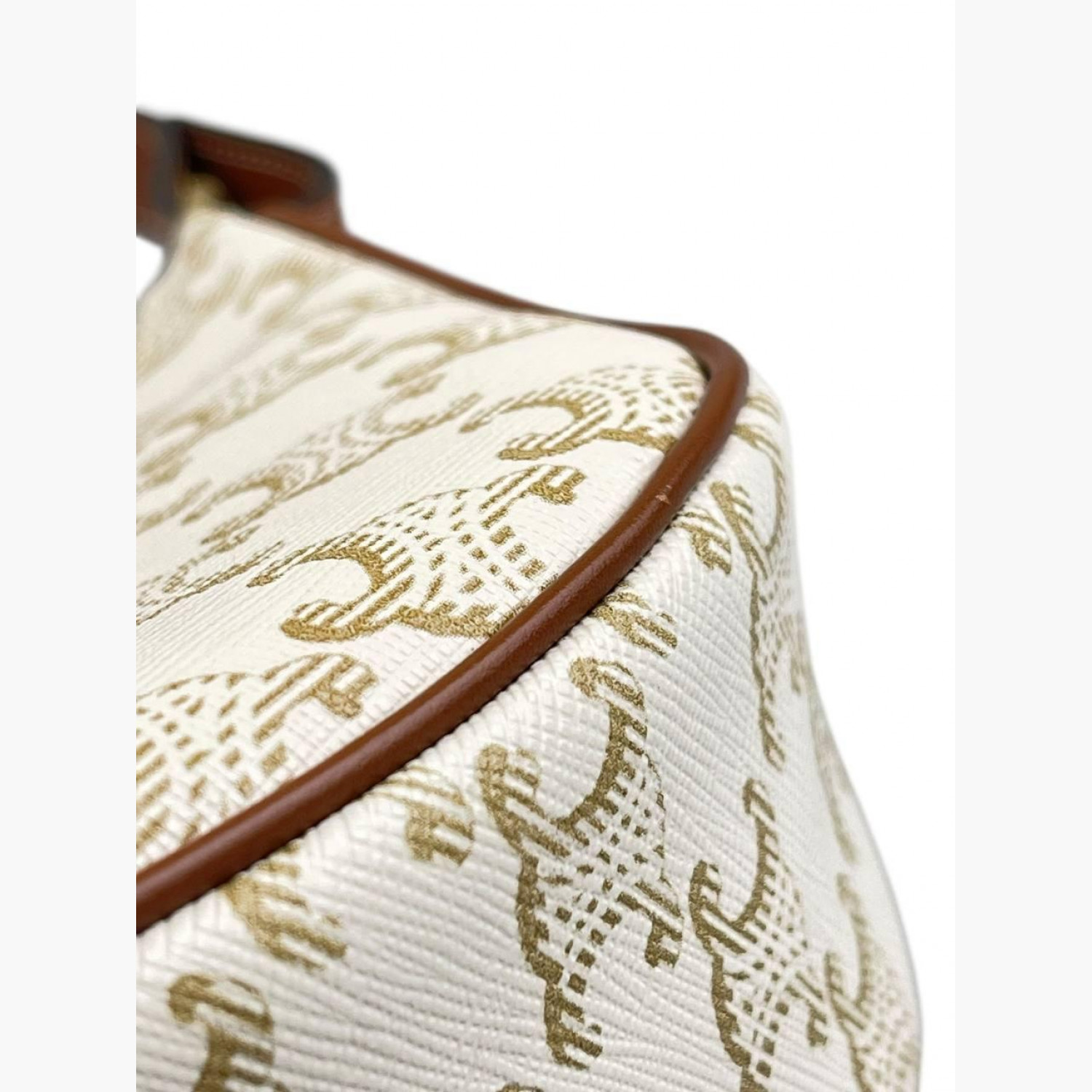 Полукруглая сумка молочного цвета с монограммой. Внутри одно основное отделение с открытым карманом. Оснащена регулируемой кожаной ручкой. В отличном состоянии, есть незначительные следы носки.