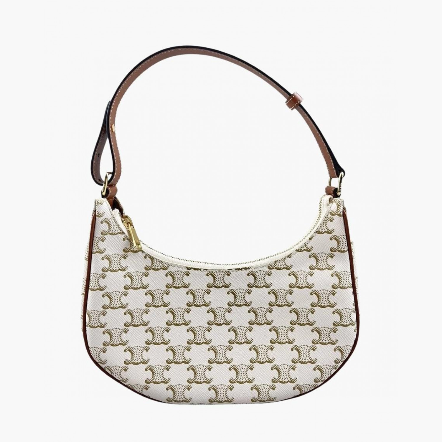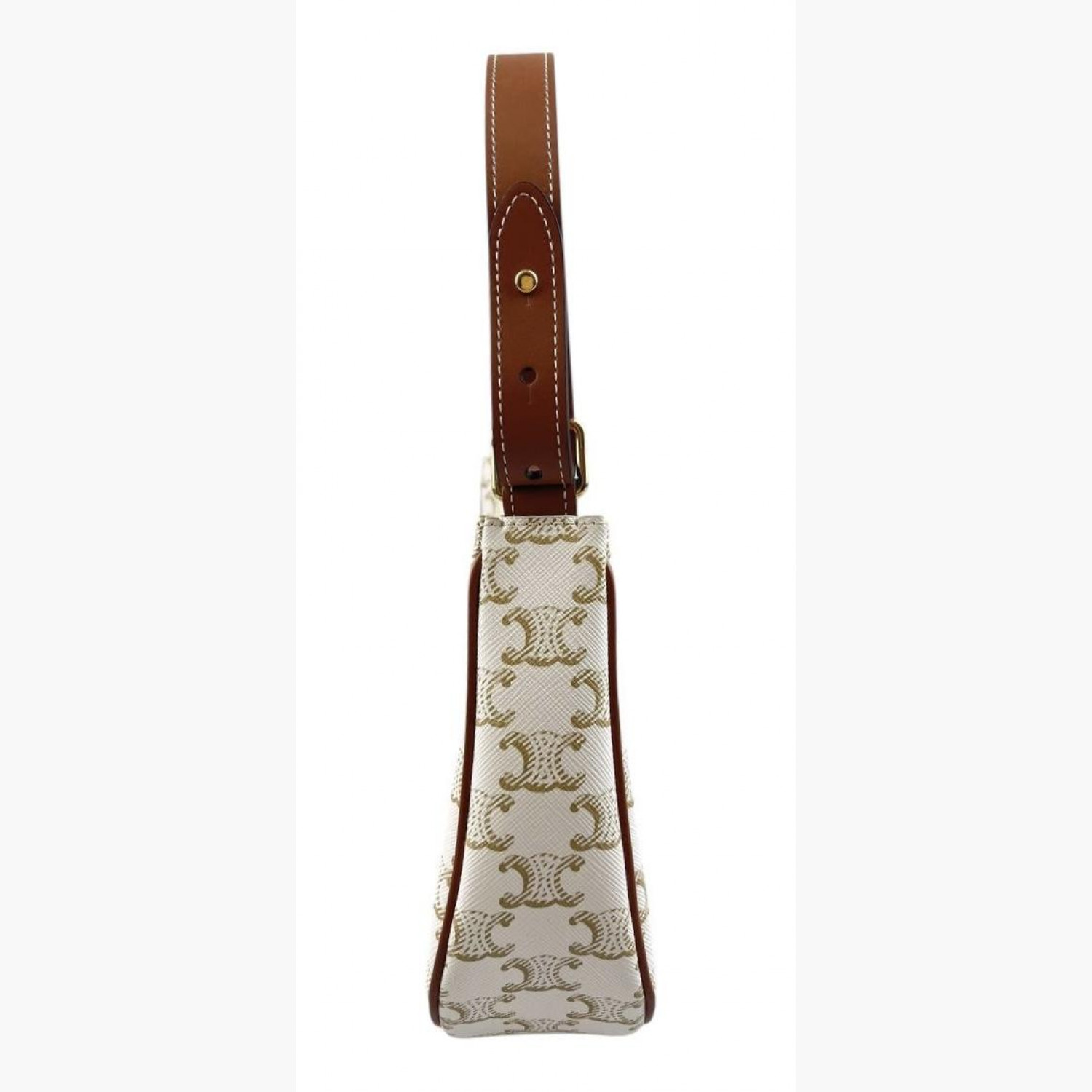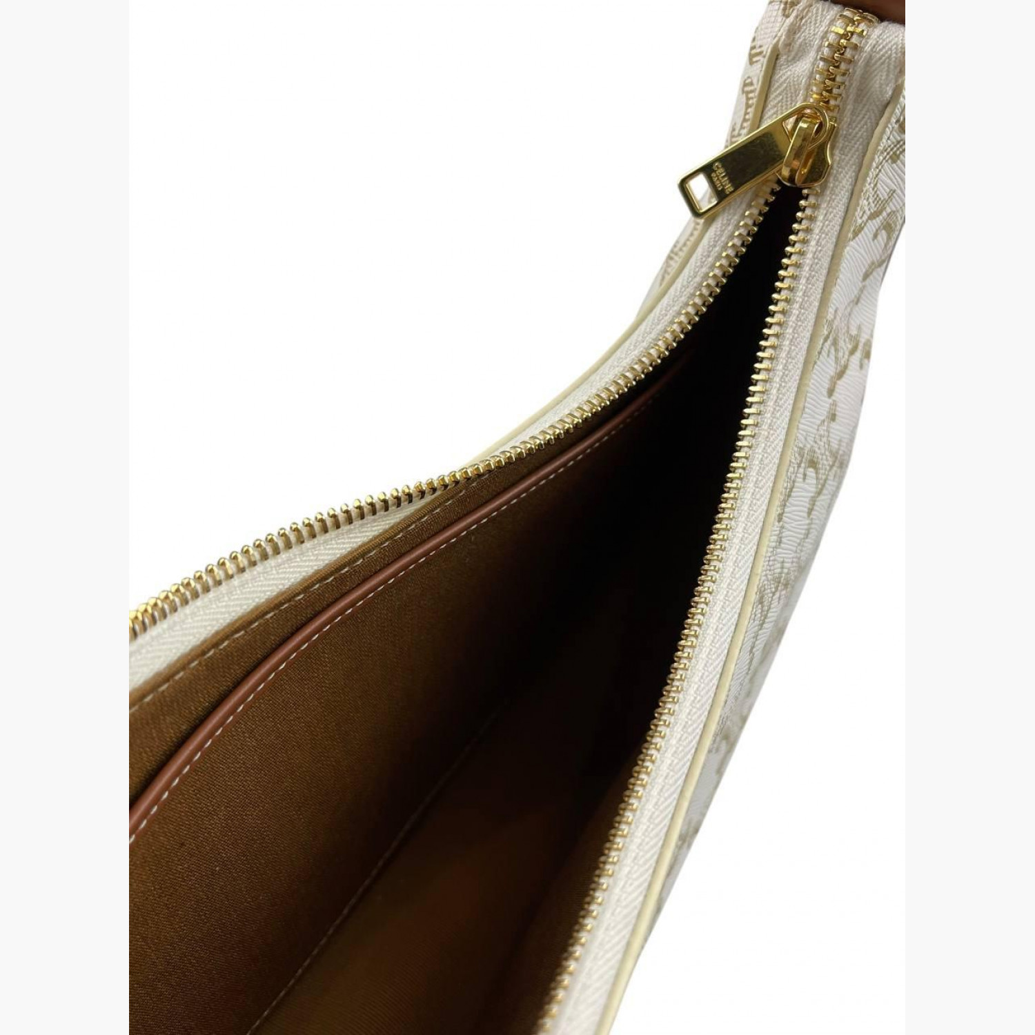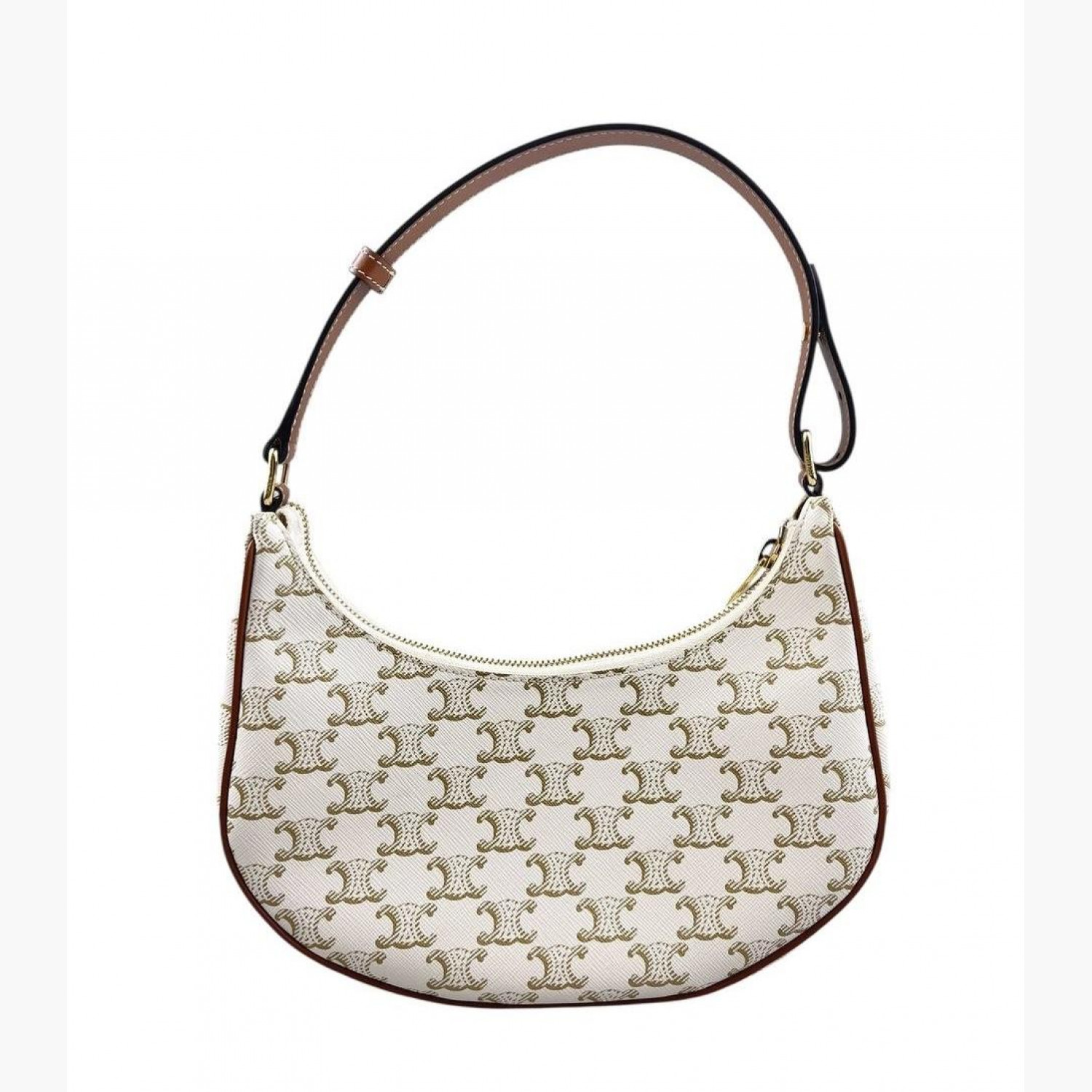 Полукруглая сумка молочного цвета с монограммой. Внутри одно основное отделение с открытым карманом. Оснащена регулируемой кожаной ручкой. В отличном состоянии, есть незначительные следы носки.