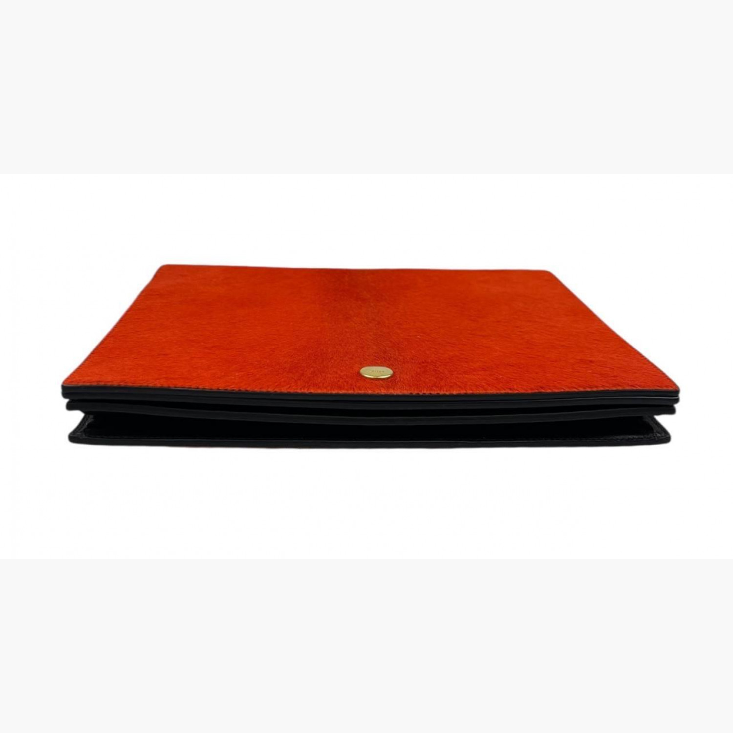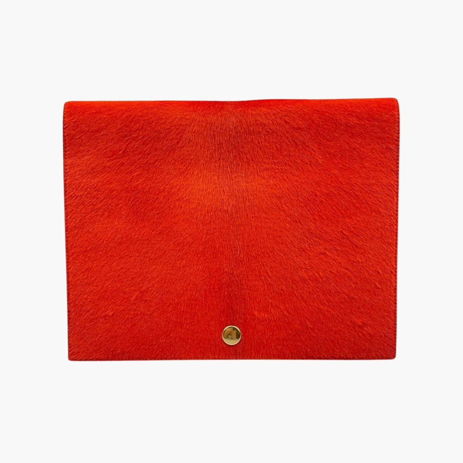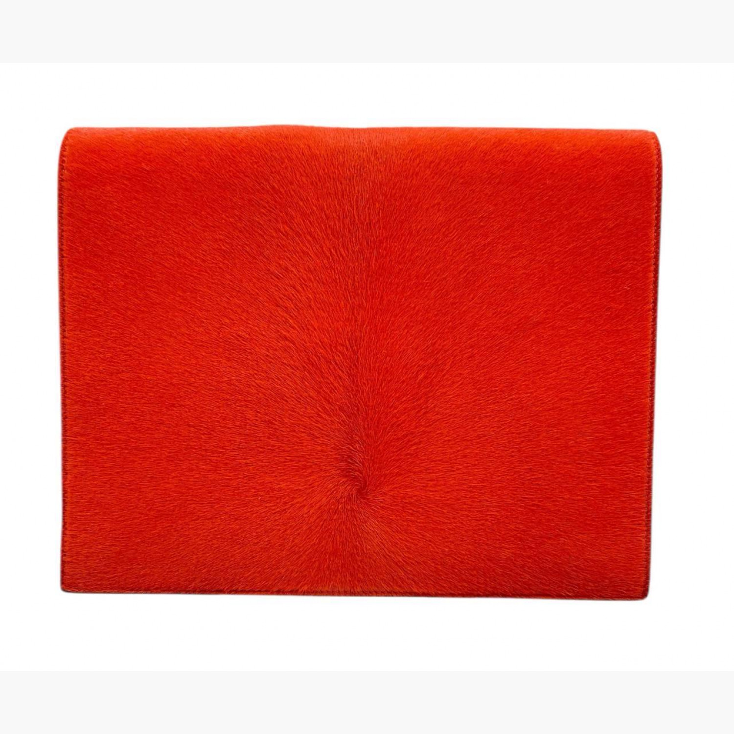 Клатч выполнен из шерсти пони, окрашенной в коралловый цвет. Внутри два основных отделения: в первом — открытый карман с шестью отделениями для карт и двойным открытым карманом под ними; во втором — открытый карман и карман на молнии. В отличном состоянии, есть незначительные следы носки.