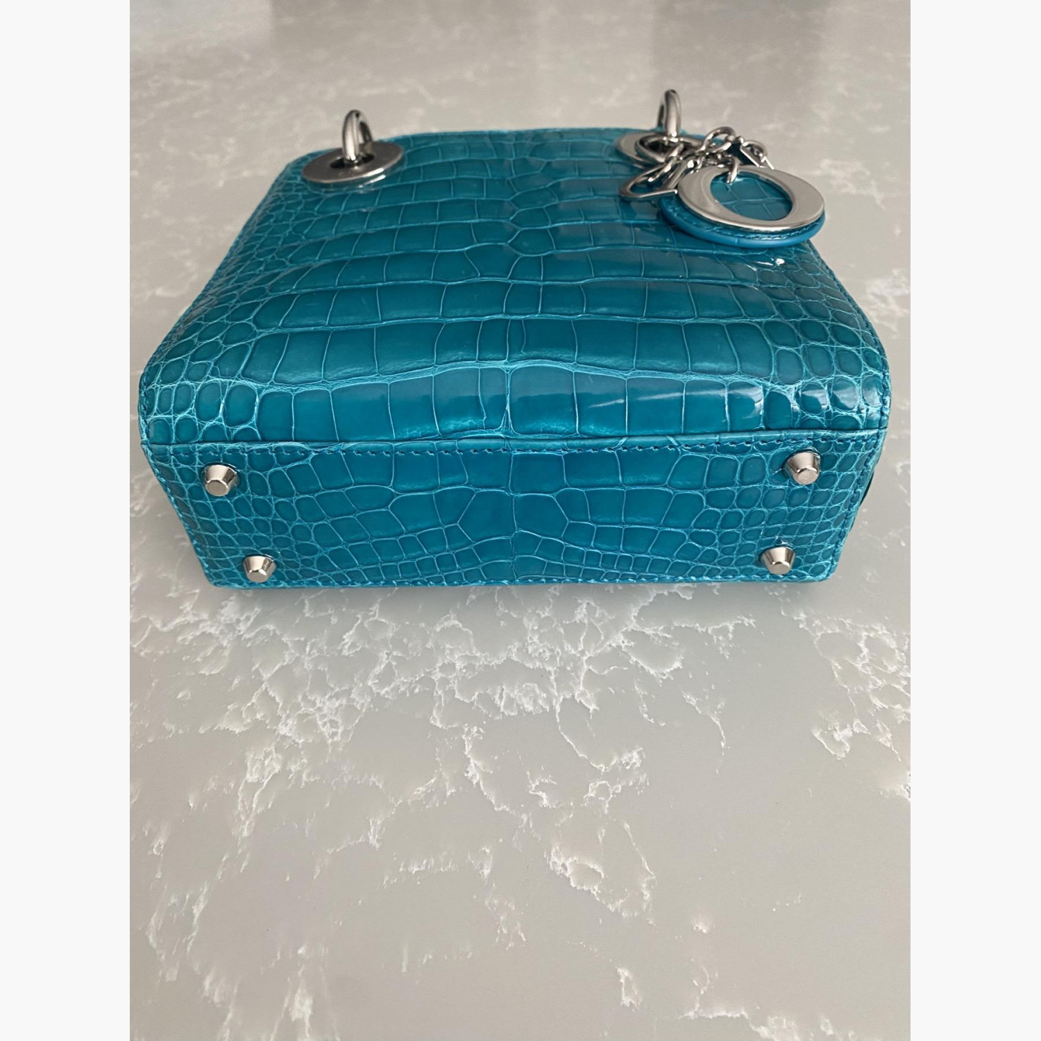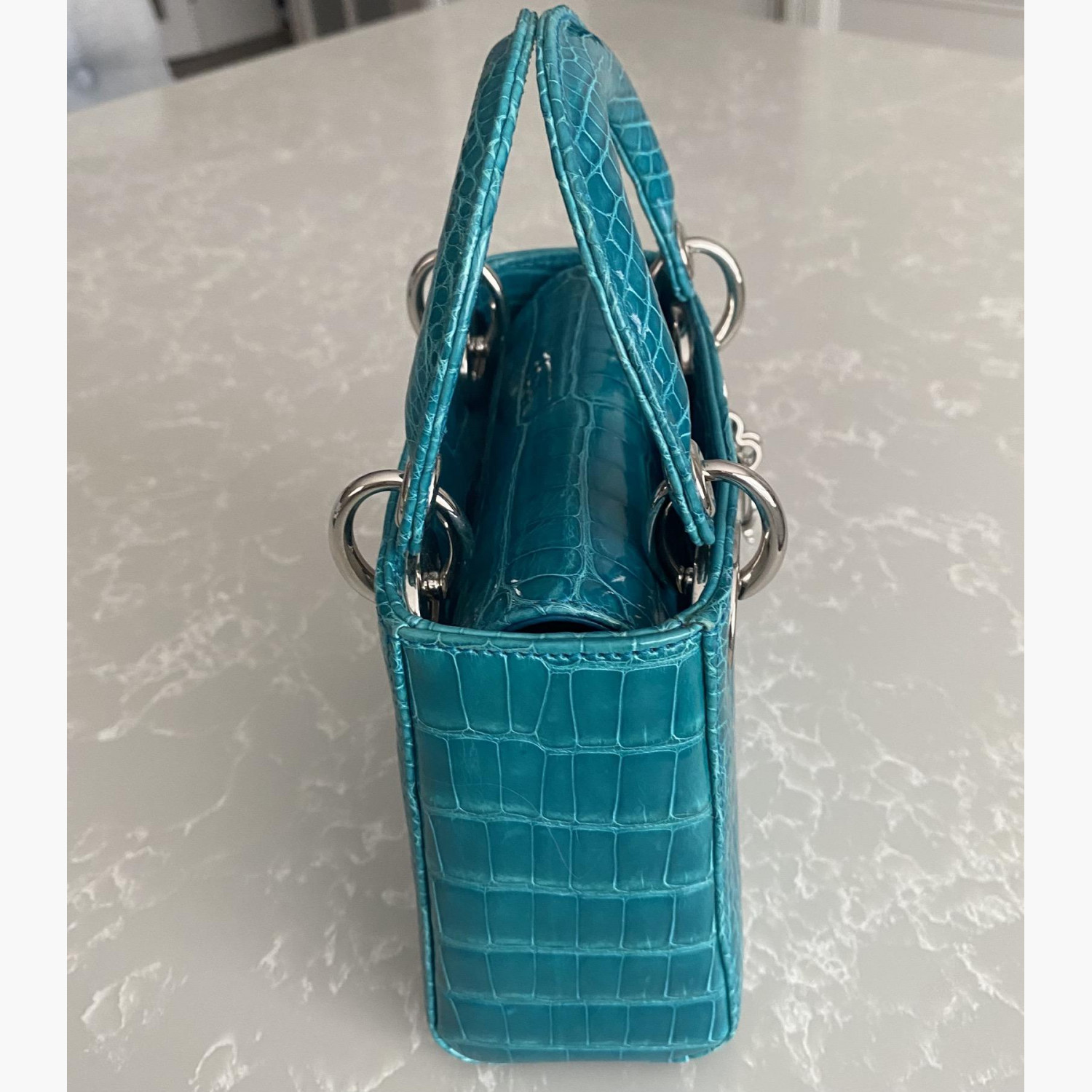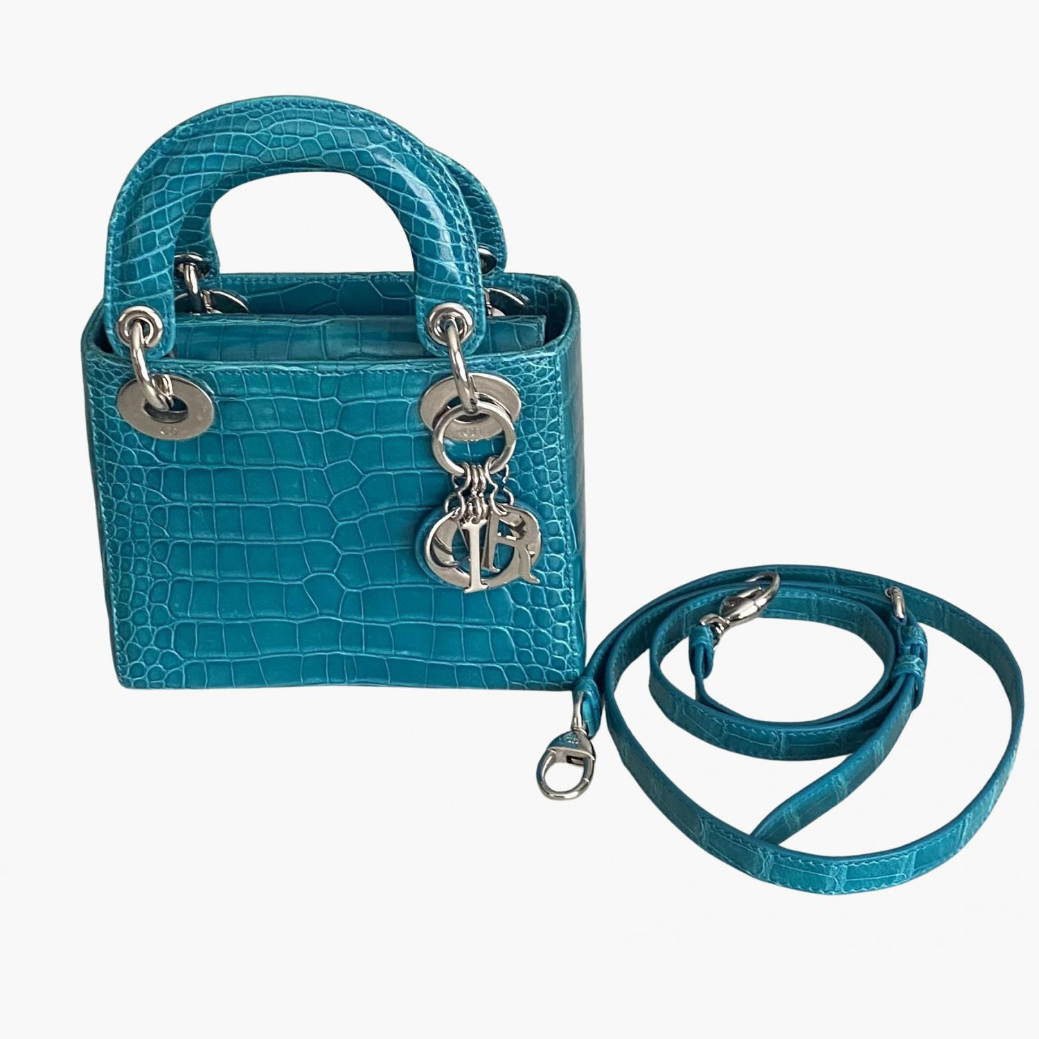 Кожаная сумка аквамаринового цвета из кожи крокодила с металлической фурнитурой серебряного цвета и двойными ручками.Внутри одно основное отделение с карманом на молнии, код сумки вшит в карман. В комплекте пыльник.В отличном состоянии.