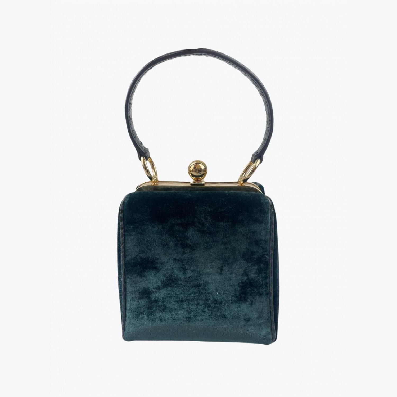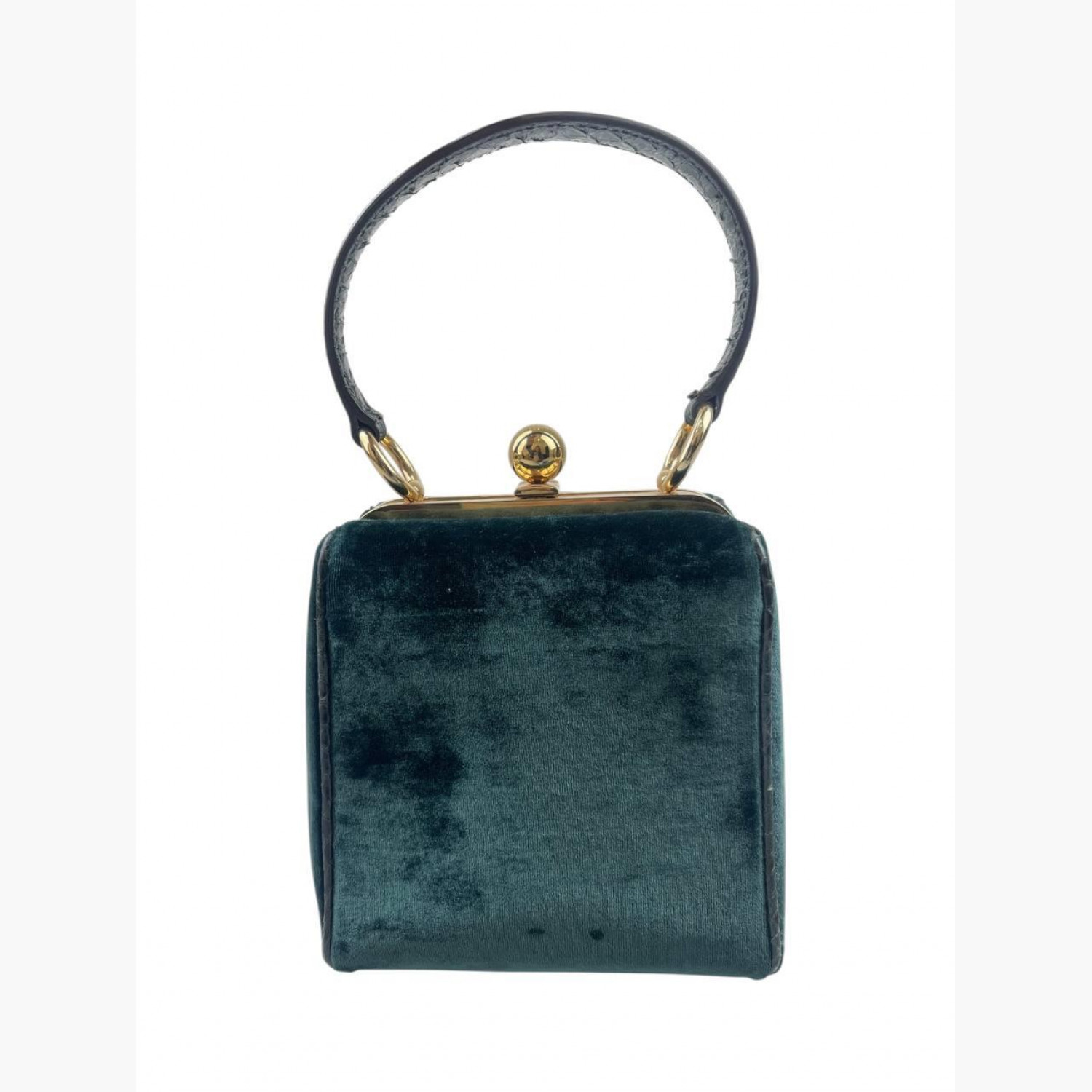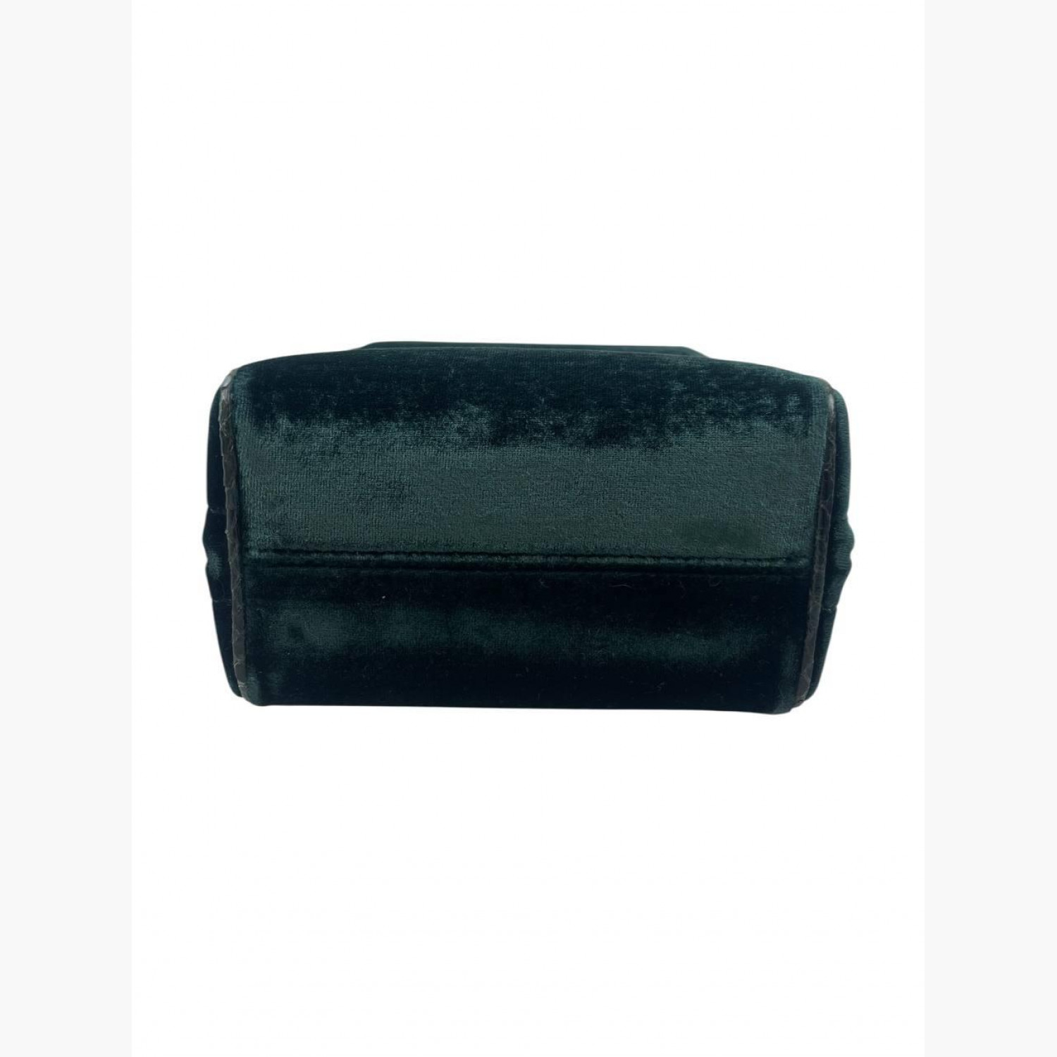 Темно-зелёная бархатная сумка. Внутри одно основное отделение с двумя открытыми карманами. В отличном состоянии, есть едва заметные следы носки.