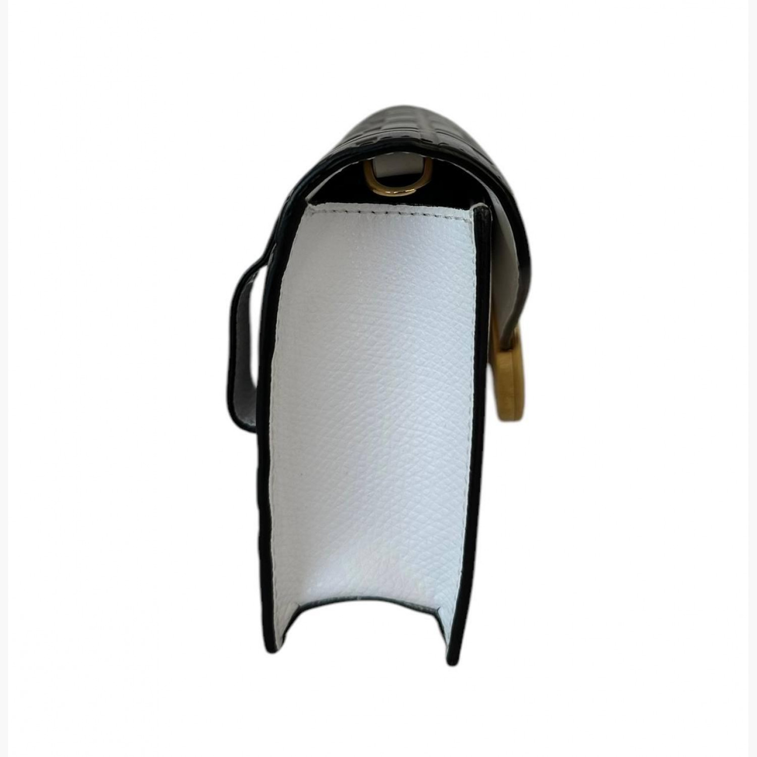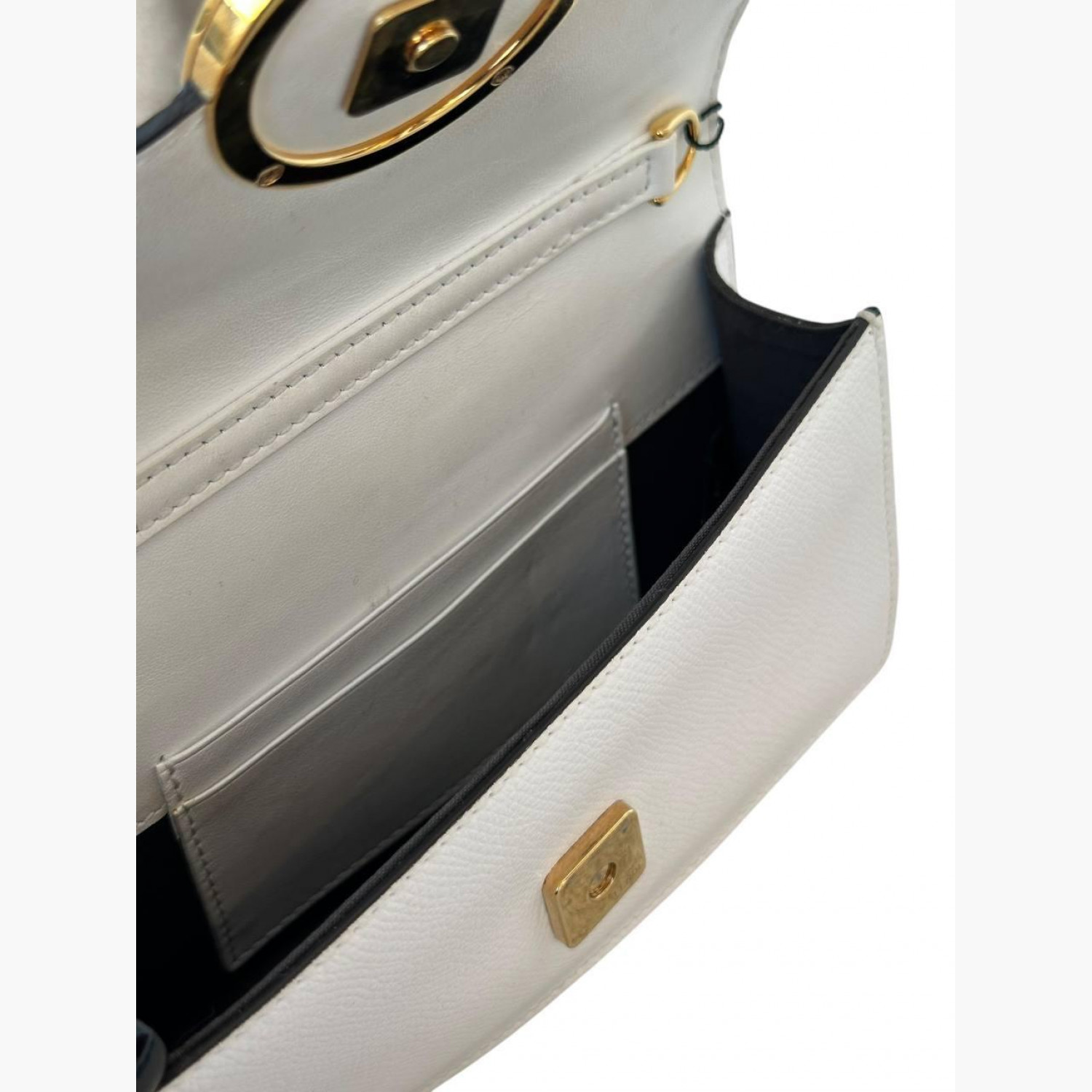 Белая кожаная поясная сумка с коричневыми вставками. Внутри одно основное отделение и два кармашка. В идеальном состоянии, есть незначительные потертости на фурнитуре.