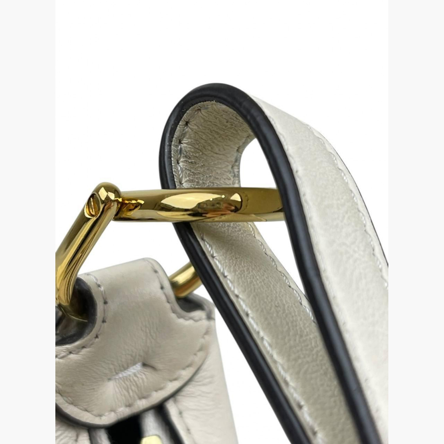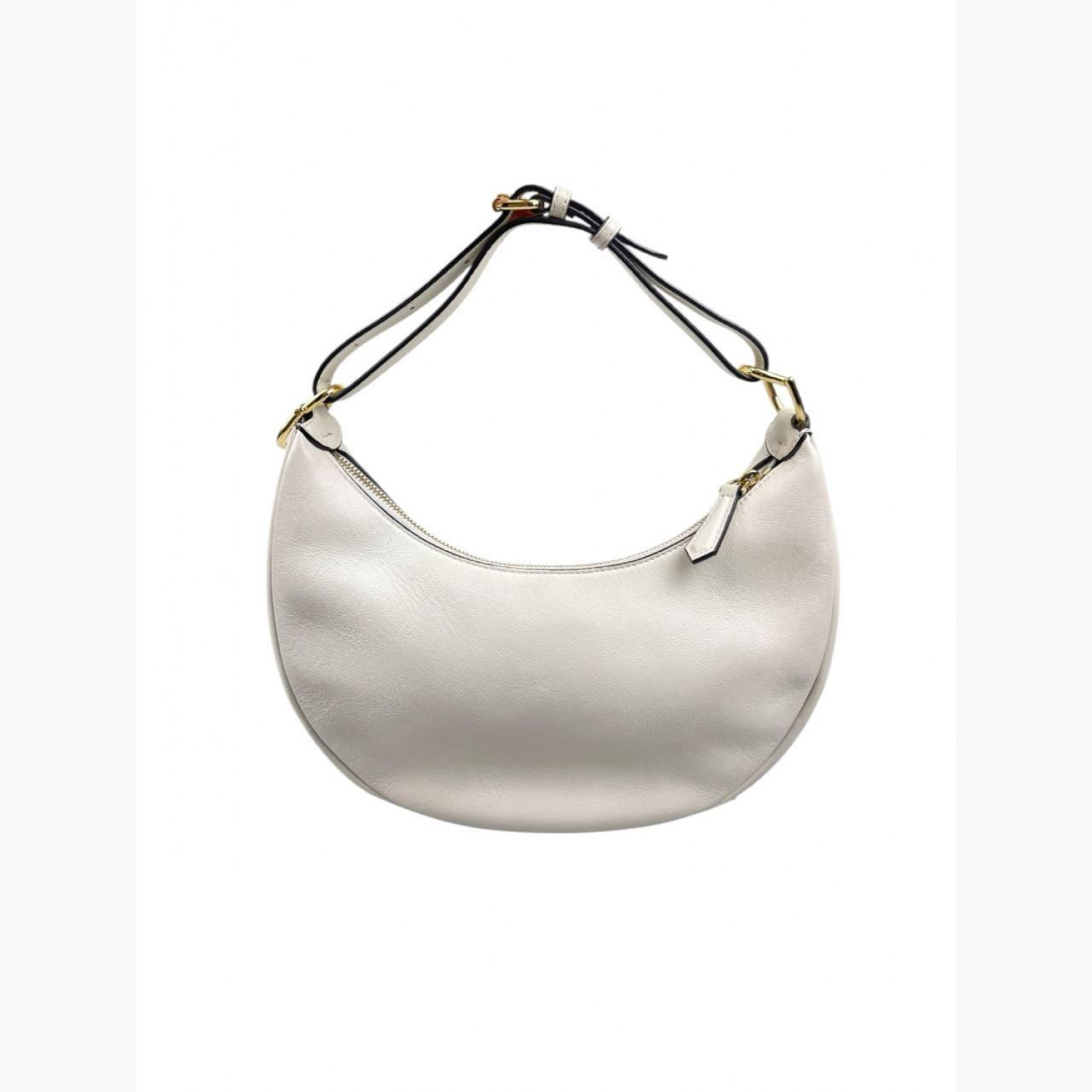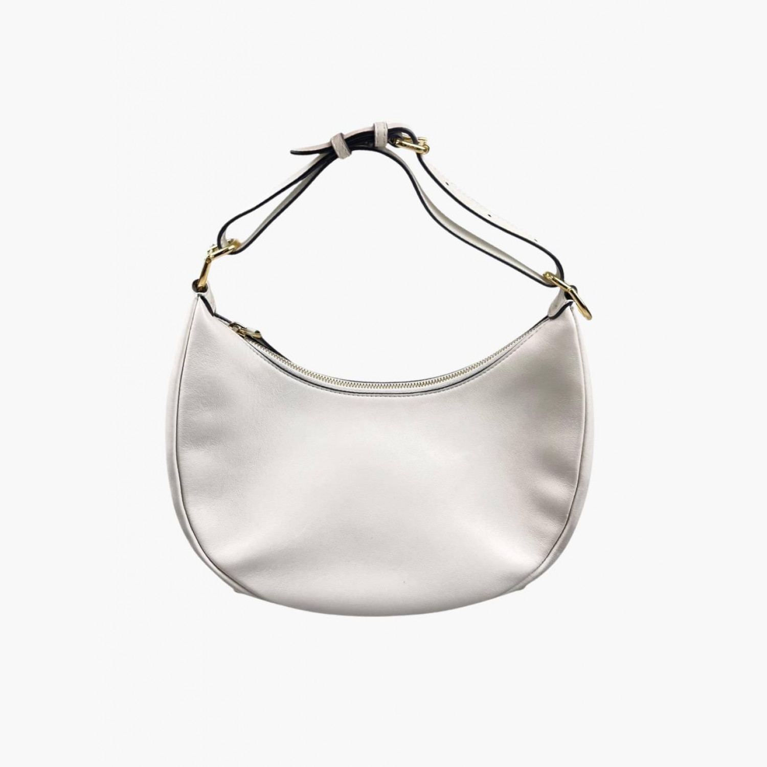 Белая кожаная сумка полукруглой формы. Длина ручки регулируется. Металлическое лого золотого цвета расположено на дне сумки. Внутри — одно основное отделение, без карманов. В хорошем состоянии, есть следы носки.