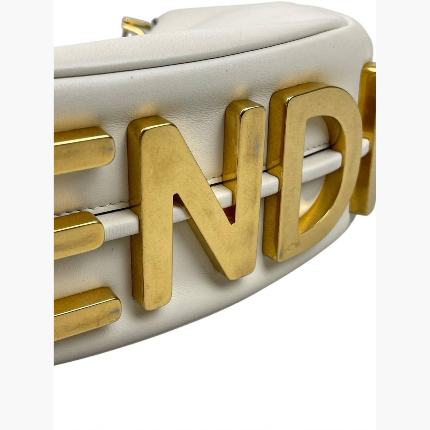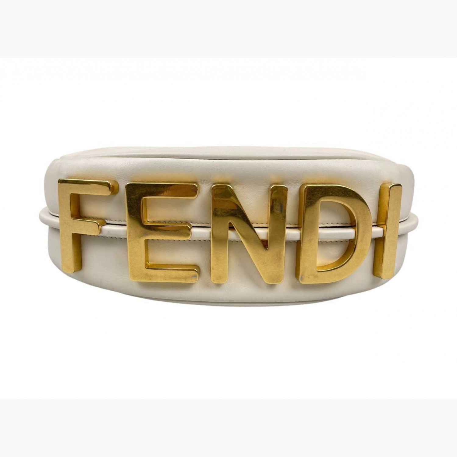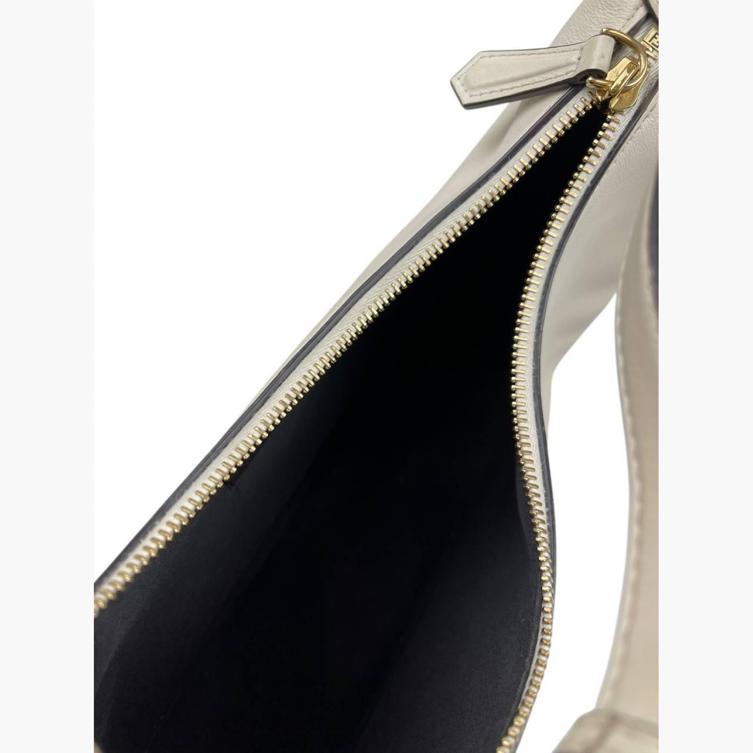 Белая кожаная сумка полукруглой формы. Длина ручки регулируется. Металлическое лого золотого цвета расположено на дне сумки. Внутри — одно основное отделение, без карманов. В хорошем состоянии, есть следы носки.