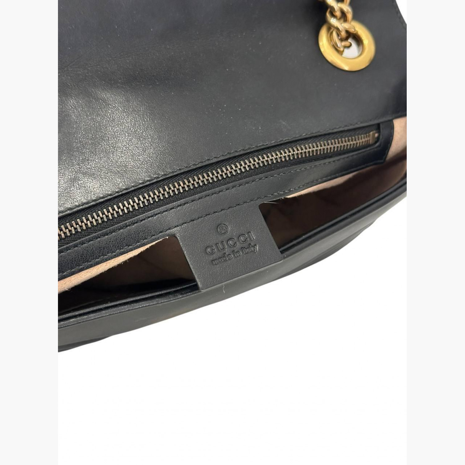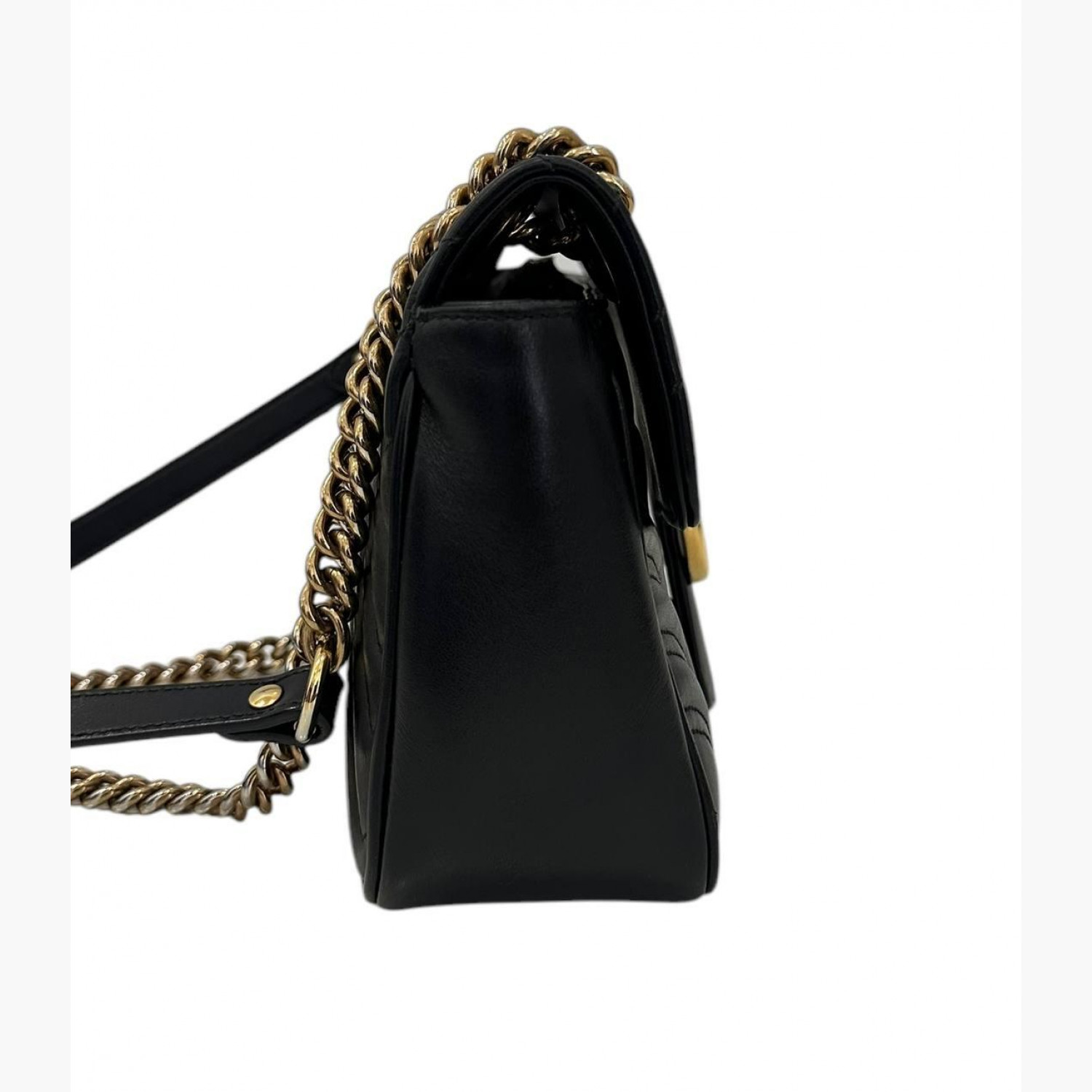 Черная кожаная стёганая сумка. Внутри одно основное отделение и карман на молнии. В хорошем состоянии, есть потертости на коже и фурнитуре.