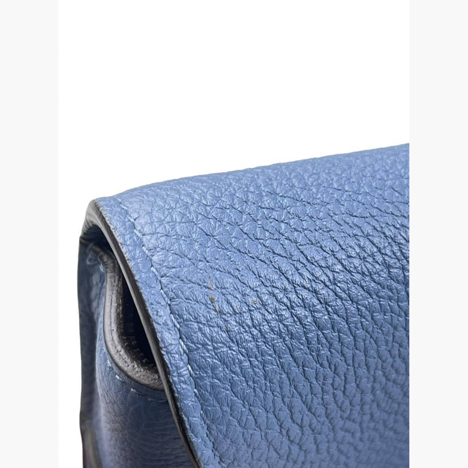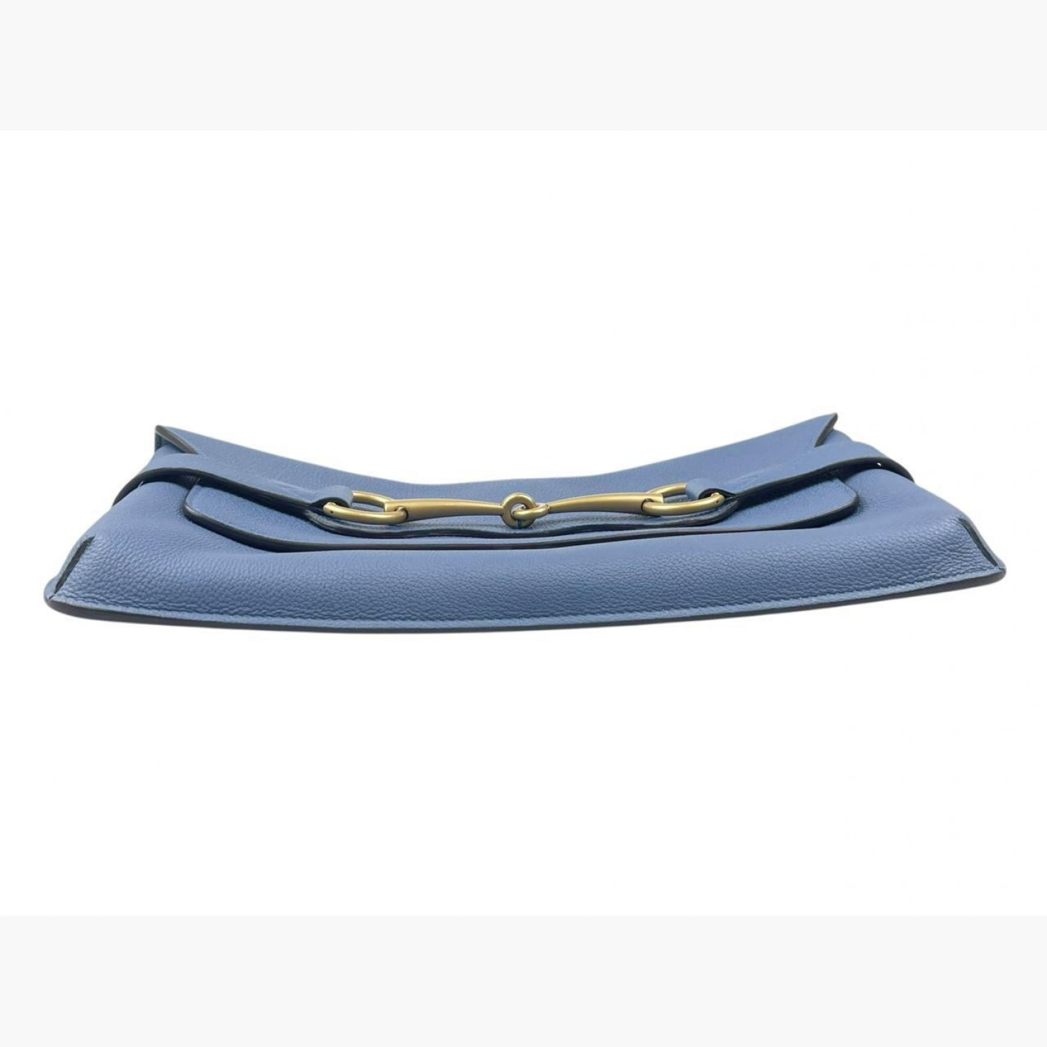 Светло-синий кожаный клатч с металлической фурнитурой золотого цвета. Внутри — одно основное отделение с открытым карманом. В отличном состоянии, есть незначительные следы носки.