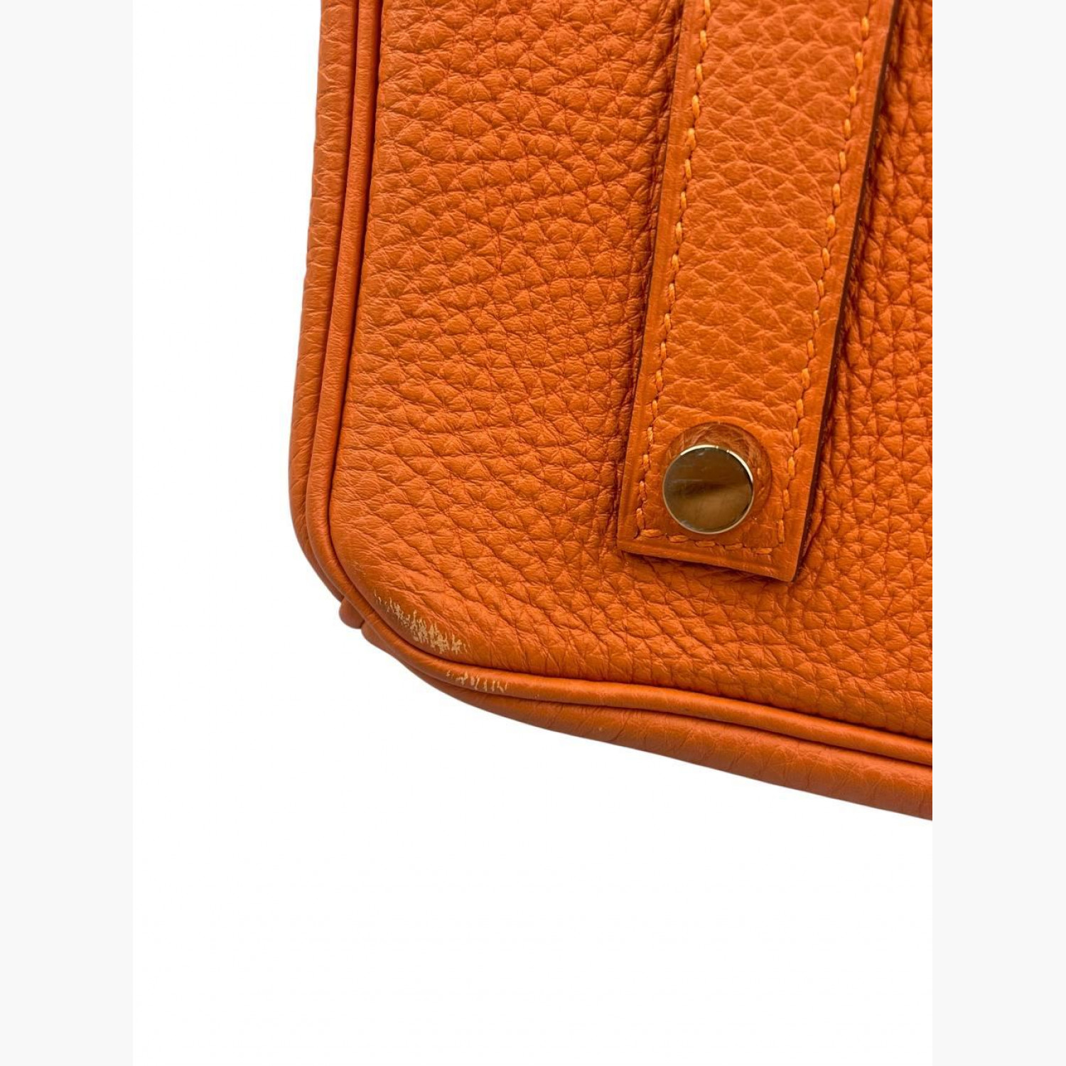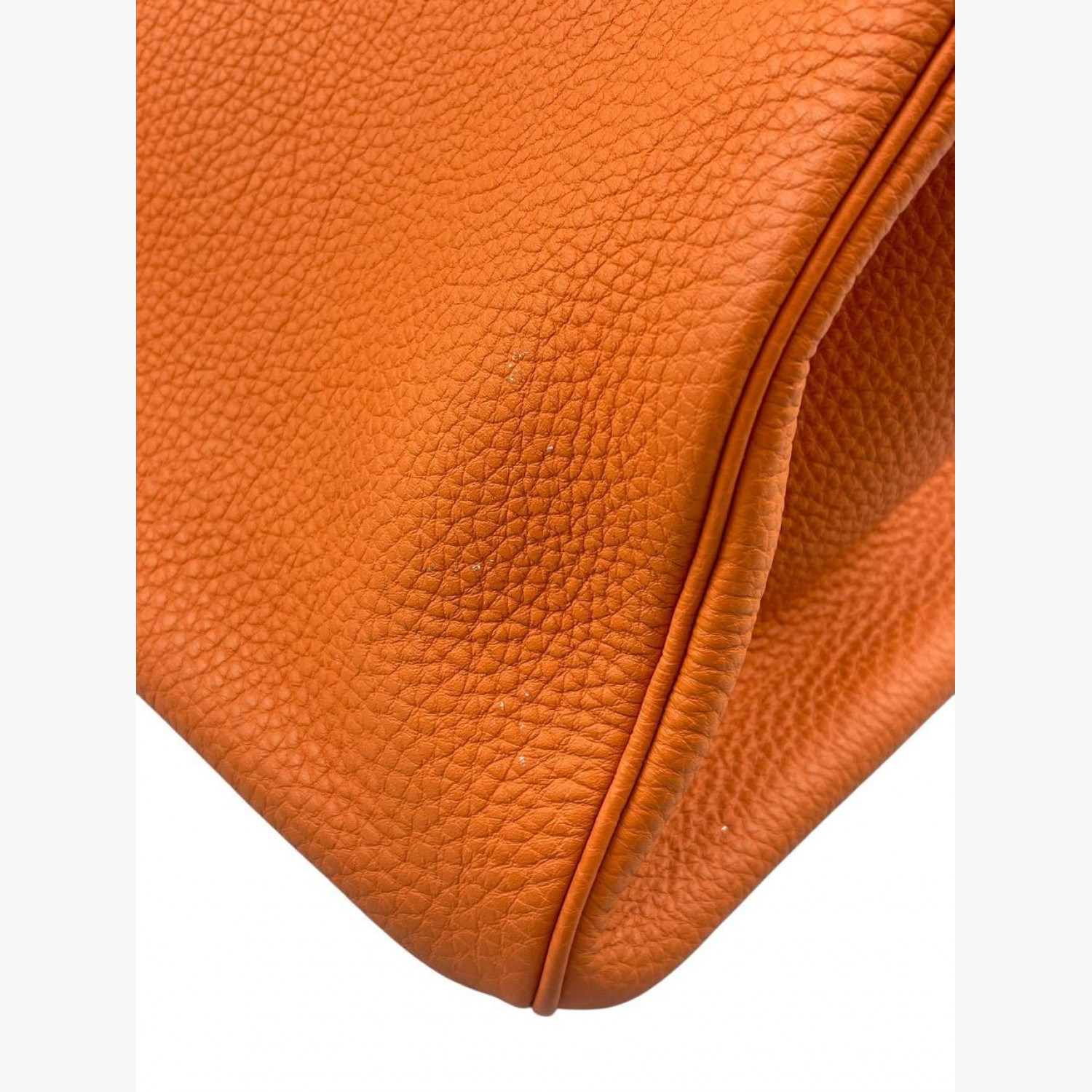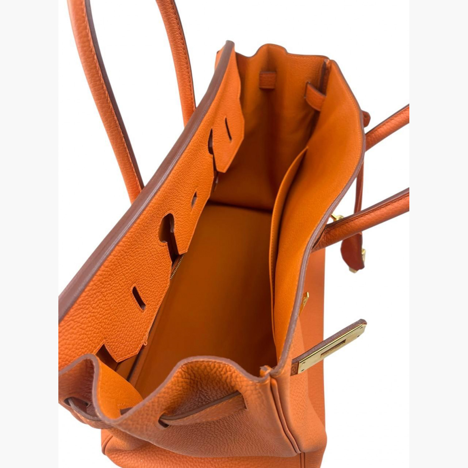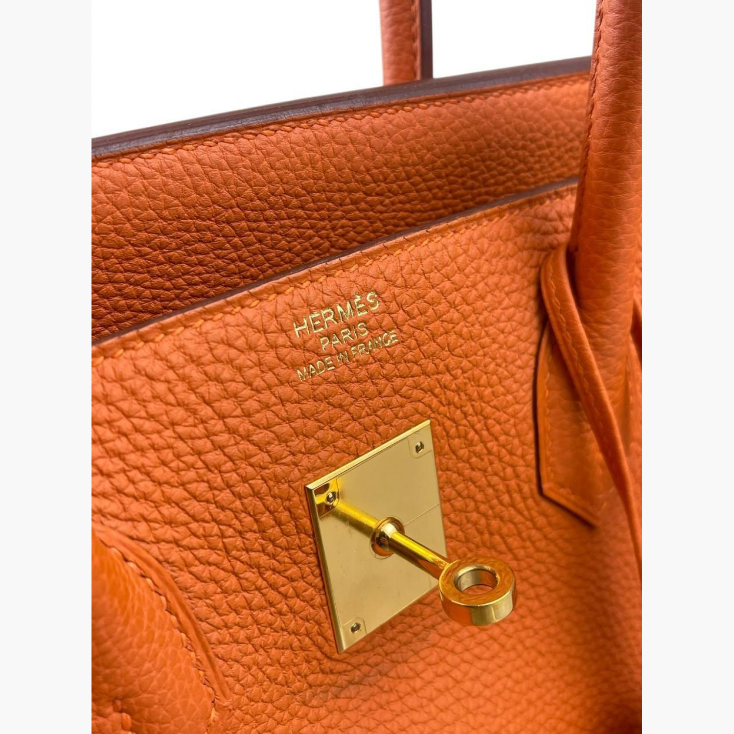 Оранжевая кожаная сумка с замком и ключами. Внутри одно основное отделение, открытый карман и карман на молнии. В отличном состоянии, есть незначительные следы носки.