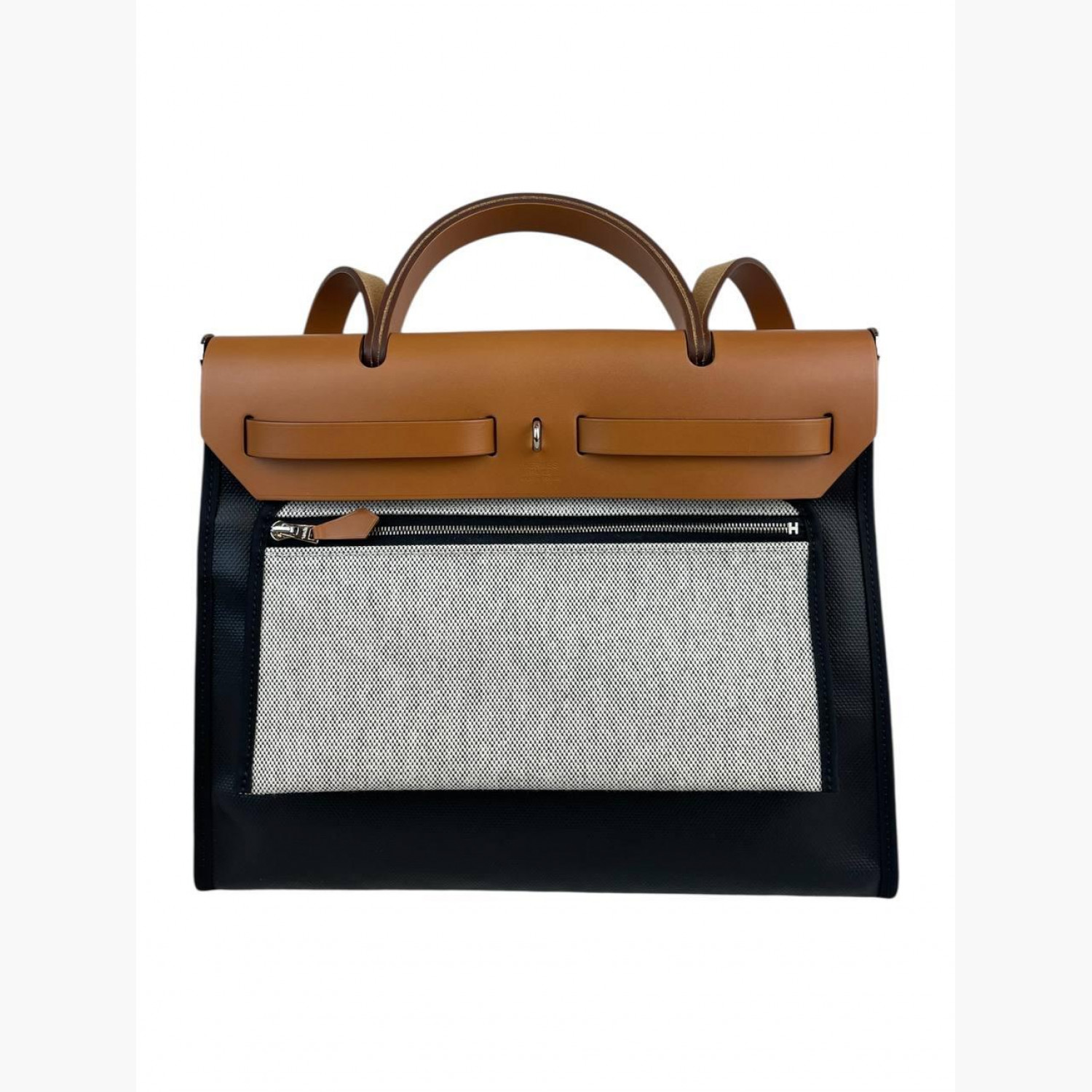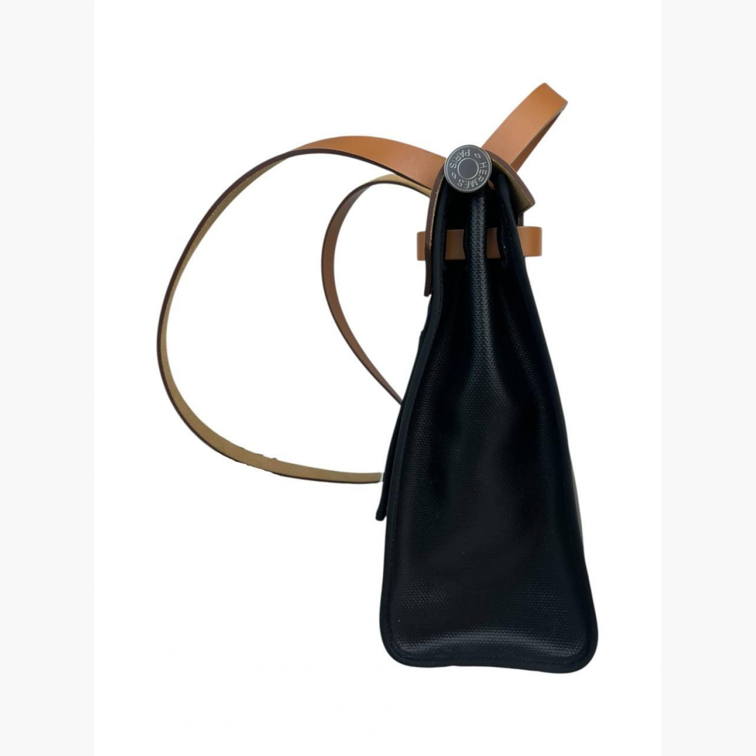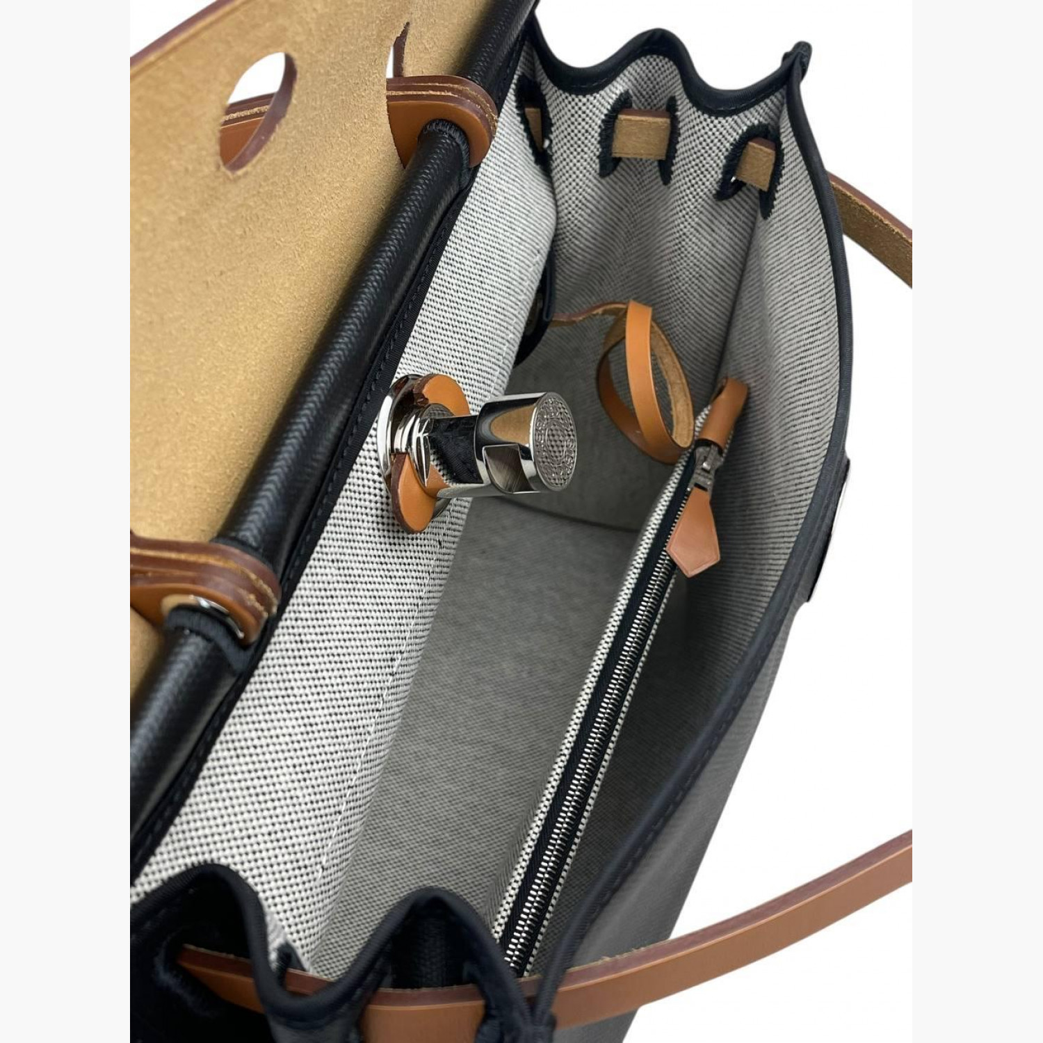 Черная текстильная сумка с коричневой кожаной крышкой. Внутри — одно основное отделение, съёмный карман на молнии, а также карман на молнии с задней стороны сумки. В комплекте — замок и ключи. В отличном состоянии, есть едва заметные следы носки.