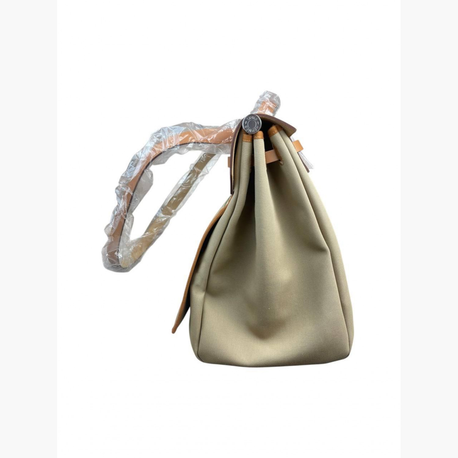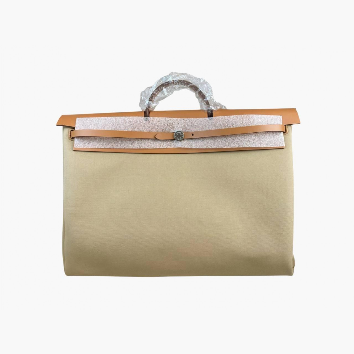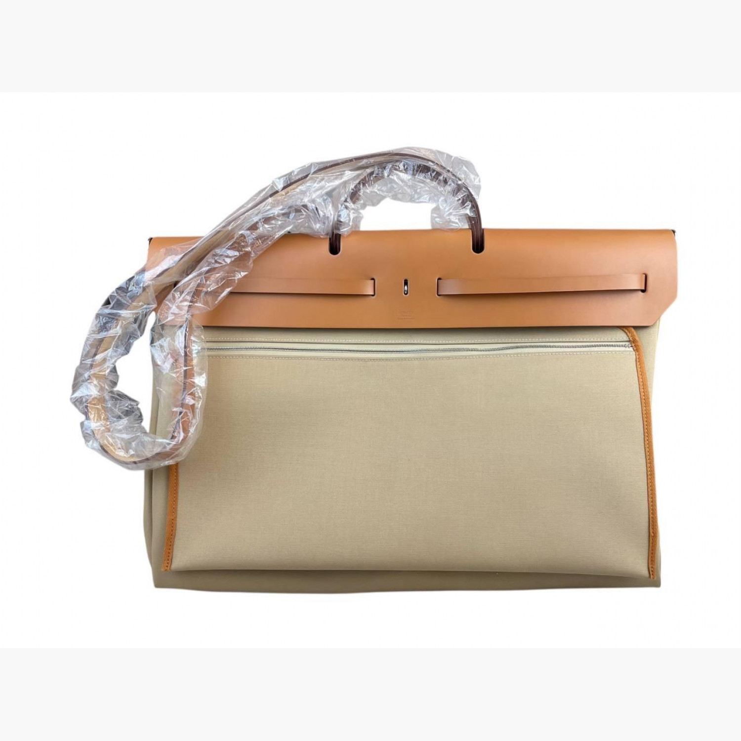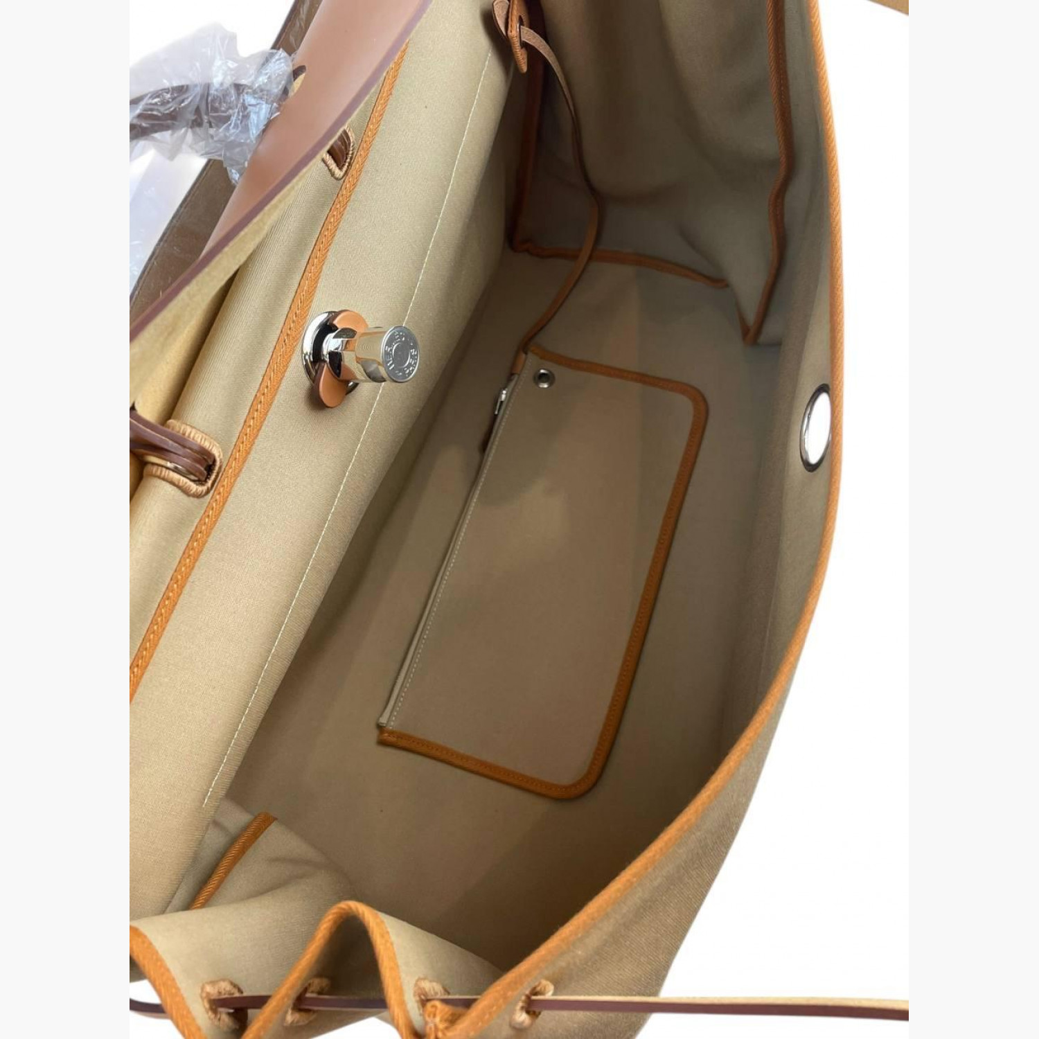 Большая текстильная бежевая сумка с кожаной рыжей крышкой. Внутри одно основное отделение со съёмным карманом на молнии, а также карман на молнии на задней стороне сумки. Абсолютно новая.