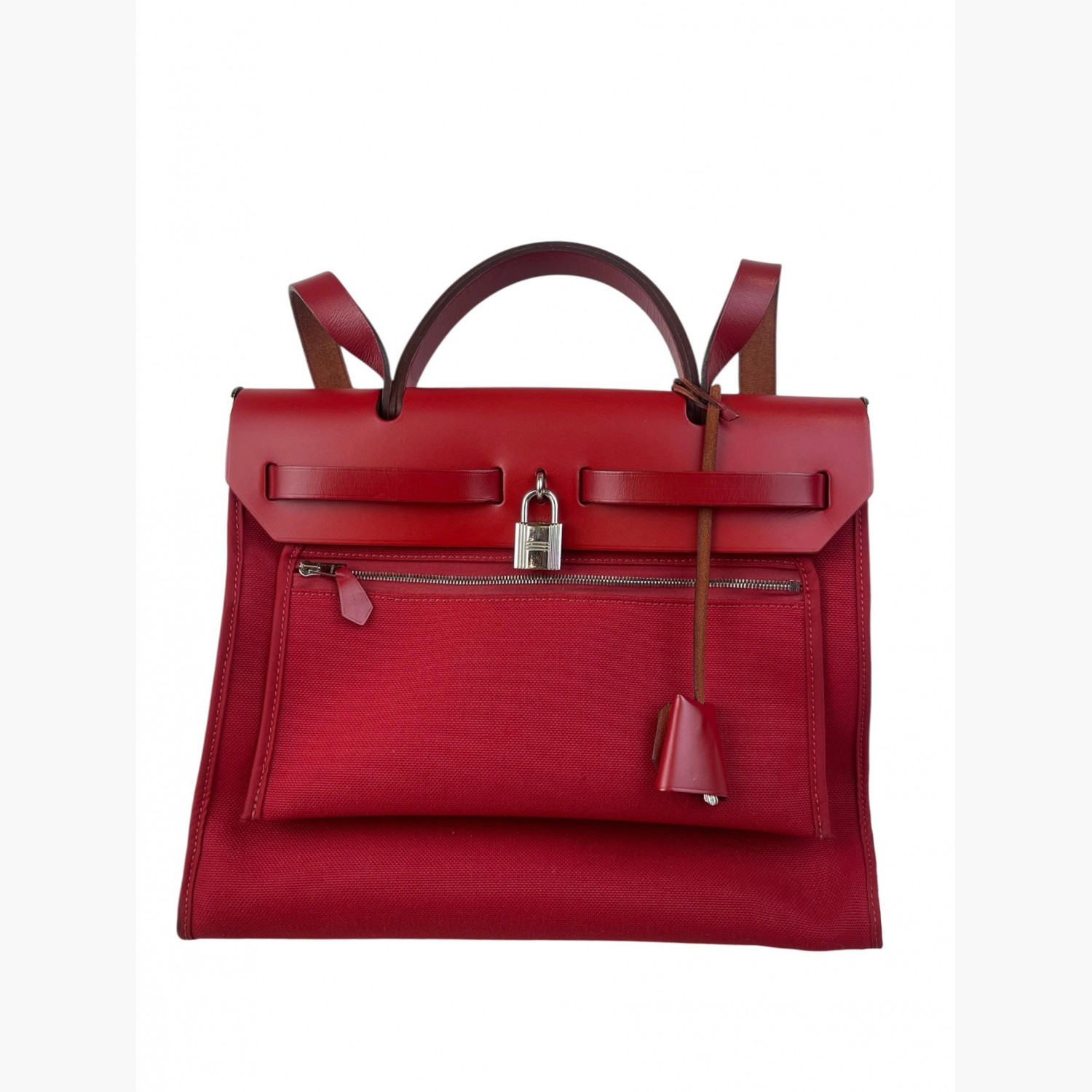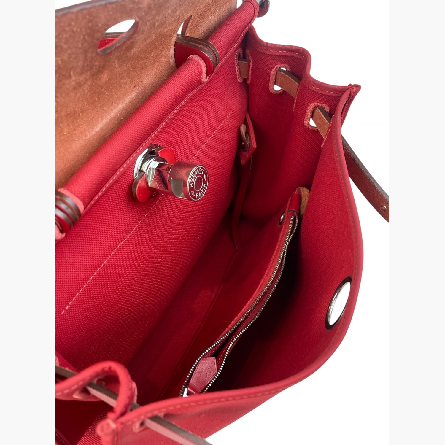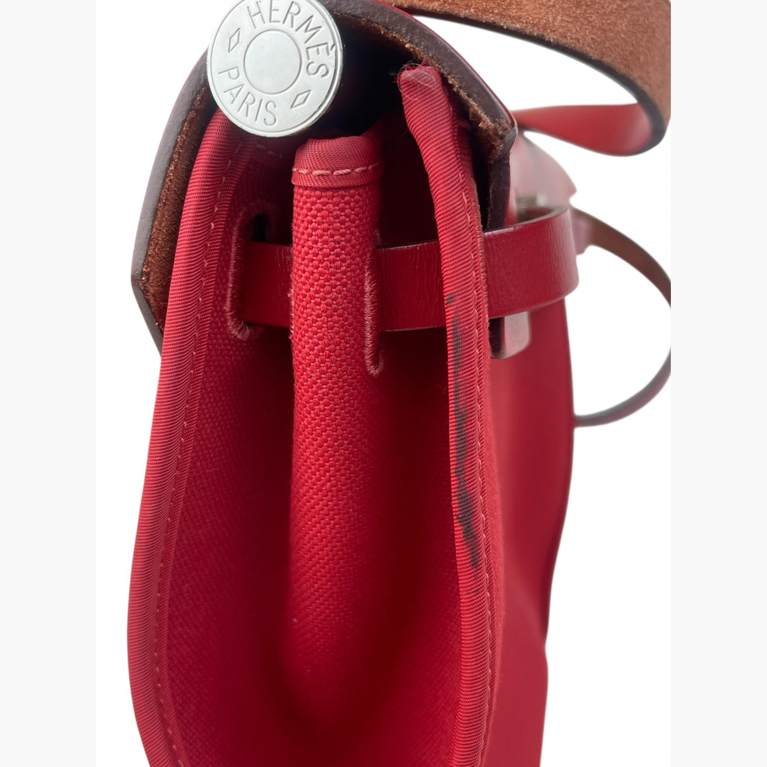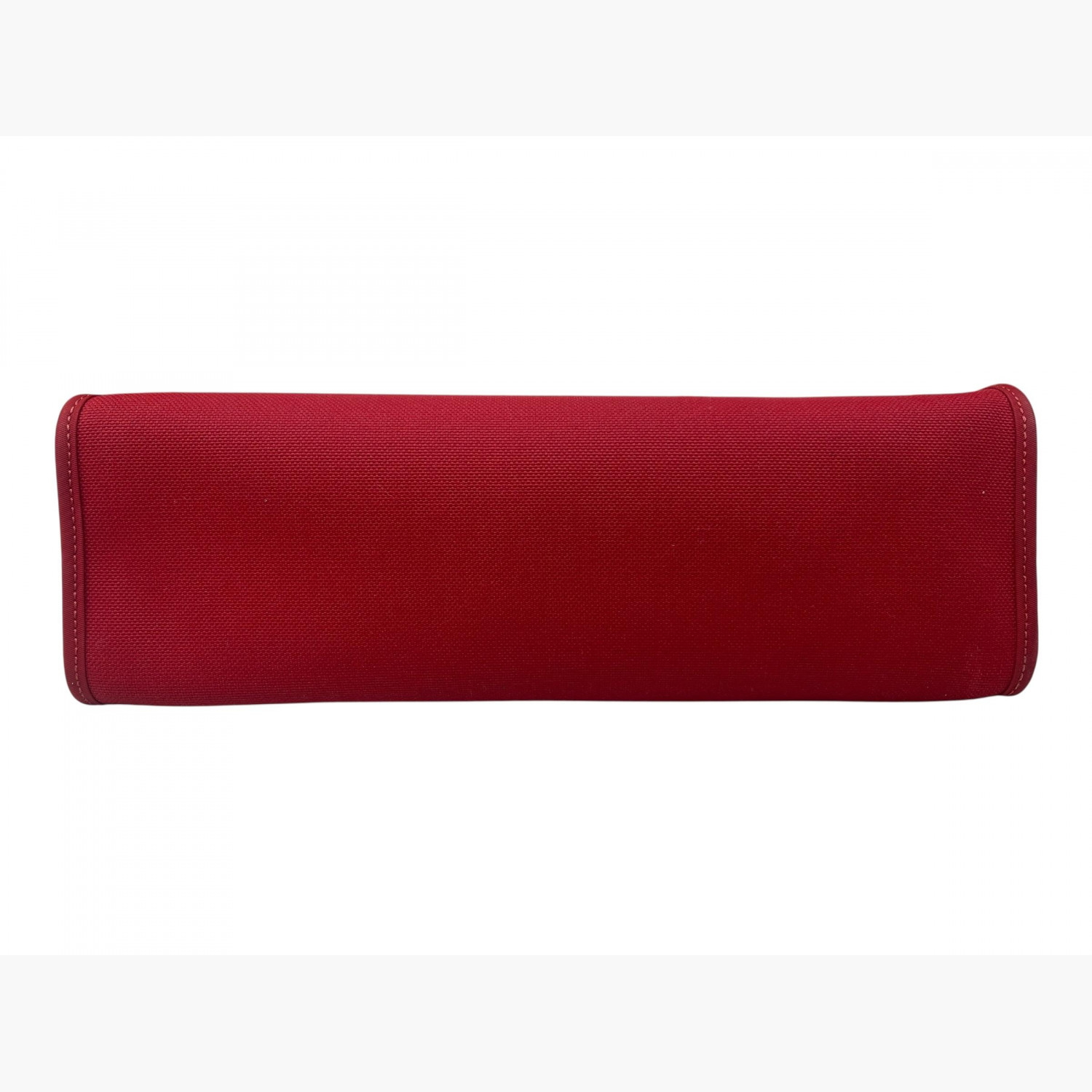 Текстильная красная сумка с кожаной крышкой. Внутри одно основное отделение, съёмный карман на молнии на ремешке, а также с задней стороны сумки расположен карман на молнии. В хорошем состоянии, есть пятна и вмятины.