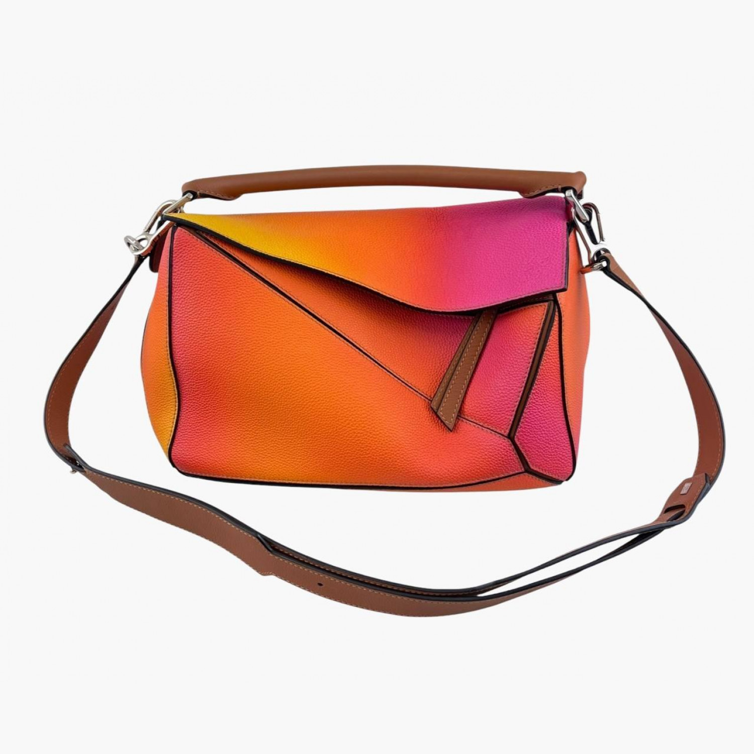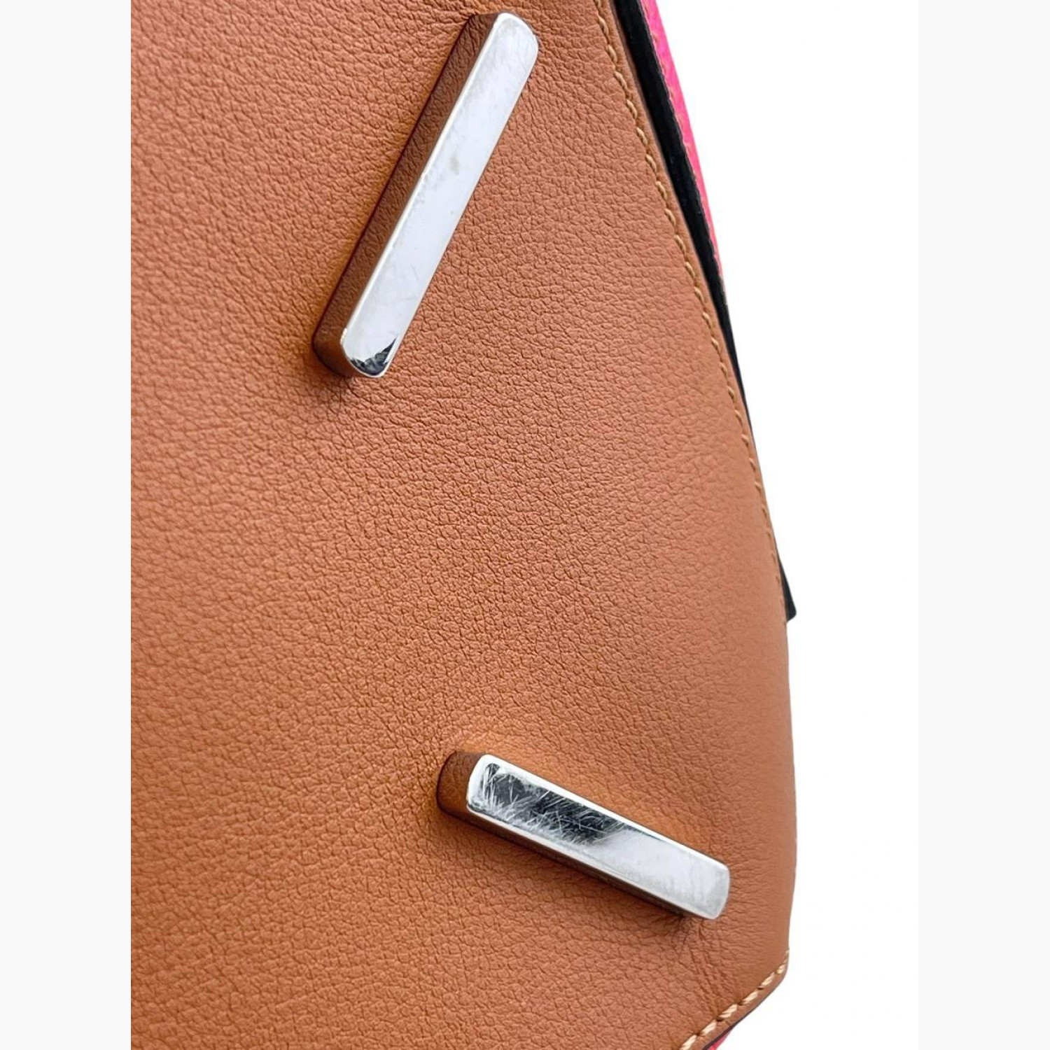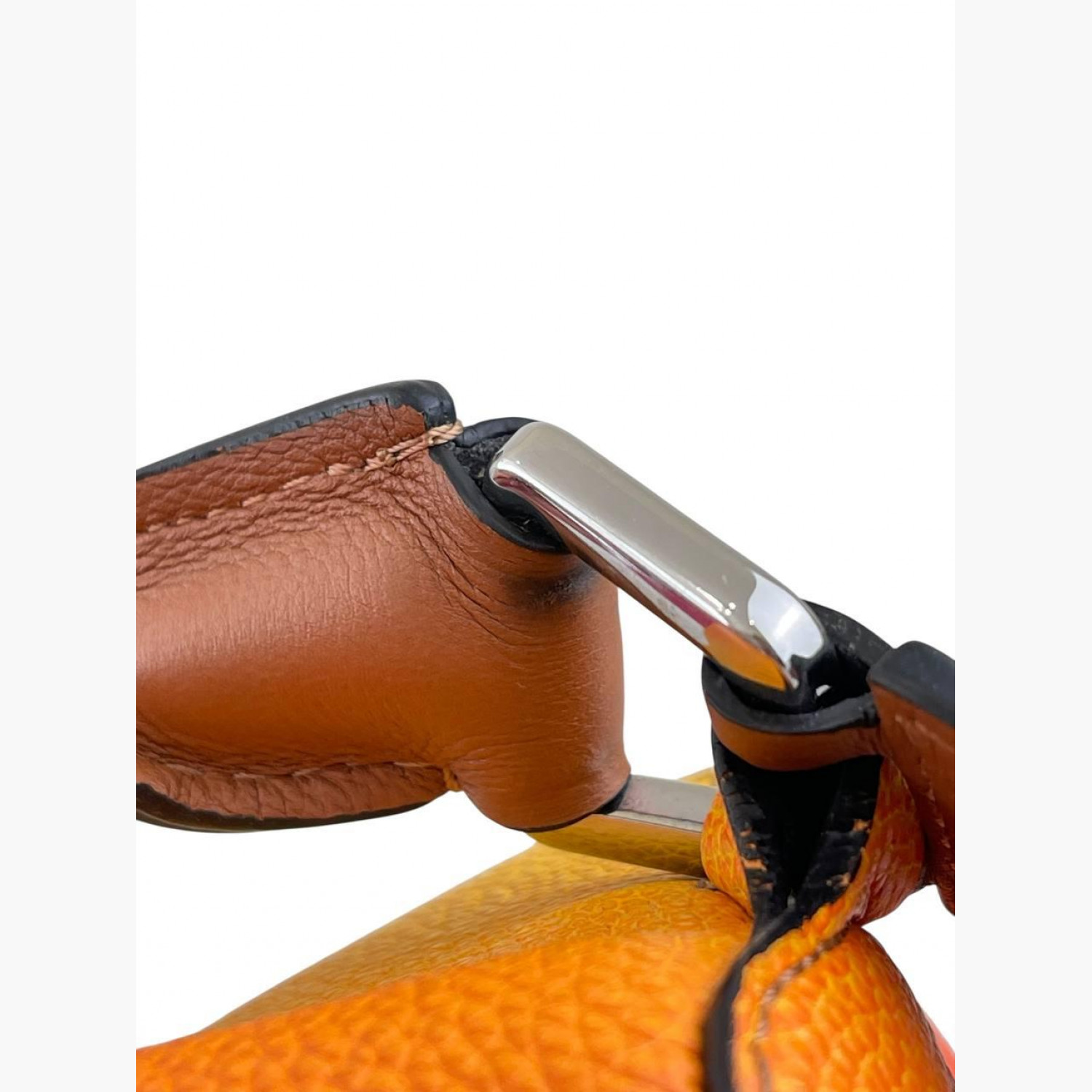 Оранжевая кожаная сумка, в комплекте с длинным ремешком. Внутри одно основное отделение с двумя открытыми карманами и карманом на молнии на задней стороне сумки. В отличном состоянии, есть незначительные следы носки и потертости.