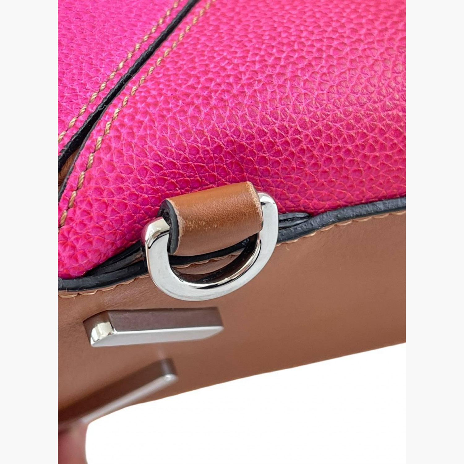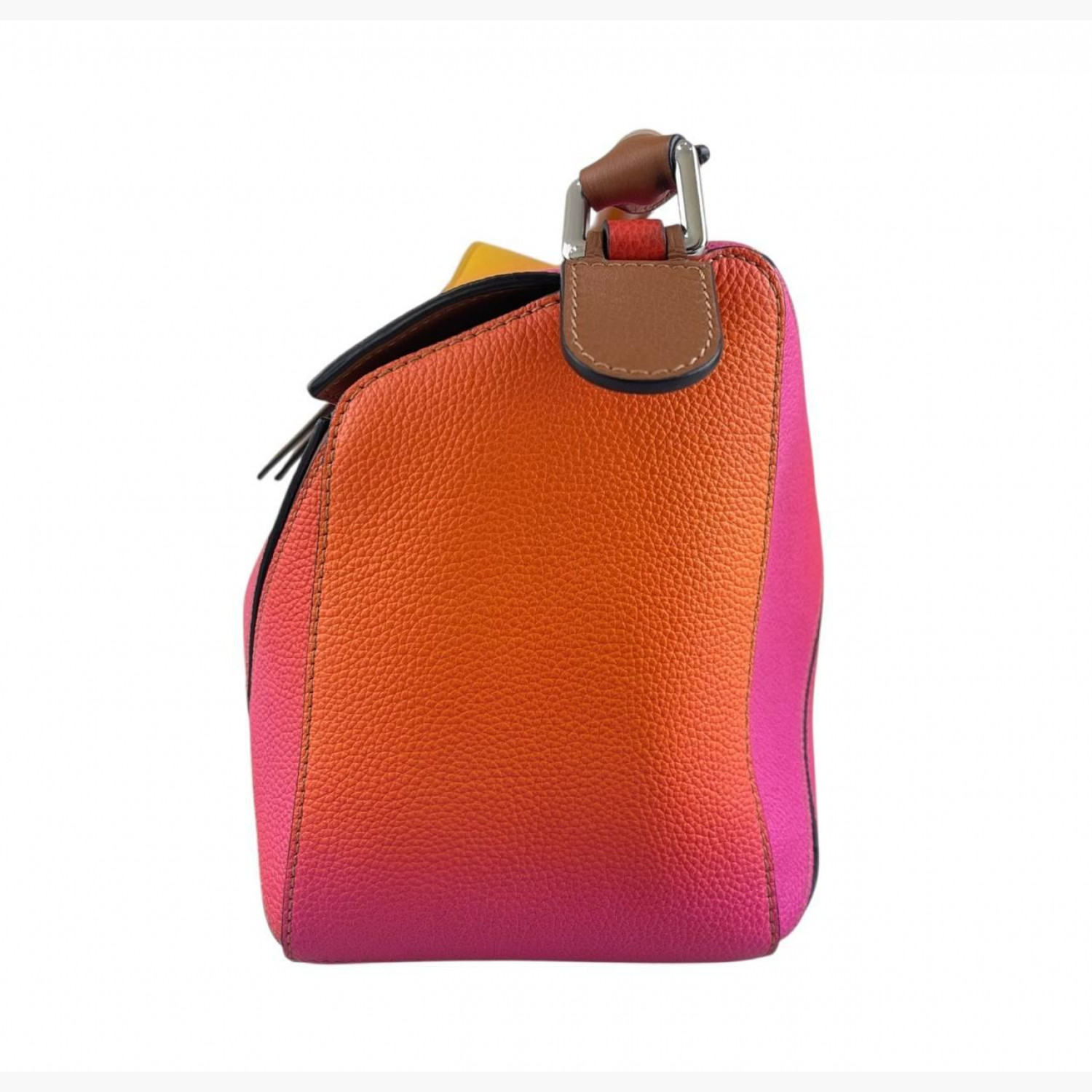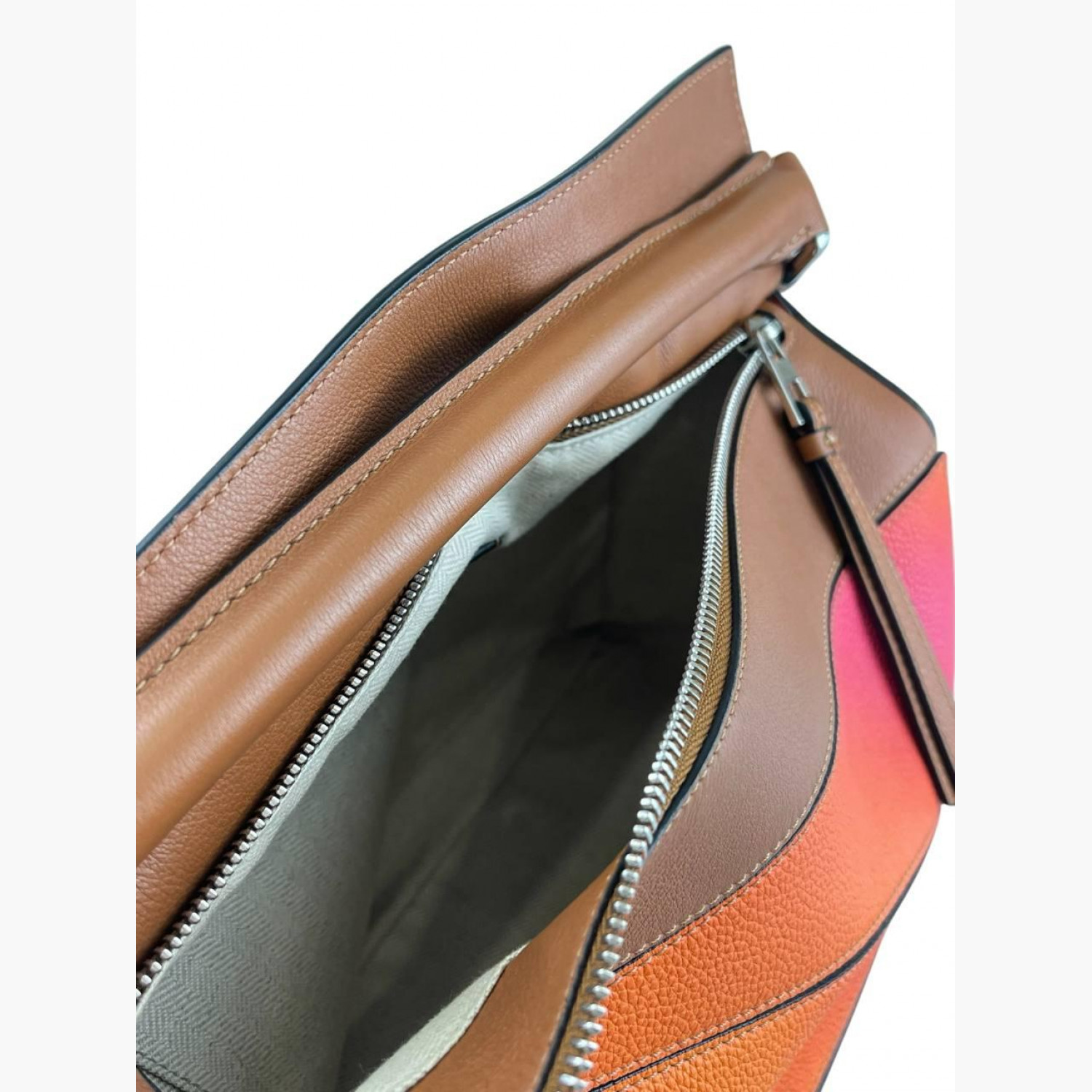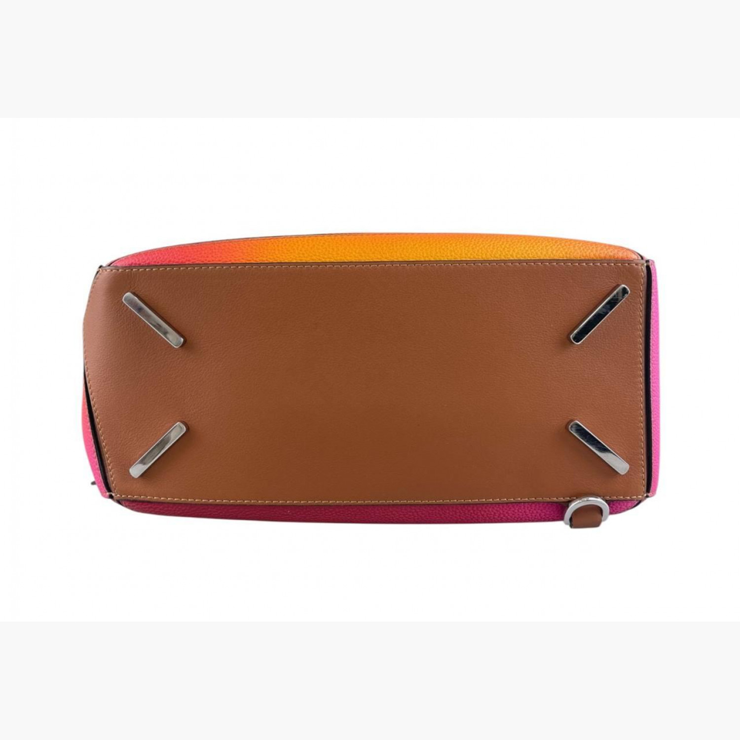 Оранжевая кожаная сумка, в комплекте с длинным ремешком. Внутри одно основное отделение с двумя открытыми карманами и карманом на молнии на задней стороне сумки. В отличном состоянии, есть незначительные следы носки и потертости.