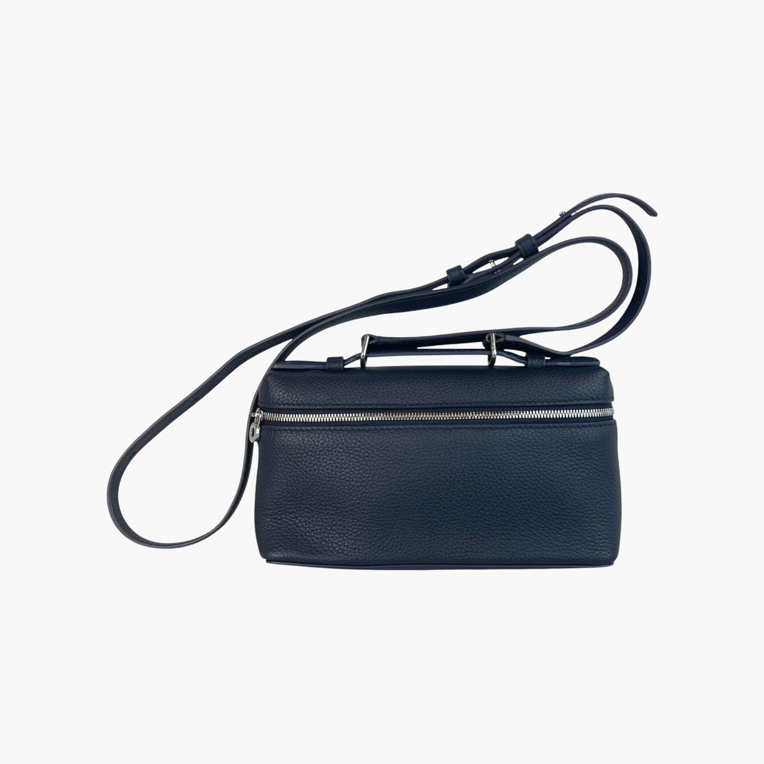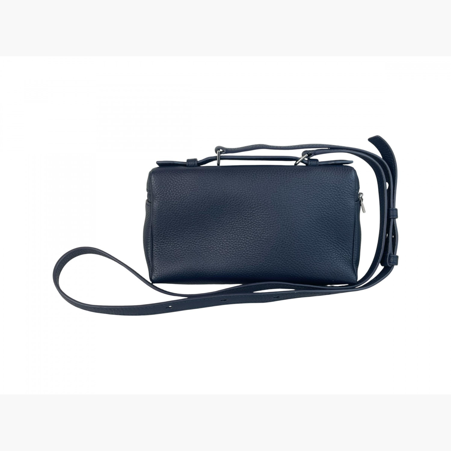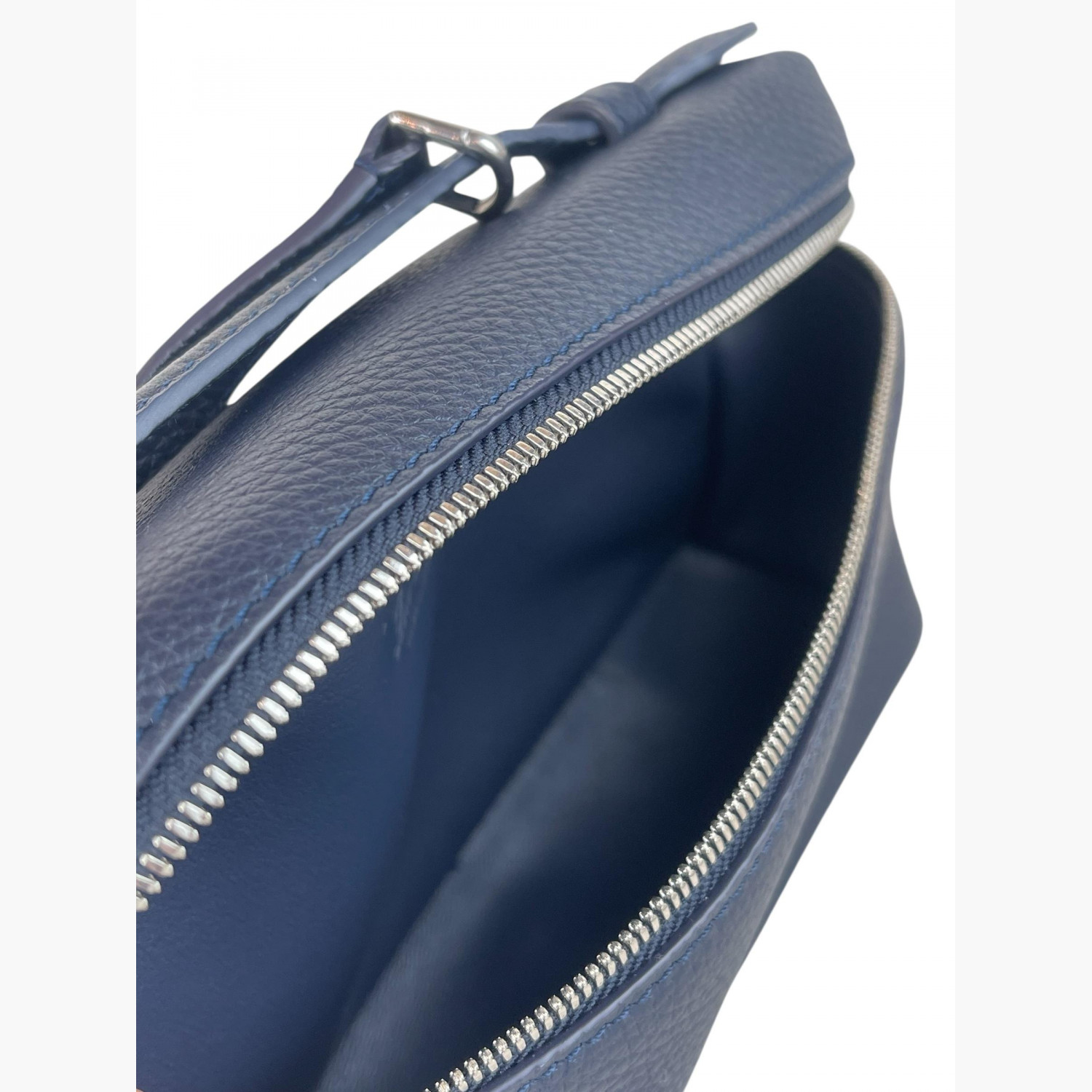 Кожаная тёмно-синяя сумка с длинным регулируемым ремешком. Внутри одно основное отделение, без карманов. В отличном состоянии, есть незначительные следы носки.