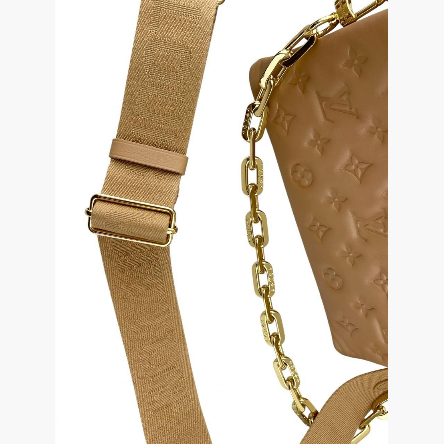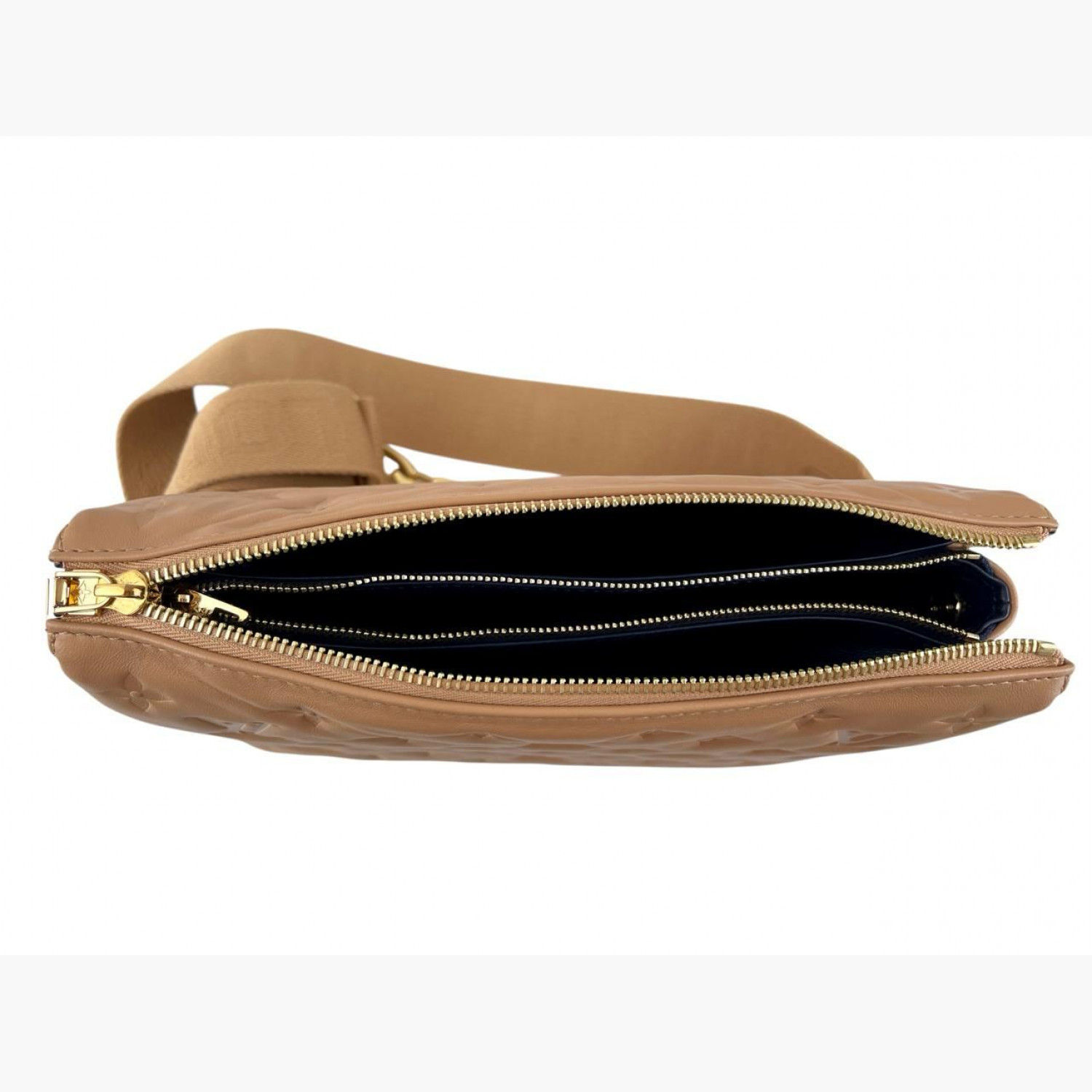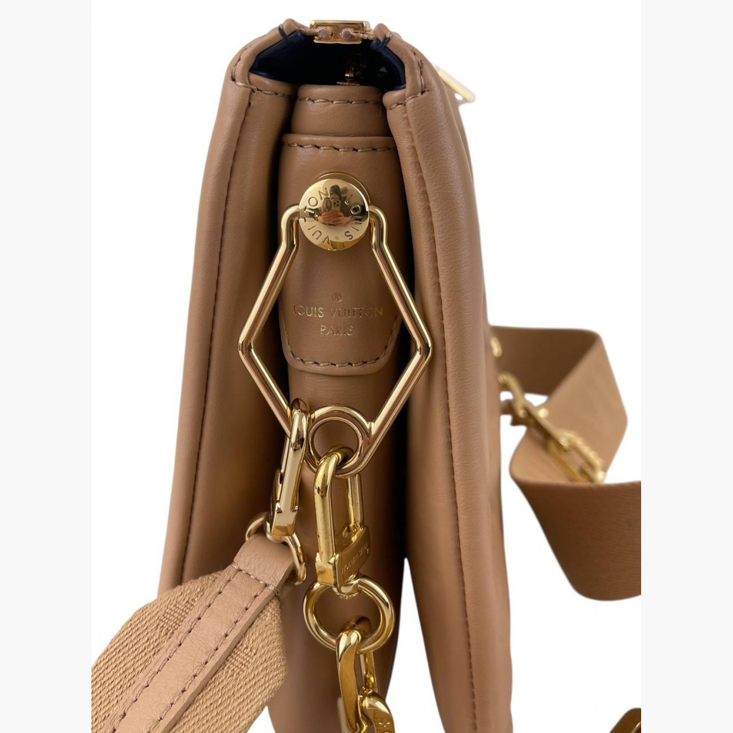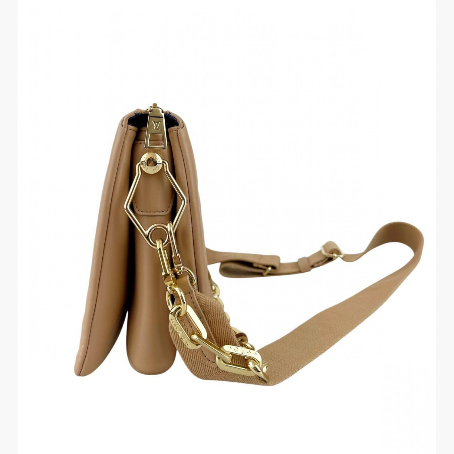 Бежевая кожаная сумка в отличном состоянии. Внутри три основных отделения. Съемный и регулируемый ремень. В комплекте съемная цепочка. Есть незначительные следы носки.