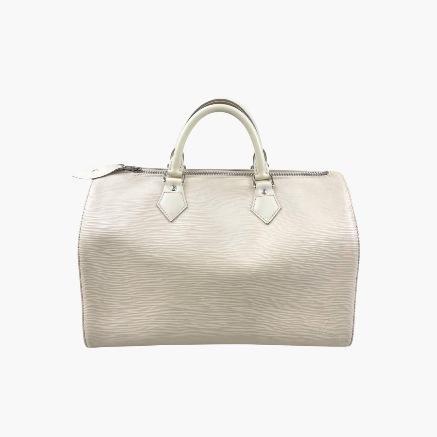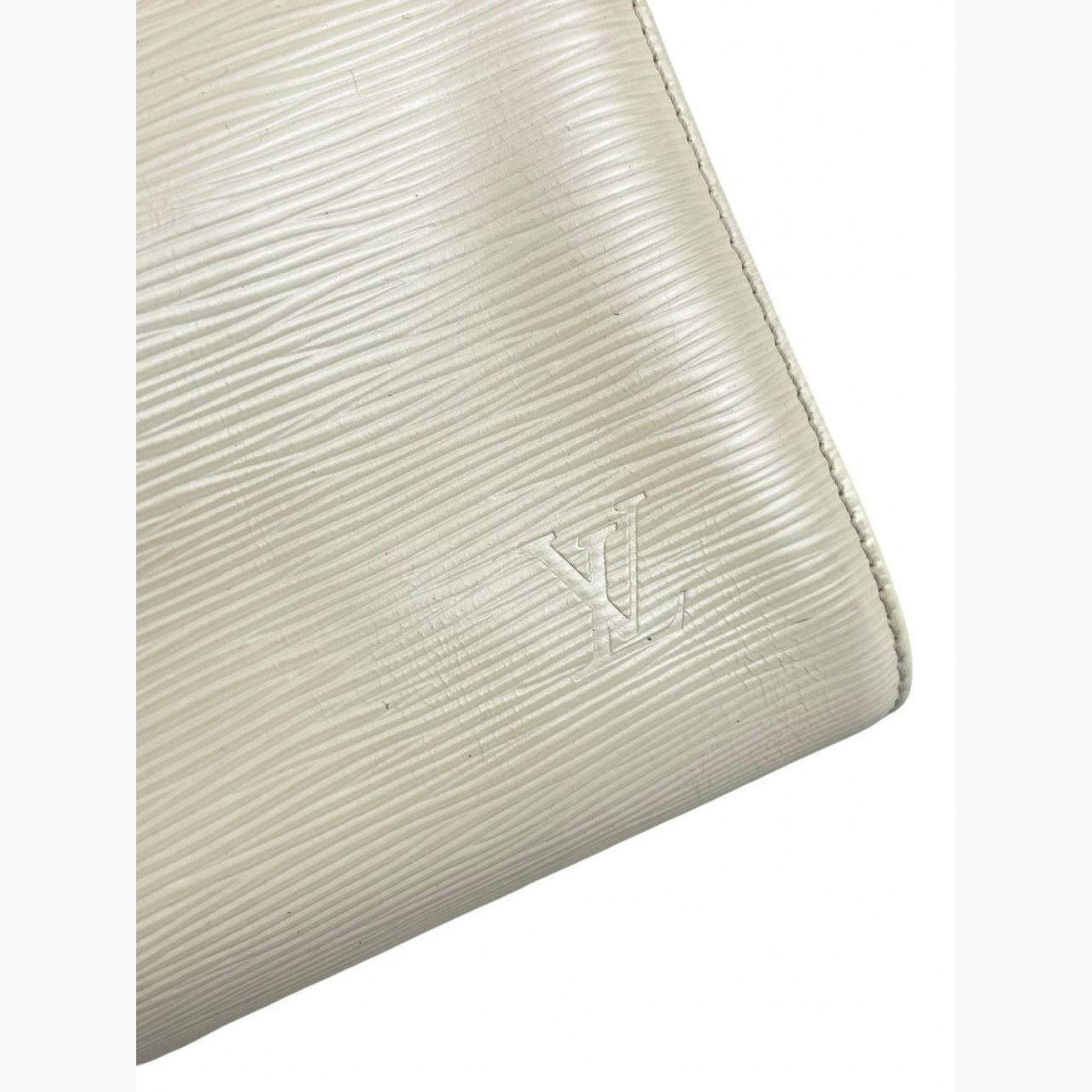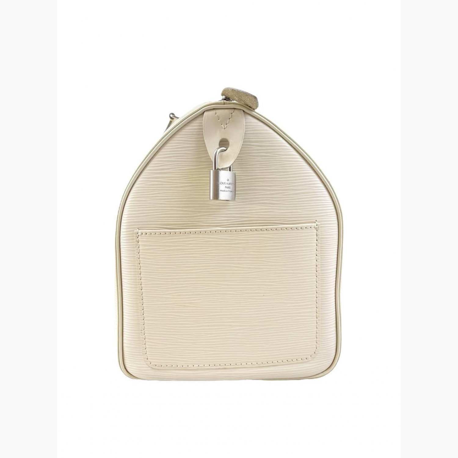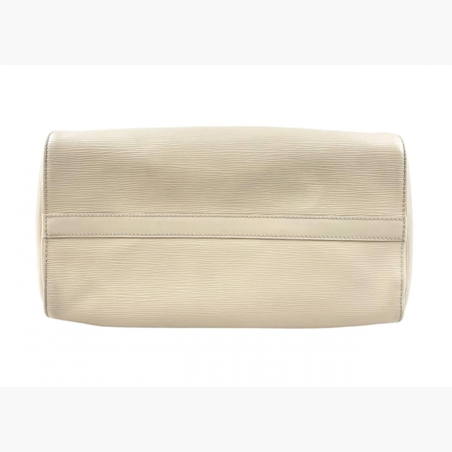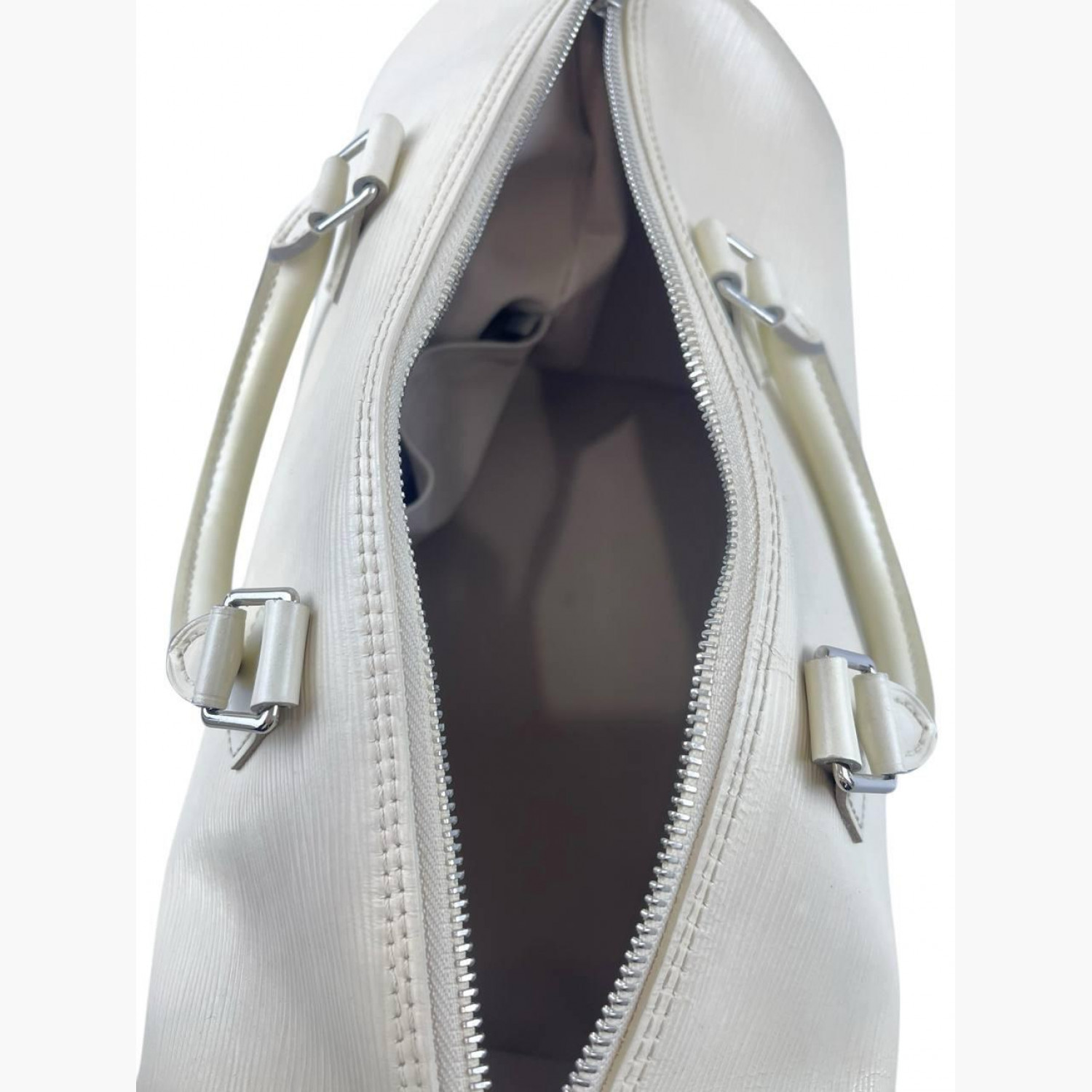 Белая кожаная сумка с замком без ключей. Внутри одно основное отделение с двойным открытым карманом, а также открытый карман сбоку. В хорошем состоянии, есть следы носки.